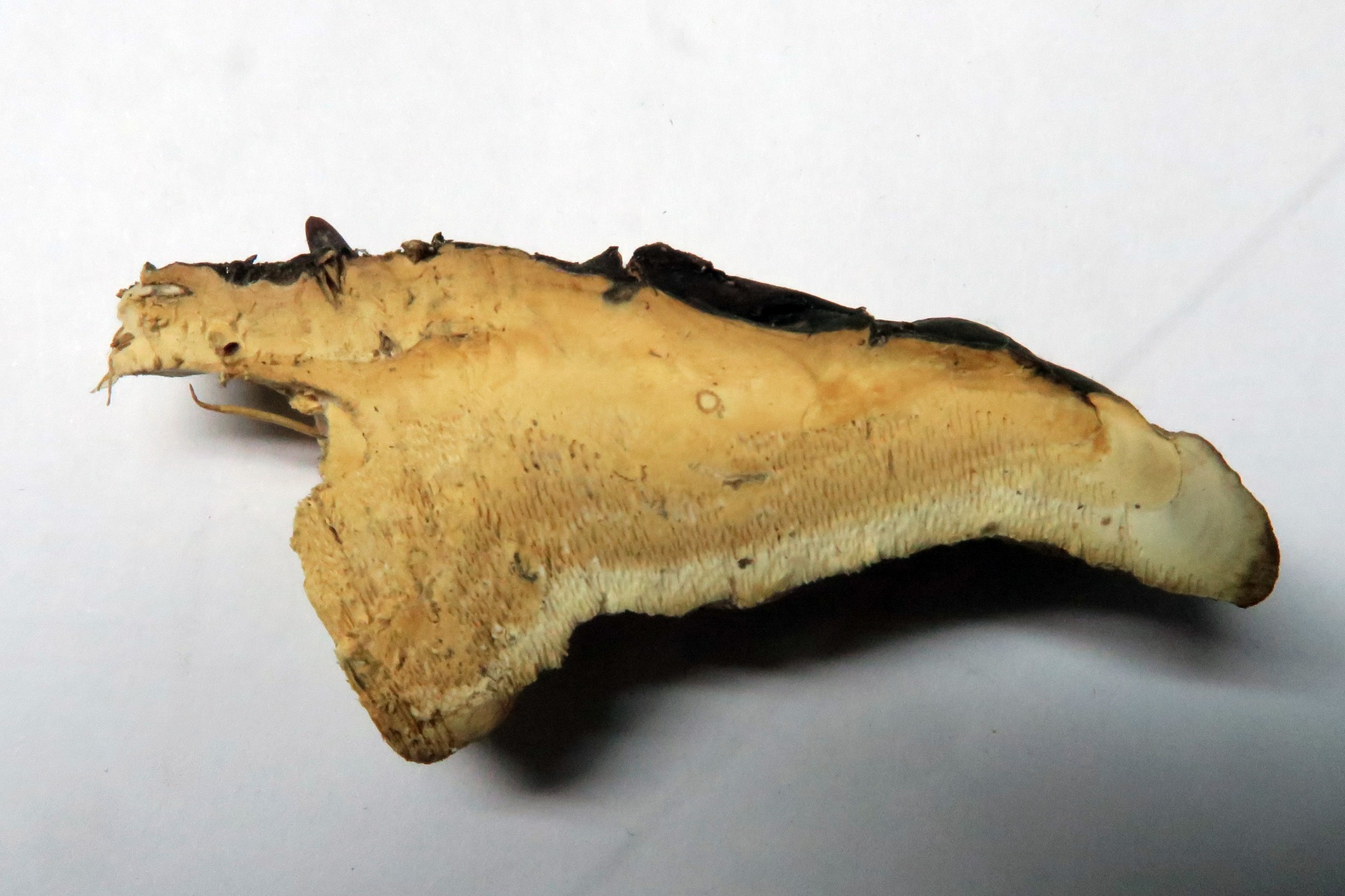 Oscurece en este caso a color crema con una superficie negruzca del sombrero, este color mas acusado al acercarse a la base de unión con el tronco. Tubos concoloros con los poros.