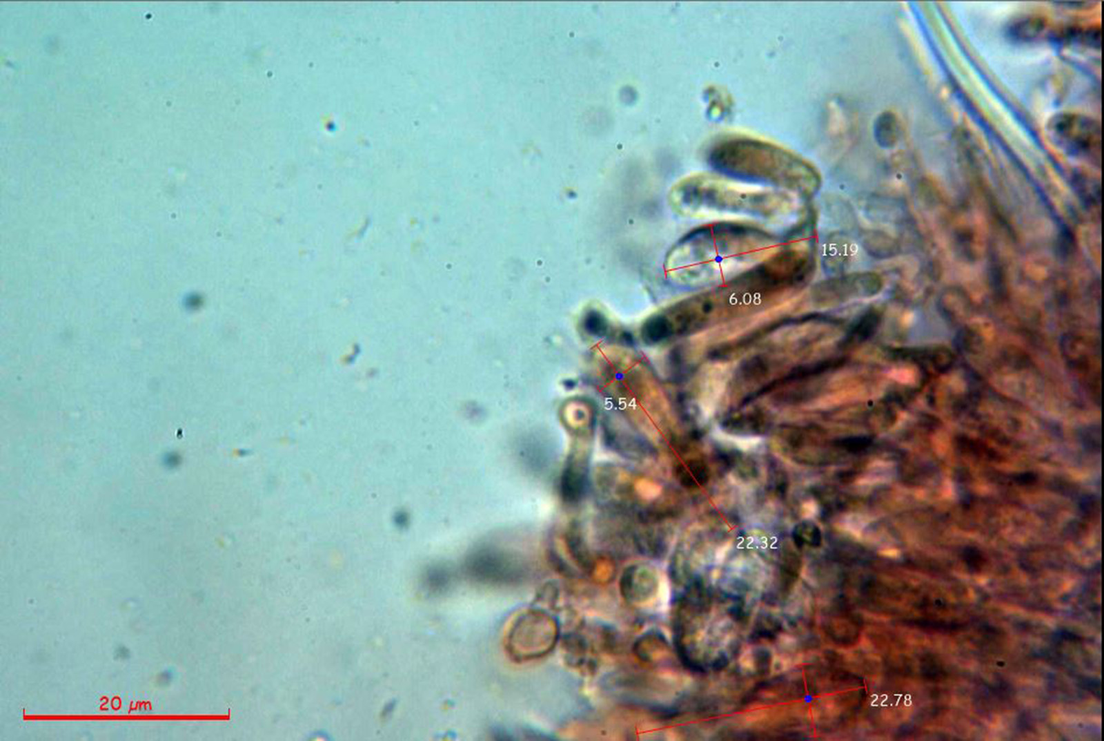 Las medidas de los pocos basidios observados de (15.2) 17.5 - 22.8 (23.1) × (5.4) 5.5 - 6.2 (7.1) µm.