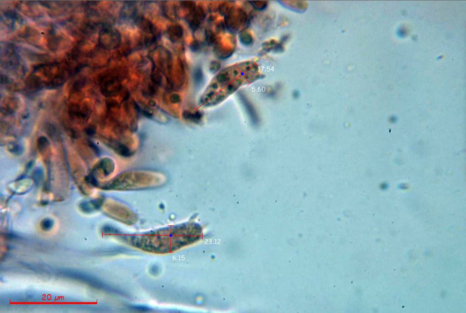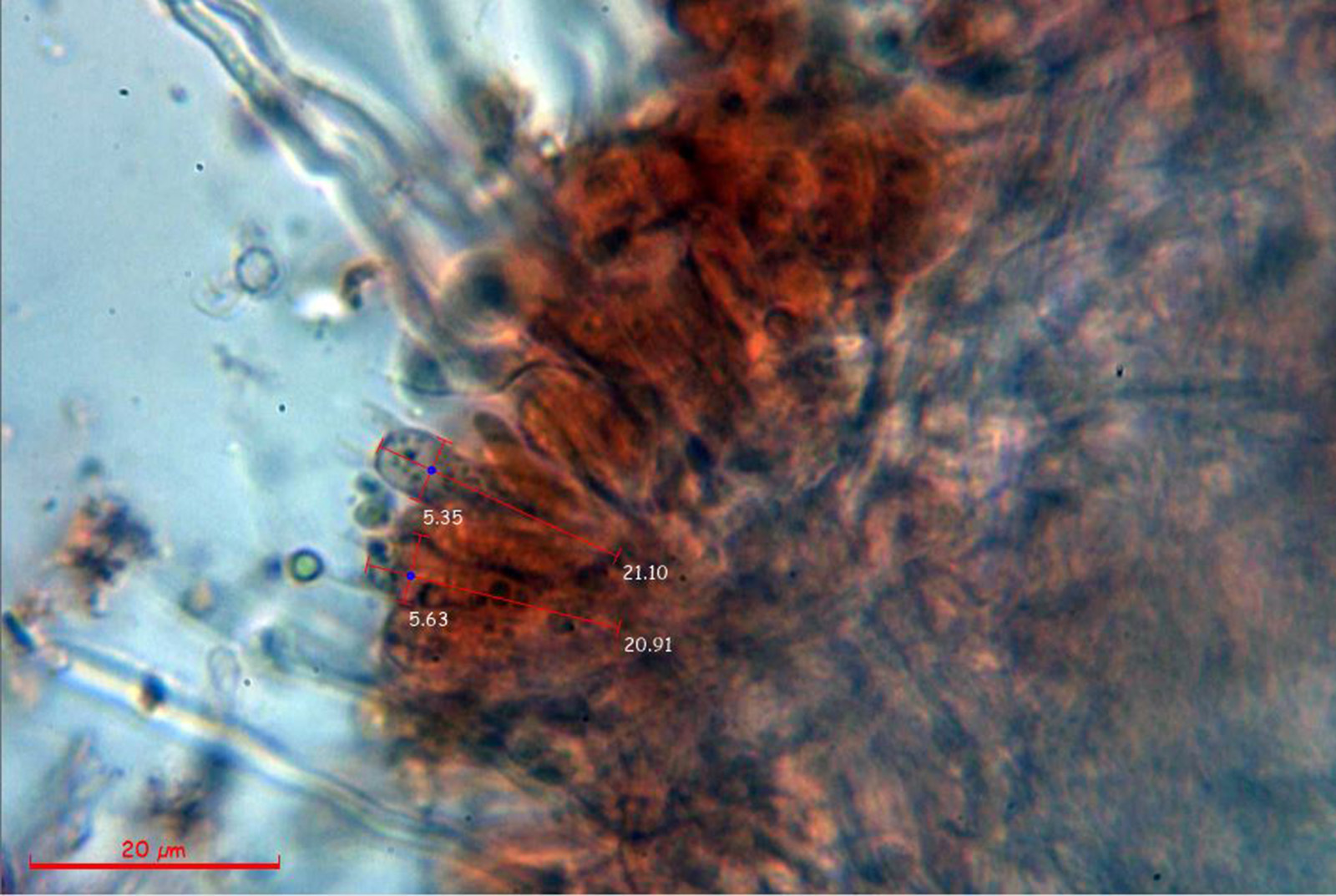 Luego tenemos el elemento de la discordia, según Ryvarden los basidios deberían presentar unas medidas de 17-22 x 8-10 μm, si bien la longitud de los mismos parece encajar con mis resultados ya no su anchura que en mi estudio en ninguno de los casos superaba apenas las 7 μm., aquí tenemos o una de dos o estos basidios presentan una gran variabilidad en cuanto a medidas, o hay algun dato equivocado. La `poca bibliografía que he podido consultar de la misma arroja el mismo resultado que las medidas de Ryvarden, doy por sentado que ni se molestaron en estudiarla y copiaron exactamente los datos, dejo un enlace de MycoDB (uno de los pocos que he podido encontrar).