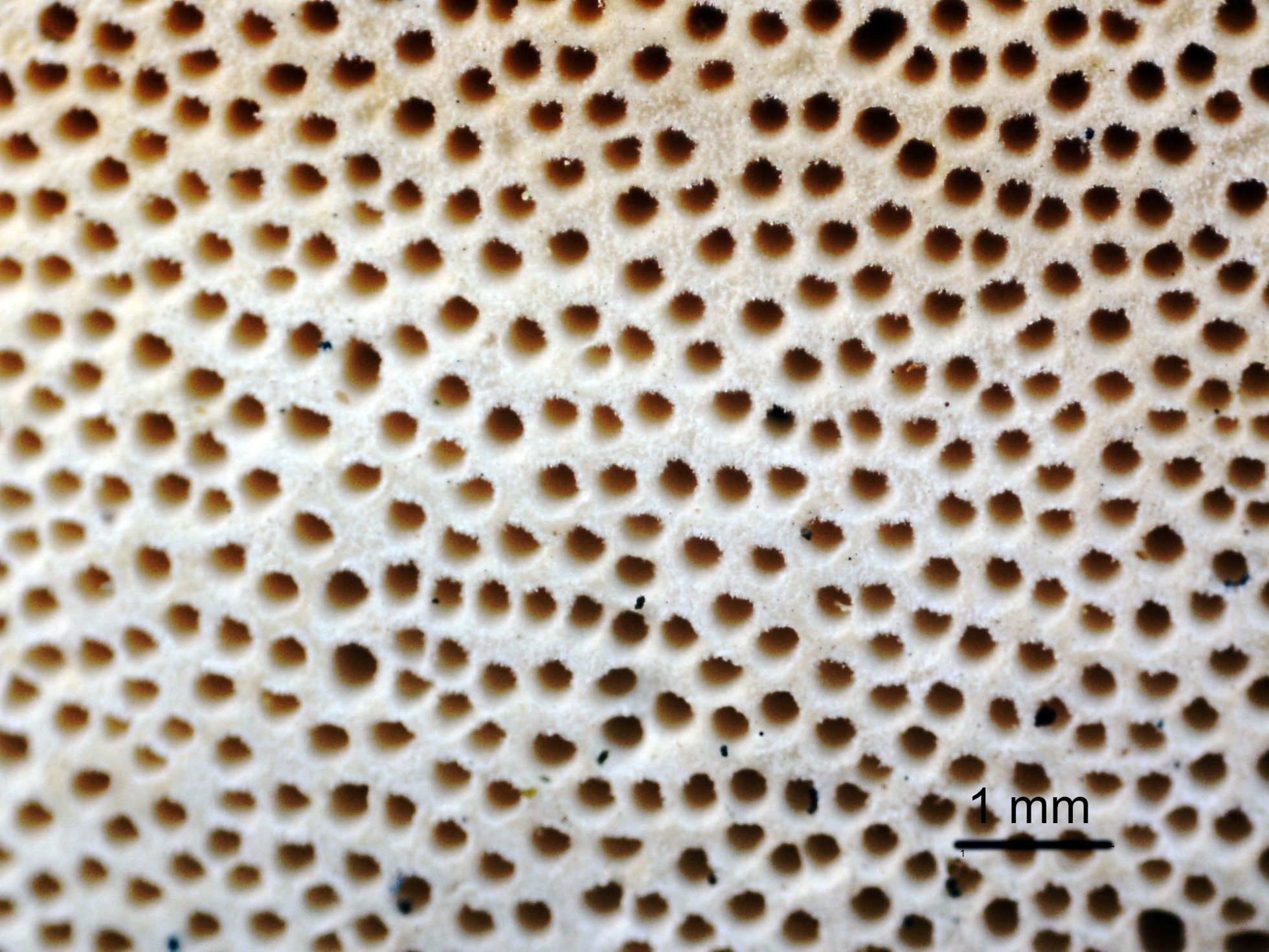 Poros de color entre blanco y crema pálido, entre redondeados y angulares, pequeños (de entre 3 a 4 poros por mm.)