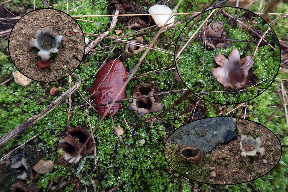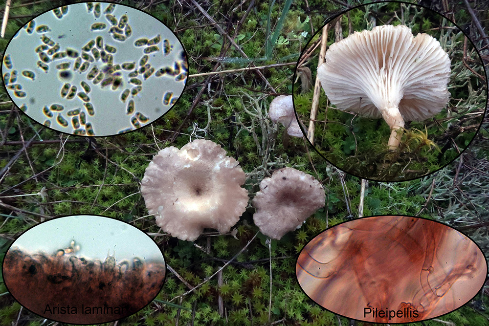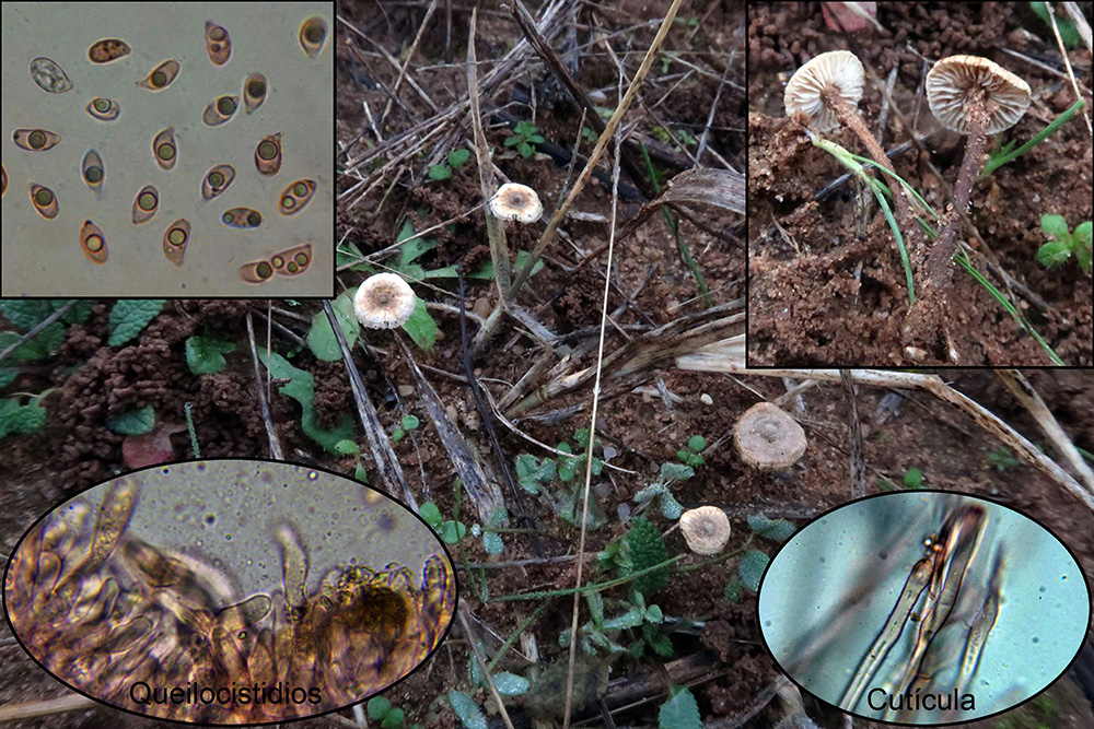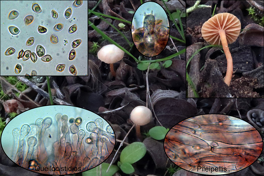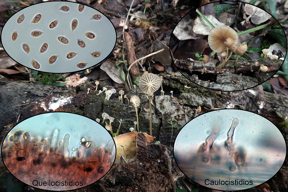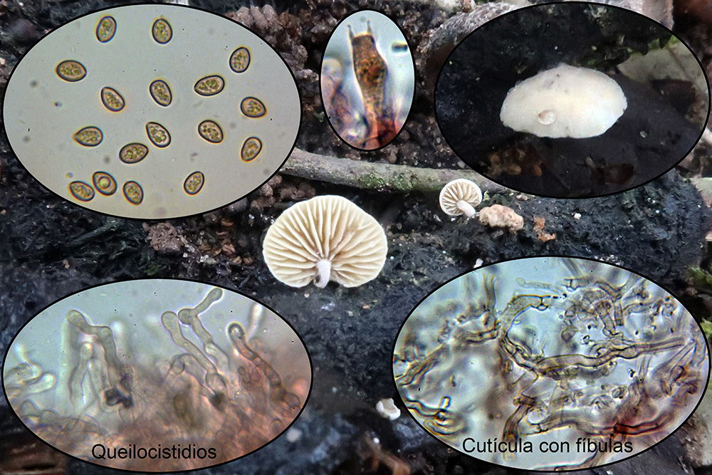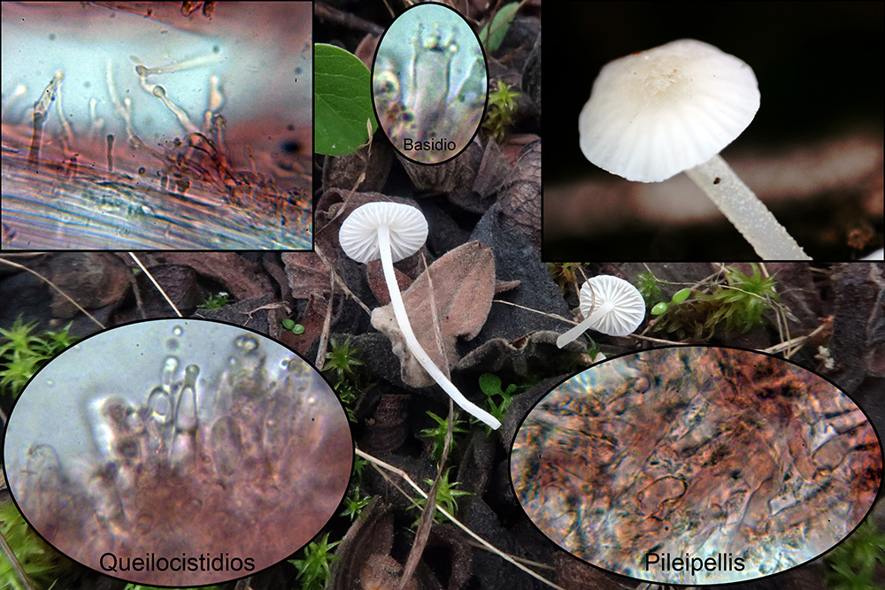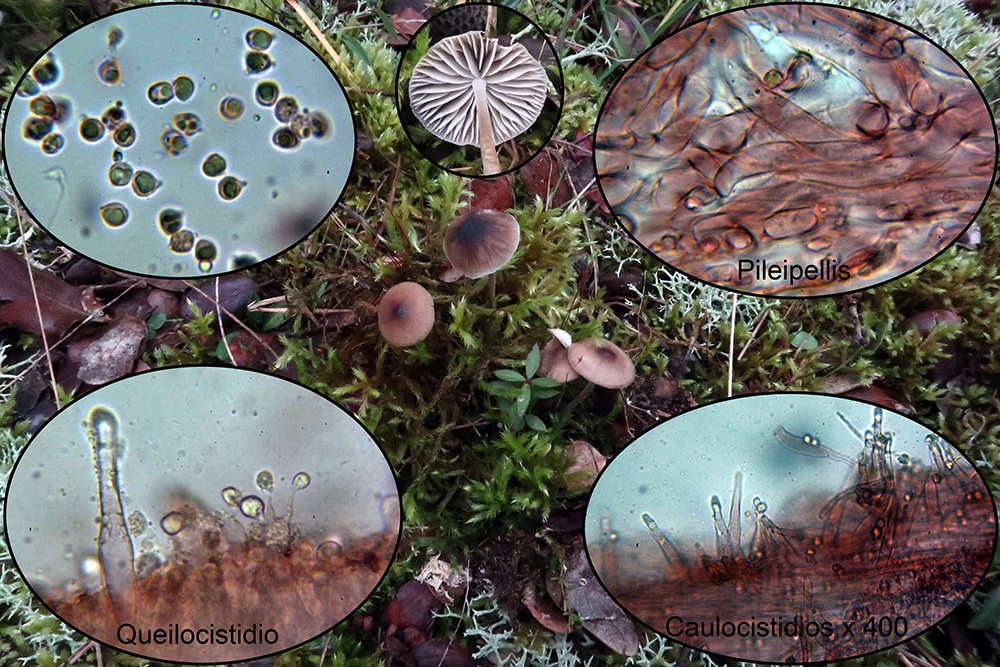 Bajo Cistus una muy curiosa y extraña Hemimycena, la Hemimycena conidiógena, con caulocistidios y además hifas conidiógenas en el pié (miniatura superior izquierda).