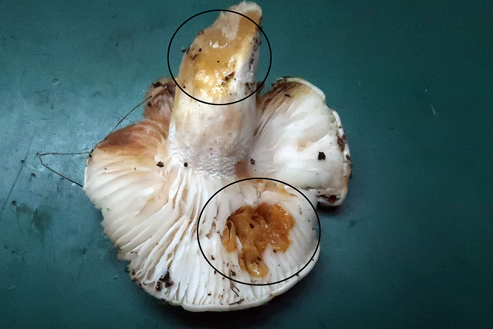 Hygrophorus cossus con KOH al 20% a los 15 minutos con clara reacción tanto en el pié como en las láminas.