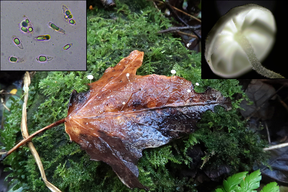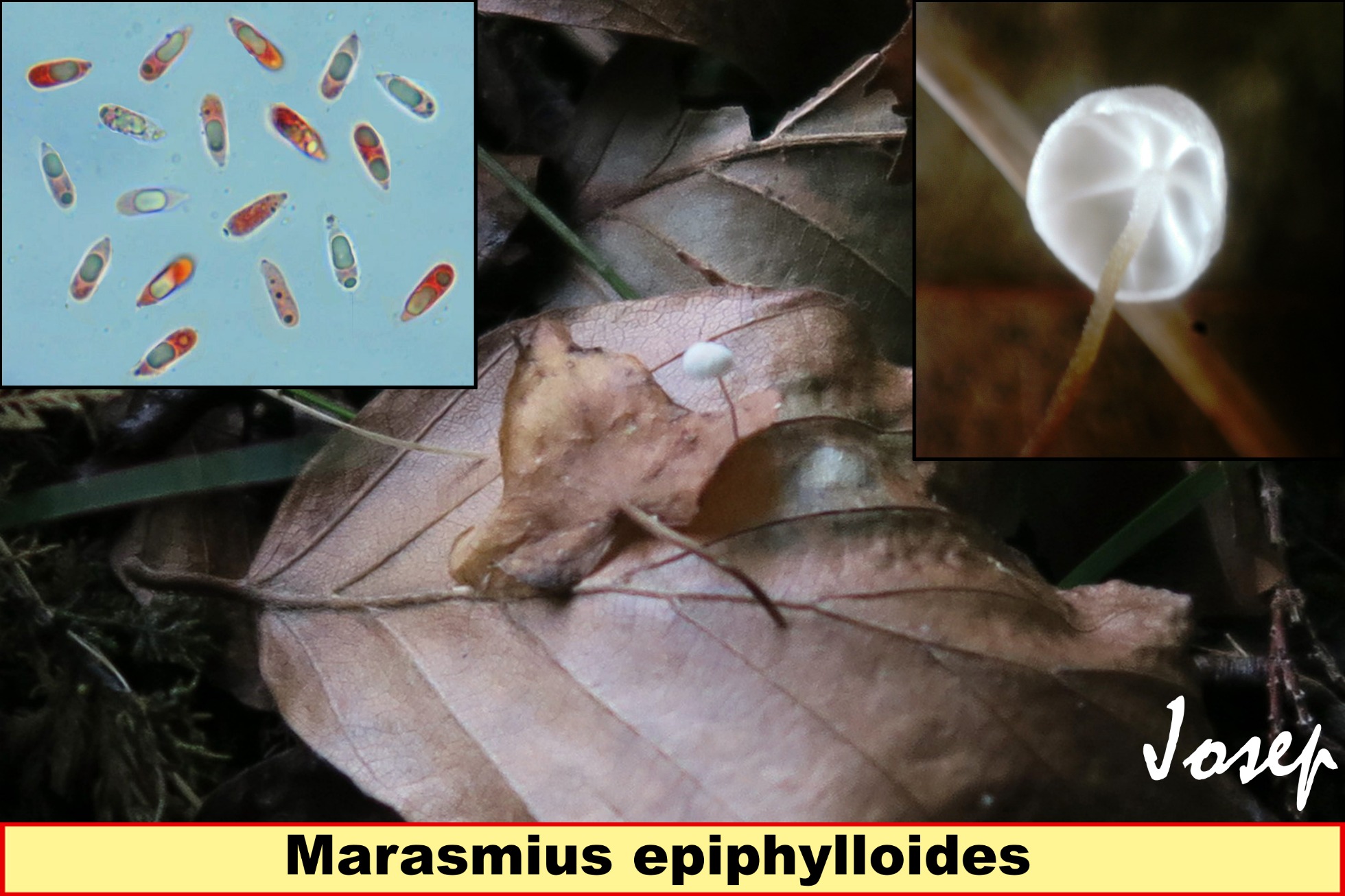 Gracias Koldobika, con el Entoloma deconocía por completo la existencia del Entoloma fuscohebes, no figura en las claves de Noordelos y tampoco he podido encontrar ninguna otra información del mismo en la red, como tengo fe ciega en ti, lo dejaré pues como Entoloma fuscohebes, en cuanto al Marasmiellus ya digo en todo momento que no me cuadran muchas cosas de su microscopía, es que la hoja me parece de hiedra y no he encontrado ninguna otra opción que encaje mejor ¿Alguna sugerencia?, dejo un par de imágenes mías de estudios anteriores del Marasmius epiphylloides con sus características micro. En mis estudios anteriores las esporas midieron 9,6 (10,5;11,3) 12,1 X 3,2 (3,4;4) 4,2 µm.