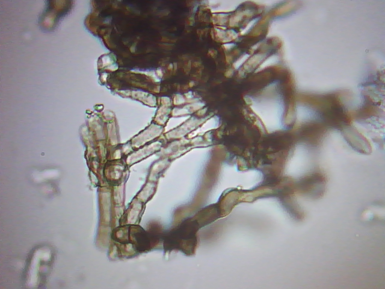 Cogemos un trozito de esta piel que envuelve los ajos (cuanto mas negro mas conidios veremos) y lo colocamos en el portaobjetos, añadimos unas tres gotas de agua del grifo, y con algún objeto punzante trataremos que las gotas del porta se impregnen de conidios (haremos como si laváramos el trozito de piel) dejando solo el contenido de una gota de esta agua sin restos de piel y colocamos el cubre objetos.