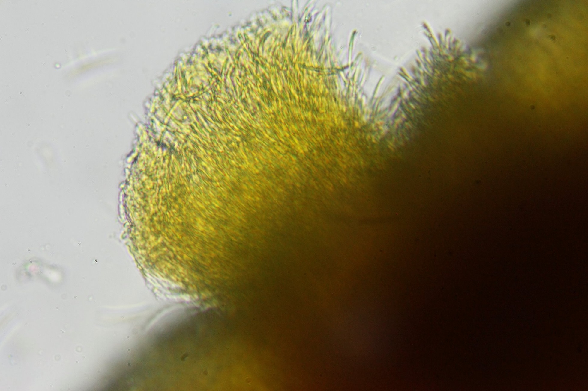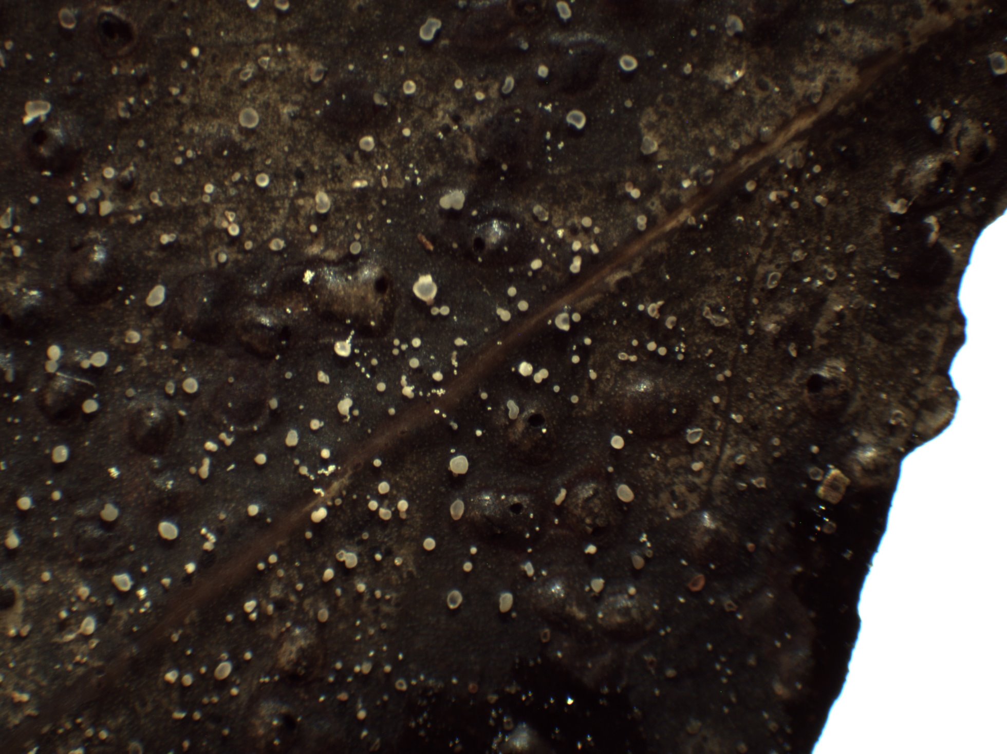 Sobre una hoja de eucalipto, se observan unos diminutos puntitos blancos, con 20x parecen ser alguna ascospora de forma de vaso. Una observación mas detallada da como resultado que no es ningún hongo diminuto sino mas bien un aglomerado de esporas mucilaginosas (acervulo) que en contacto con el agua se sueltan unas a otras de manera exponencial desaciendose el conglomerado mucilaginoso y quedando dispersas las conidias, observando lo que podría haber sido un estípite rudimentario, me doy cuenta de que salen de la misma hoja por un pequeño ostiolo por lo que deduzco que podría tratarse de alguna roña. Efectivamente, cortando la hoja en sentido transversal, se ven claramente una especie de vejigas en las que se forman las esporas y que cuando acumula suficiente cantidad revienta a modo de un volcán.