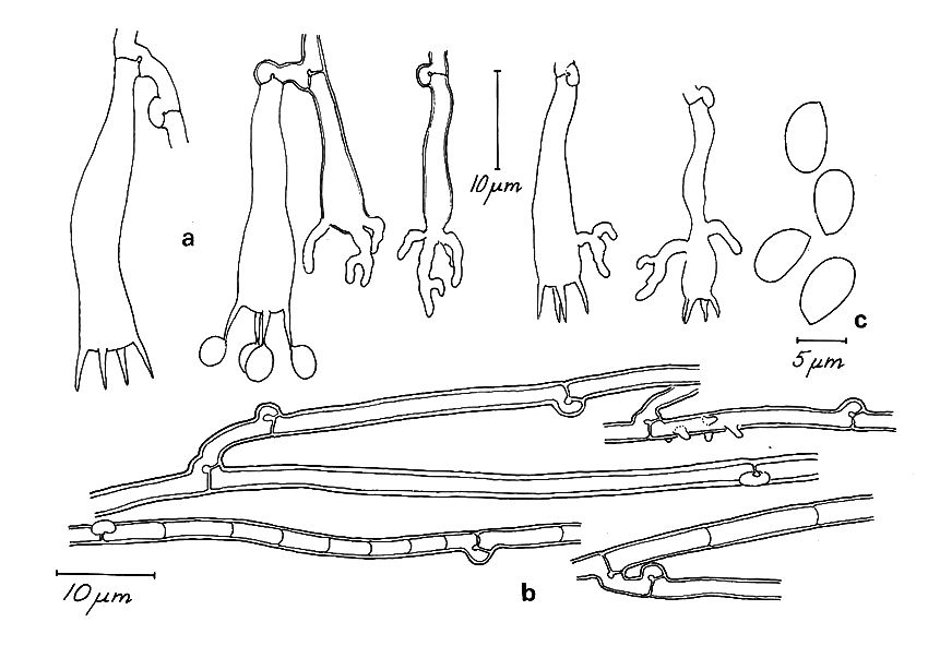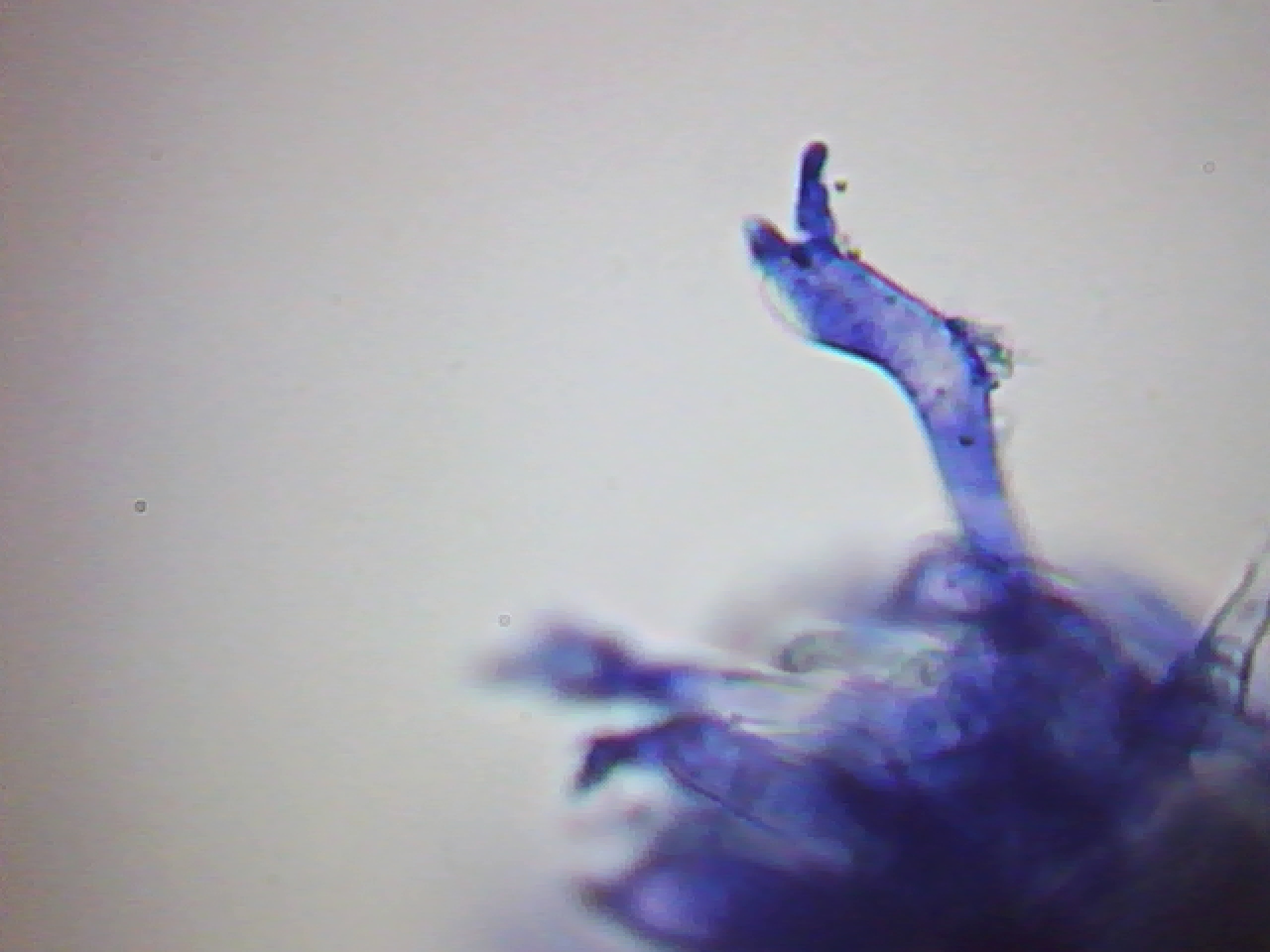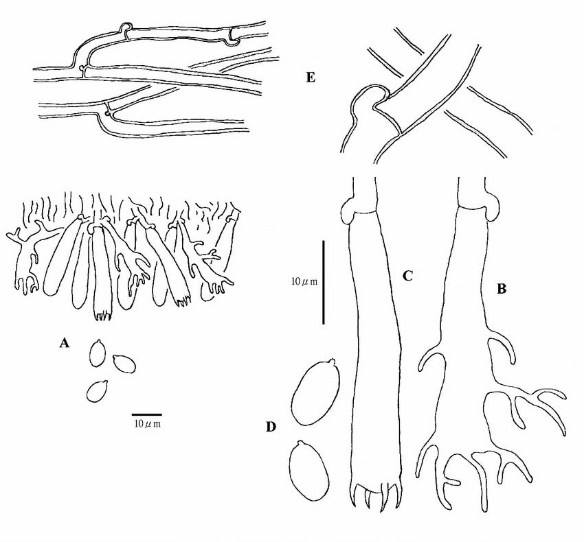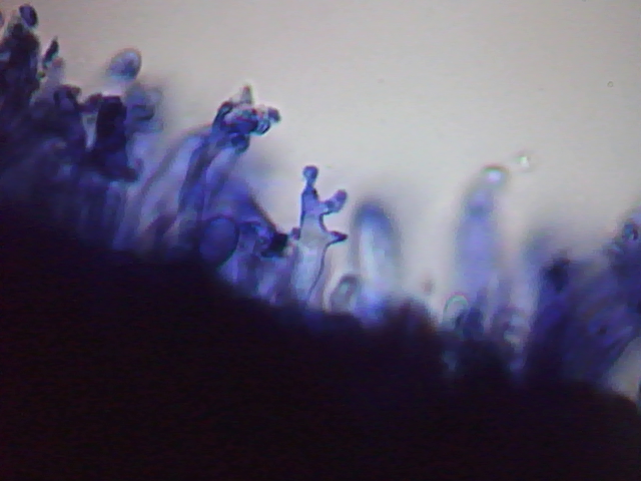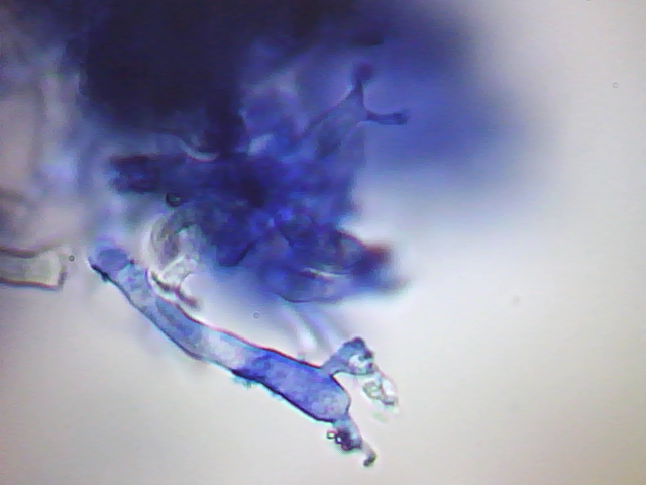 Ahora os muestro una foto bajada de internet donde podemos comparar con mi microscopía sus curiosos basidios y cistidios, en este caso no he utilizado ningún colorante, solo agua del grifo.