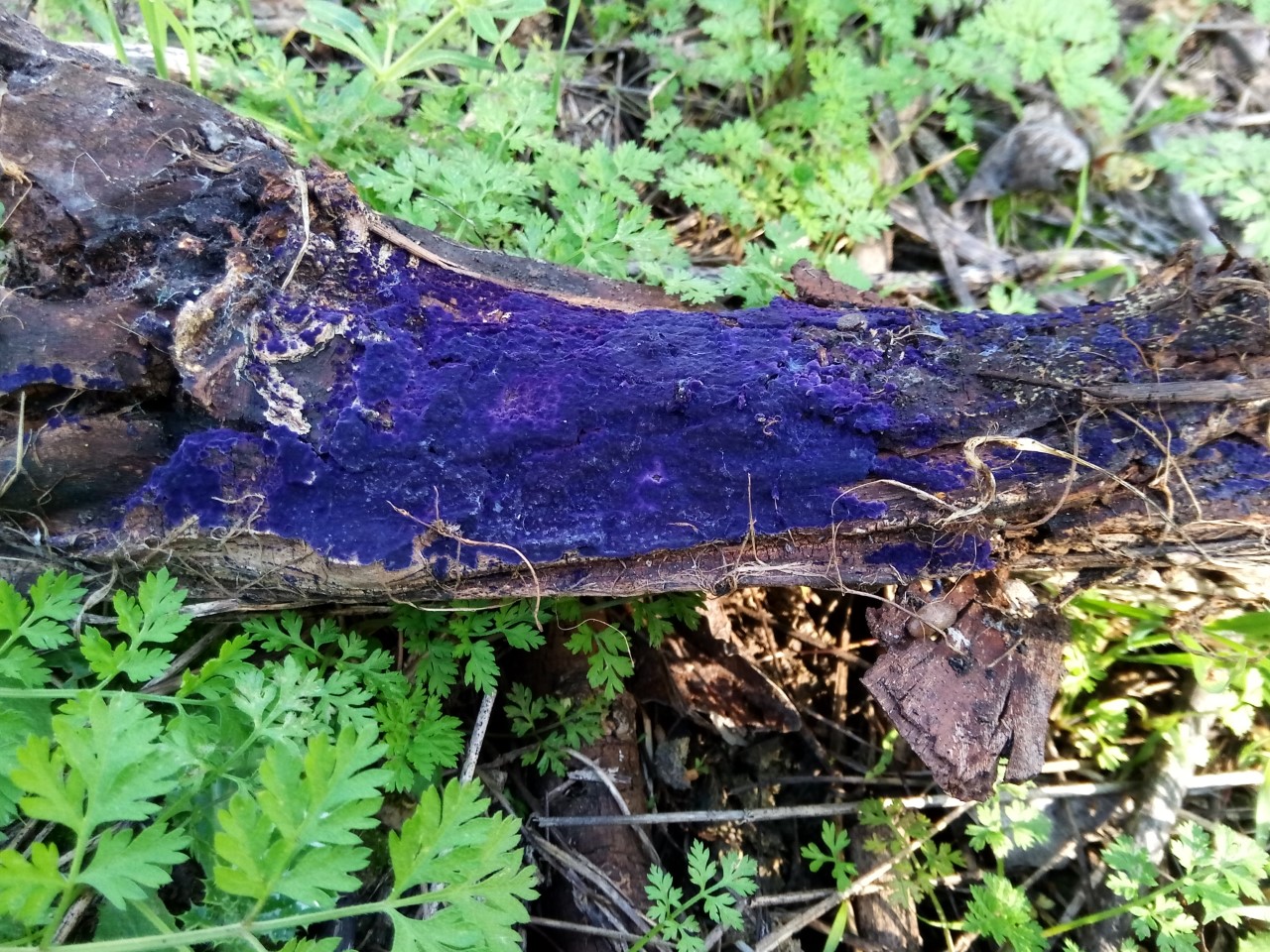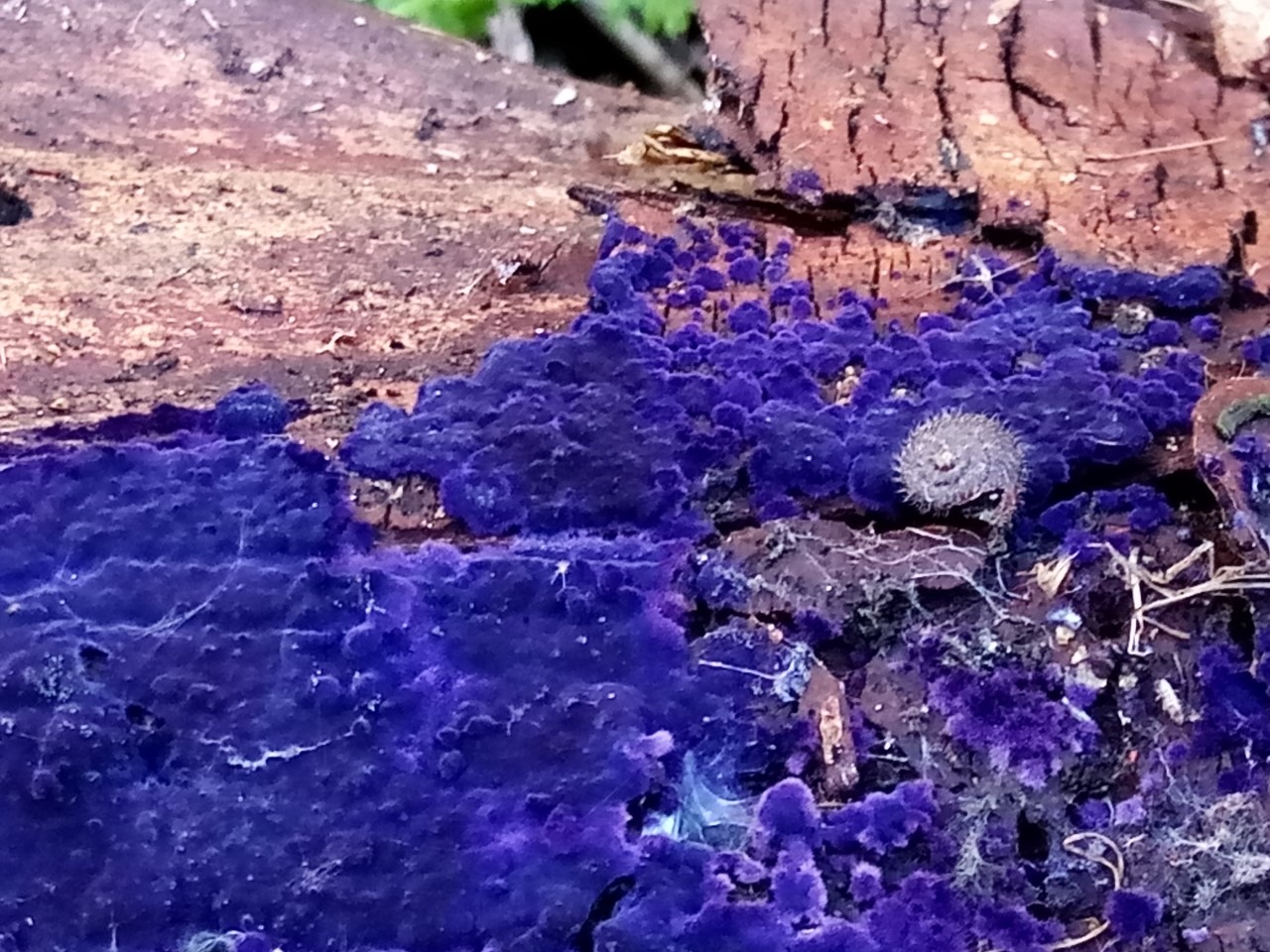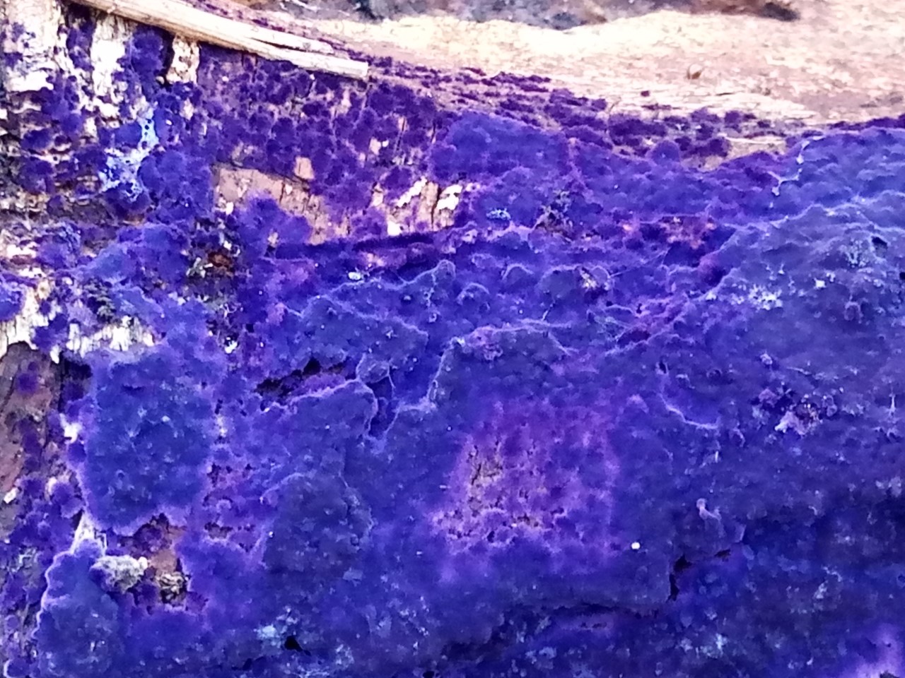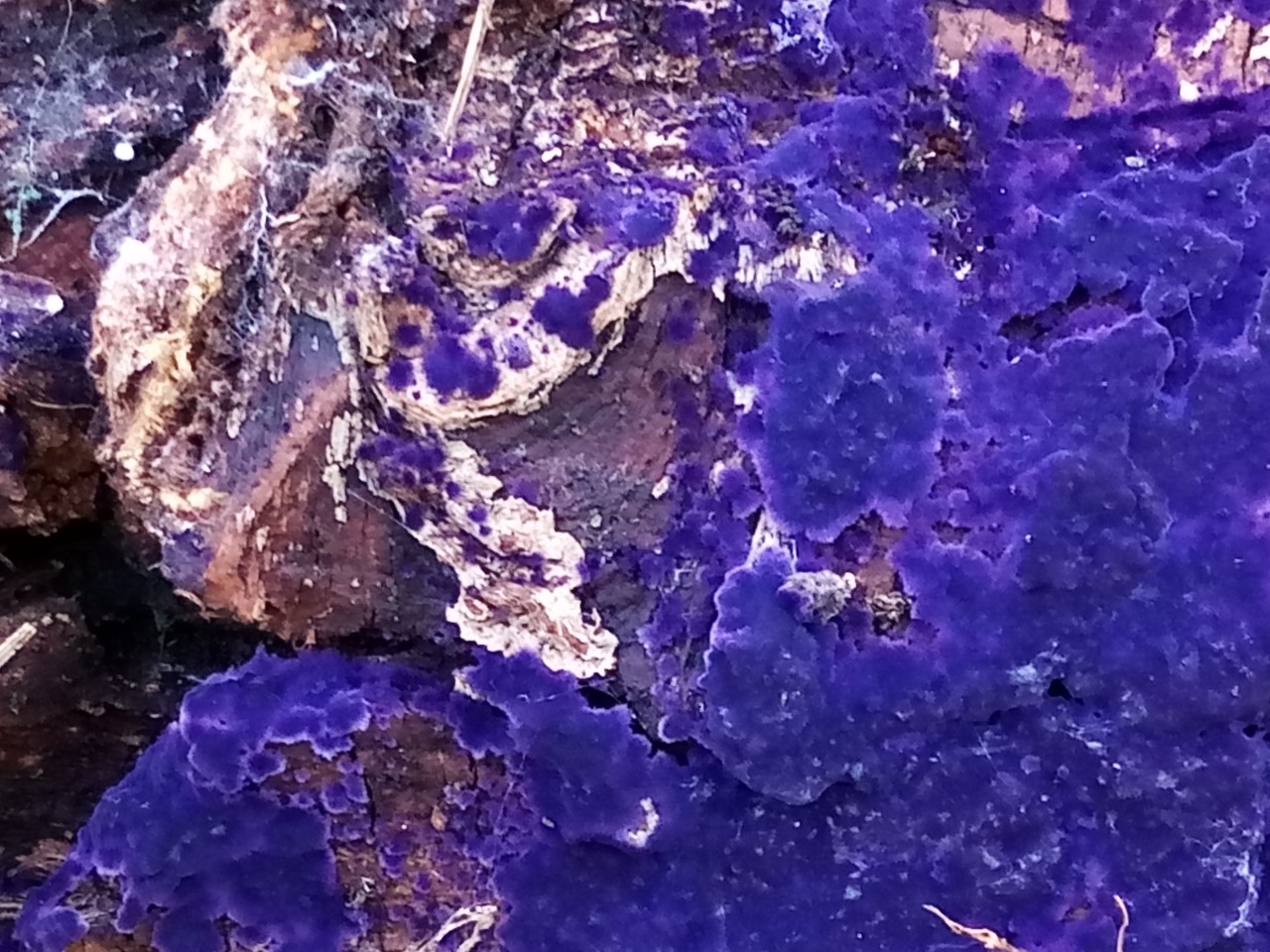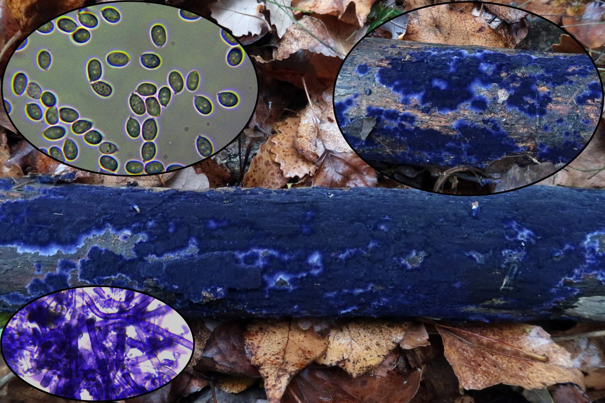 En la parte inferior de madera muerta de planifolios se encontraba este bonito carpóforo creciendo de forma resupinada llamada Pulcherricium caeruleum = Terana caerulea.
