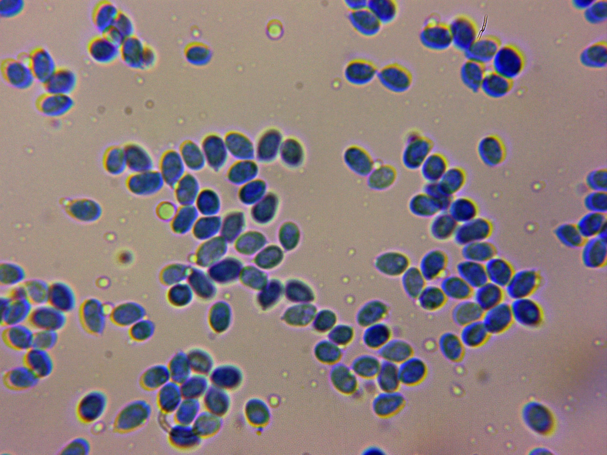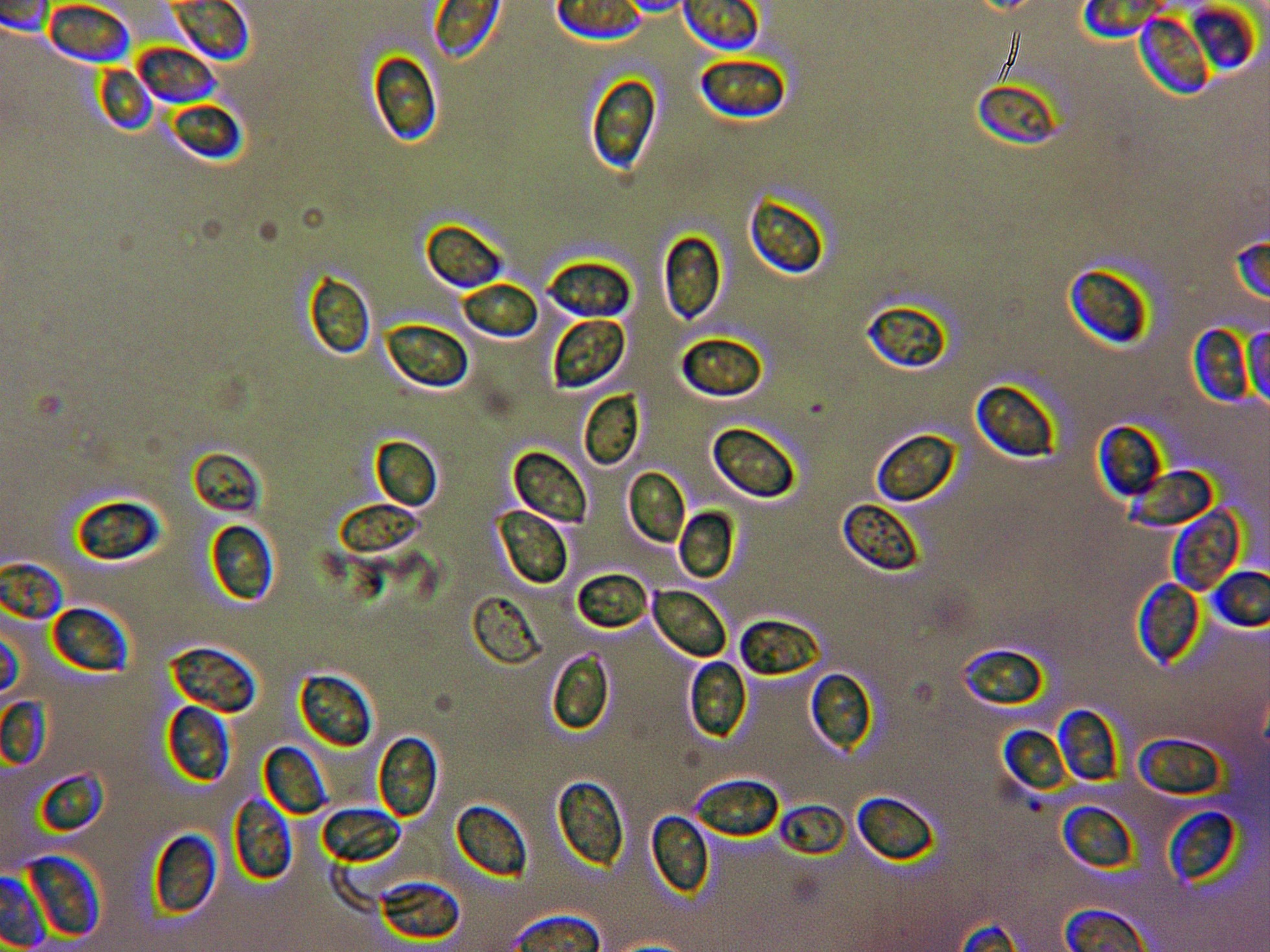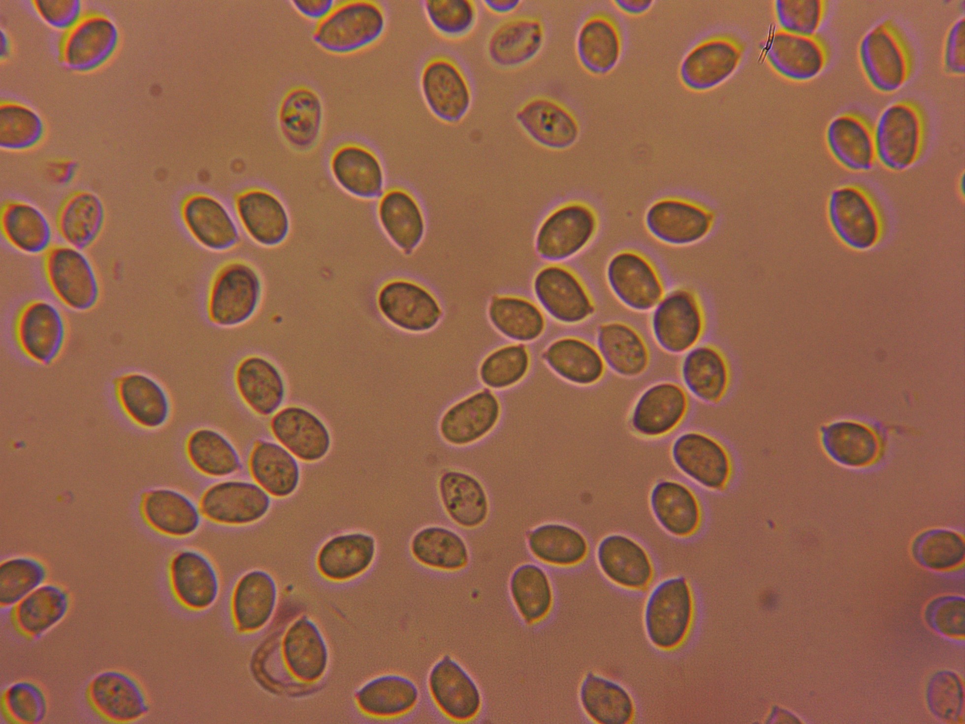 Gracias Javier, es curioso que no encontraras esporas (deduzco que de haberlas encontrado ya nos las habrías presentado), a mí me costó mucho el poder dar con ellas, tuve que realizar hasta 4 estudios y un cultivo por espacio de una semana para poder encontrarlas, añado unas imágenes mías de sus esporas así como una espectacular imágen de la especie del pasado 17 de Noviembre.