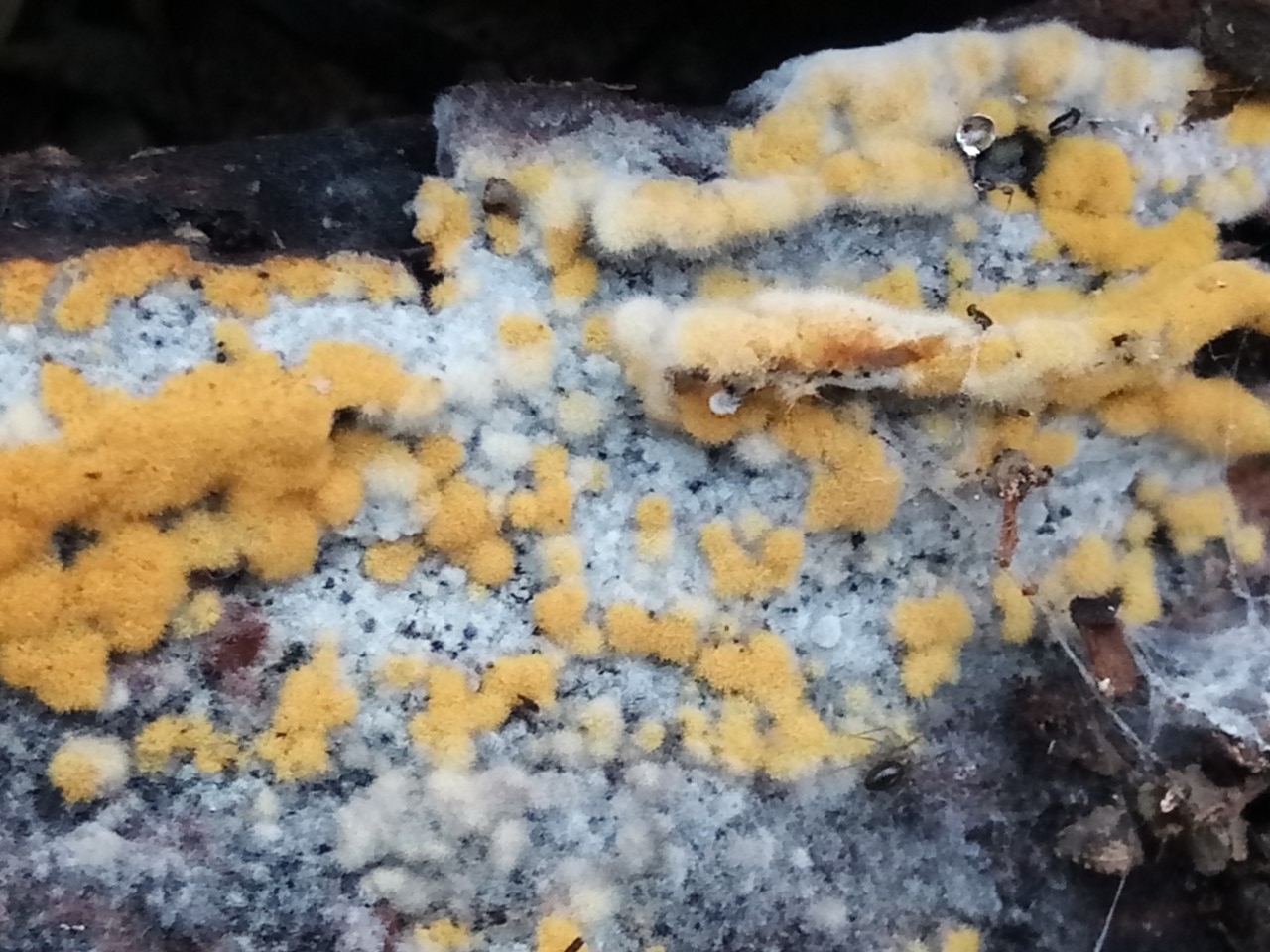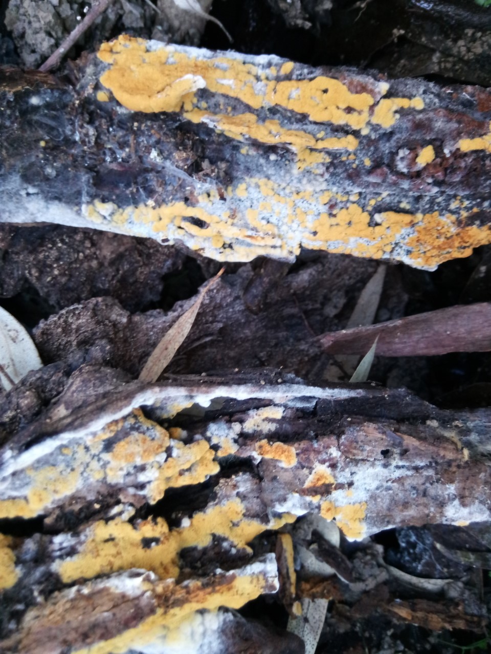 Del pasado Domingo 2 de Febrero del 2.020 en las inmediaciones del Río Guadalquivir y muy cerca de la ciudad de Sevilla busqué y encontré este carpóforo resupinado Botryobasidium robustius mas su etapa de anamorfo Haplotrichum rubiginosum. Se desarrollaban semi enterrado en la base de árbol derribado y muerto.