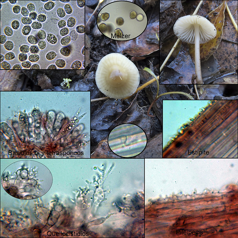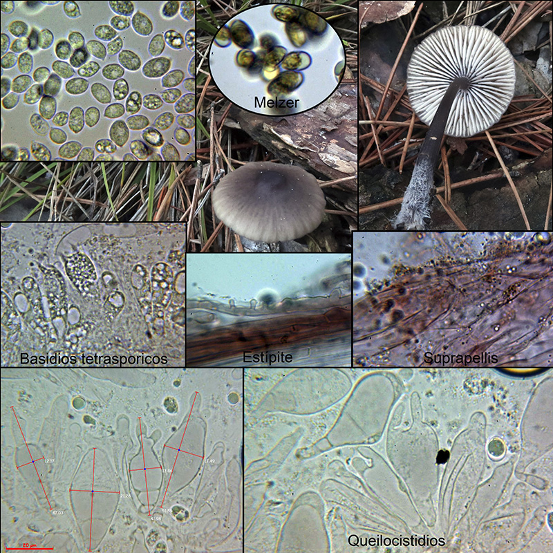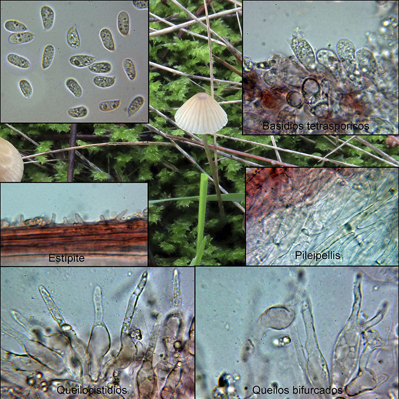 Microscopía: Pileipellis con múltiples digitaciones y múltiples hifas diverticuladas, queilocistidios ventrudos con un cuello estrecho y terminaciones redondeadas con unas medidas de (31.3) 37.1 - 39.2 (45.6) × (12.4) 14 - 16.6 (17.5) µm, basidios tetraspóricos y esporas elipsoides de pared fina multigutuladas y con una apícula lateral, las medidas de