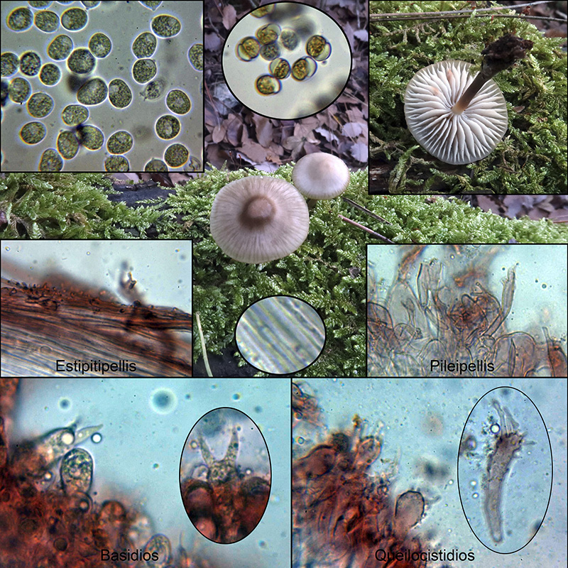 Microscopía: Hifas de la parte corticial del estípite con digitaciones cortas, basidios todos los que pude observar bispóricos y con gruesos esterigmas. Queilocitidios multiformes con abundantes digitaciones algunas mas o menos largas. Esporas entre ovoides a cortamente elipsoides, inamiloides y con unas medidas de (9.4) 10 - 11.7 (12.7) × (7.9) 8.2 - 9.2 (9.9) µm Q = (1.1) 1.14 - 1.3 (1.4) ; N = 30 Me = 10.7 × 8.7 µm ; Qe = 1.2.