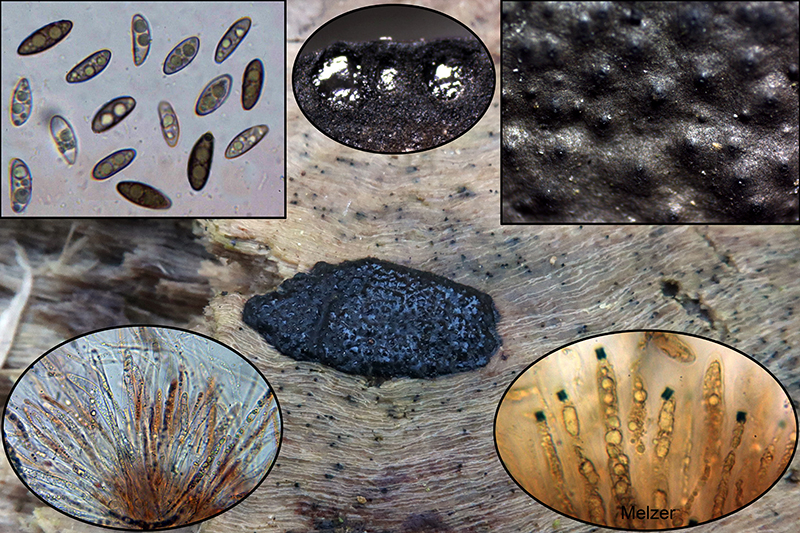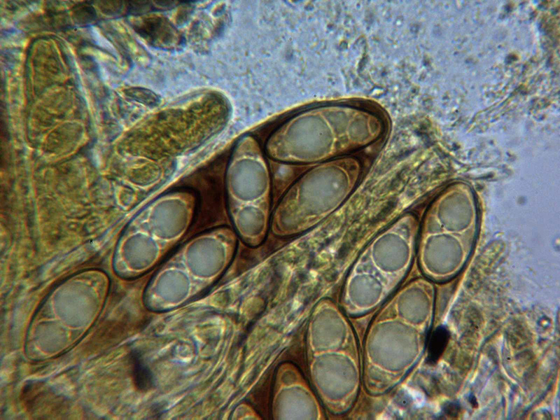 Una Nemania, que tenía por Nemania serpens (nunca debemos dar nada por seguro), esta podría tratarse de todo un cromazo, sus grandes medidas esporales unidas a las pequeñas medidas de su aparato apical (amiloide) de tan solo 2,5-3,2 × 1,9-2,4 µm (según bibliografía de 2-3.5 µm x 2-2.5), las claves del género me llevan a la Nemania aenea var. macrospora