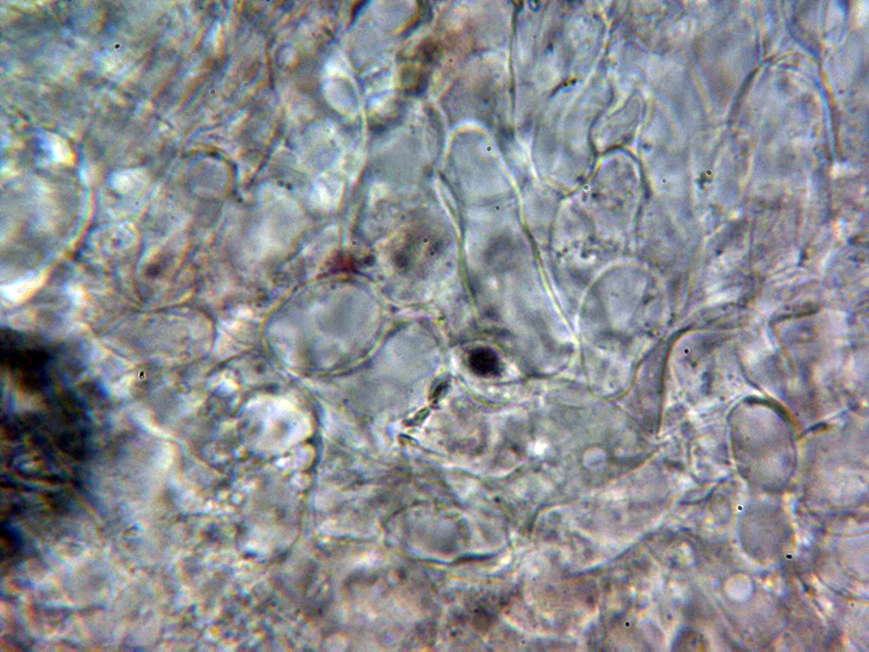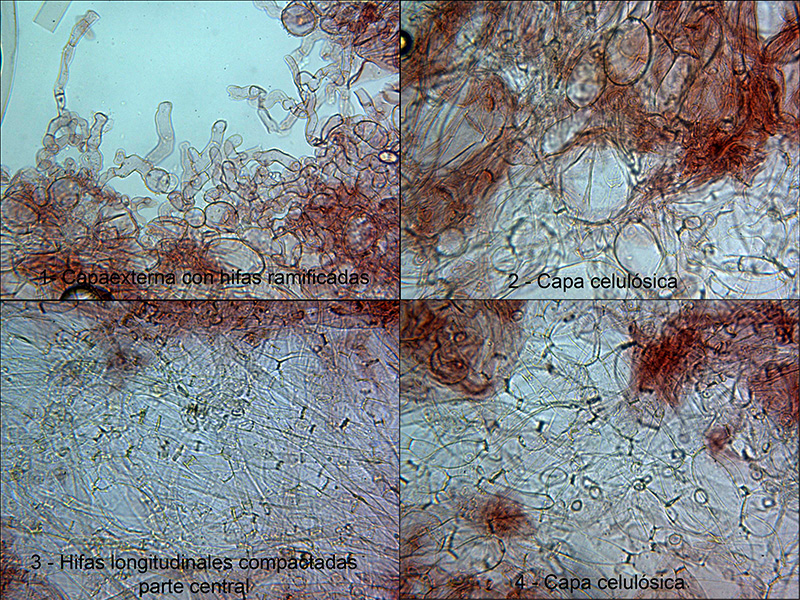 A destacar las cinco capas bien diferenciadas en la sección, con una capa central de hifas filamentosas fuertemente compactadas y la parte exterior con hifas ramificadas: