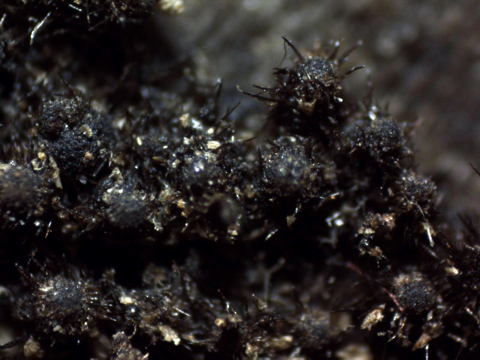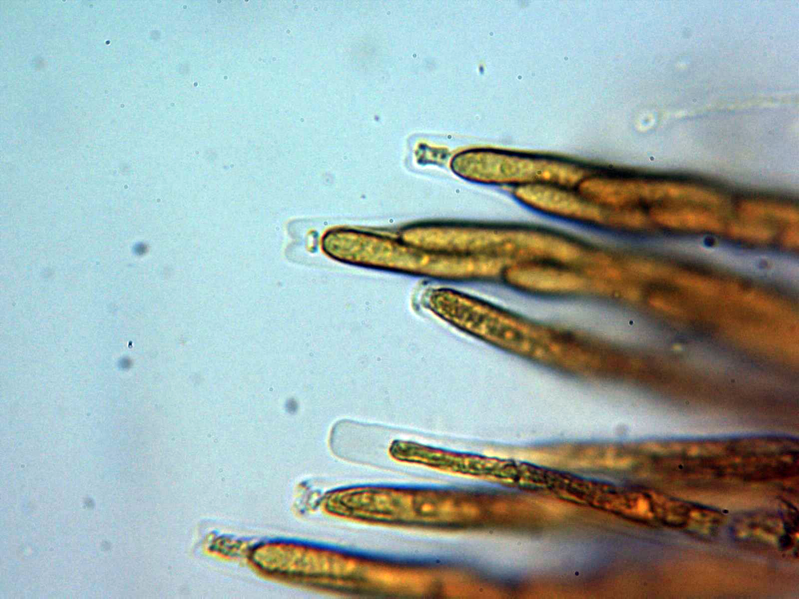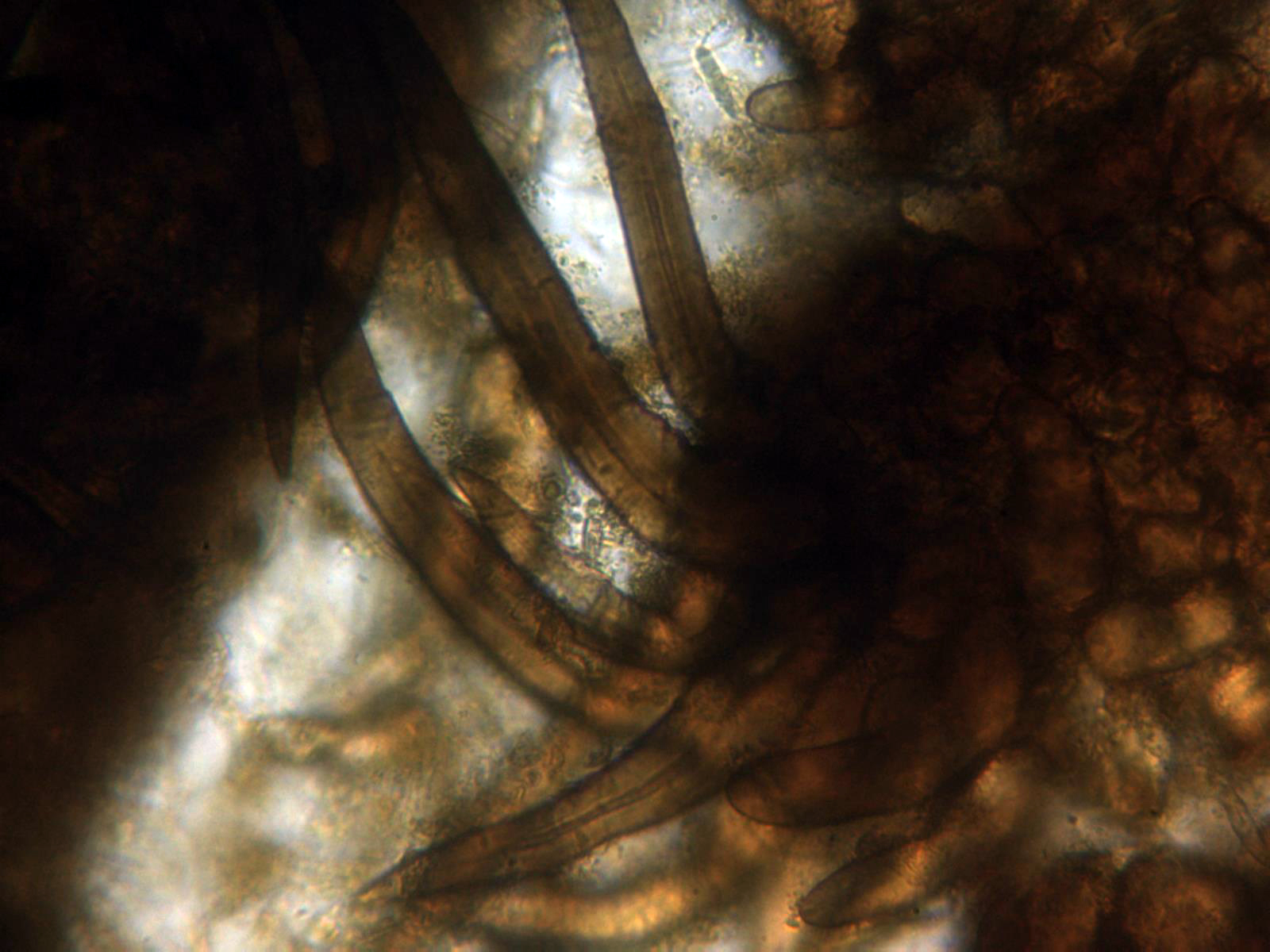Pelos en forma de púas oscuras, en muchos casos incluso mas largos que el mismo diámetro del apotecio, en mis mediciones de entre 0,26 a 0,54 mm.