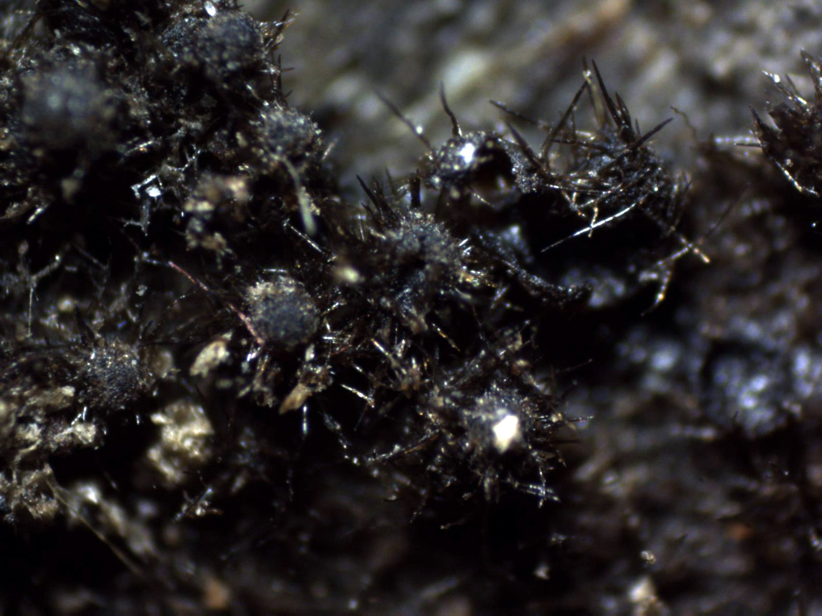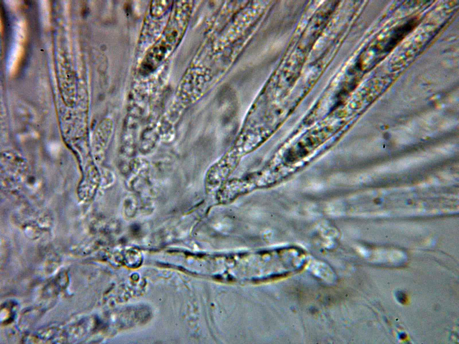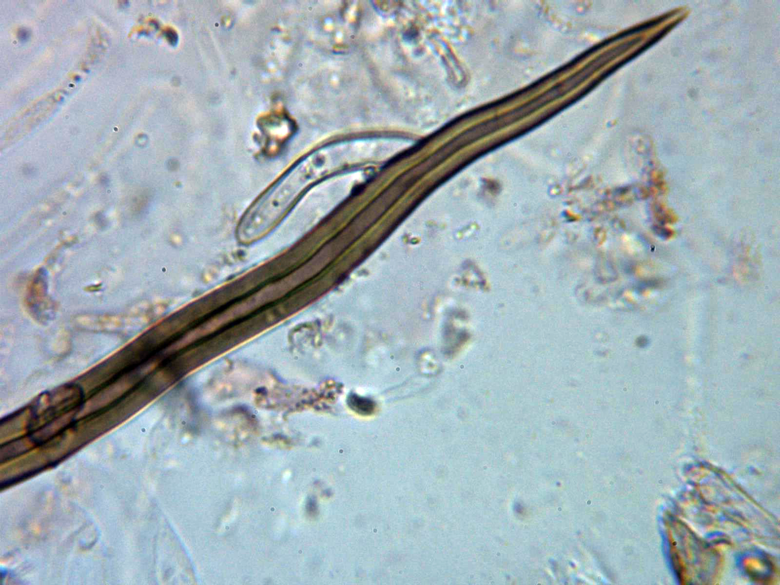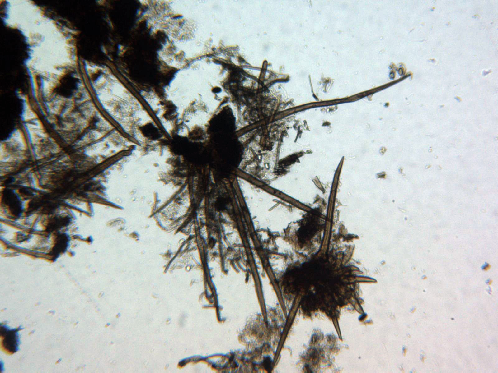 Pelos en forma de púas oscuras, en muchos casos incluso mas largos que el mismo diámetro del apotecio, en mis mediciones de entre 0,26 a 0,54 mm.