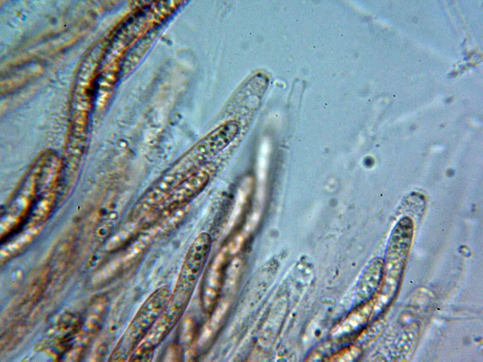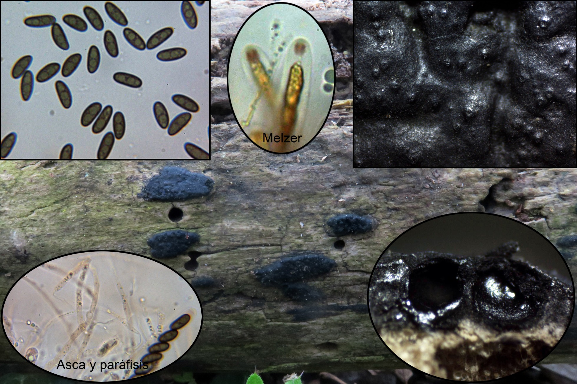 Y muy parecida a la anterior y según muchos autores considerada simplemente una variedad de la misma tenemos la Nemania serpens var. colliculosa (esta pertenece a un trabajo mio anterior que tenía mal identificado), en esta ocasión con reacción claramente amiloide del aparato apical, según opina Jacques Fournier sería asimismo correcto denominarla como Nemania colliculosa, ya solo para diferenciarla de su hermana.