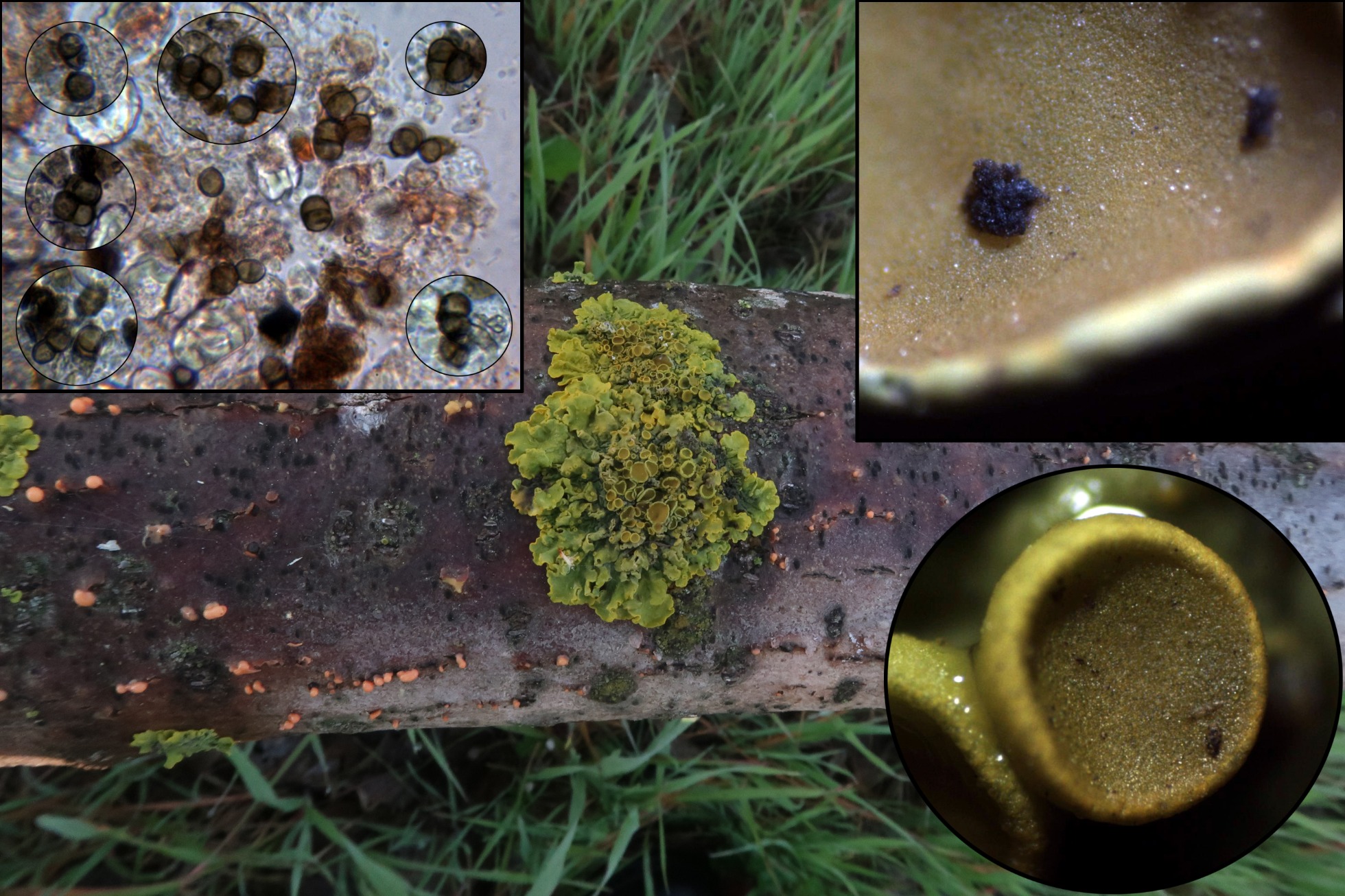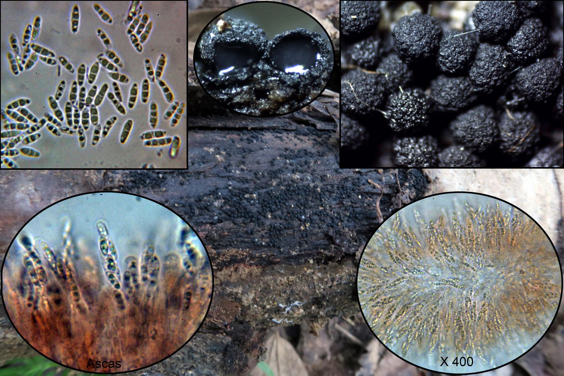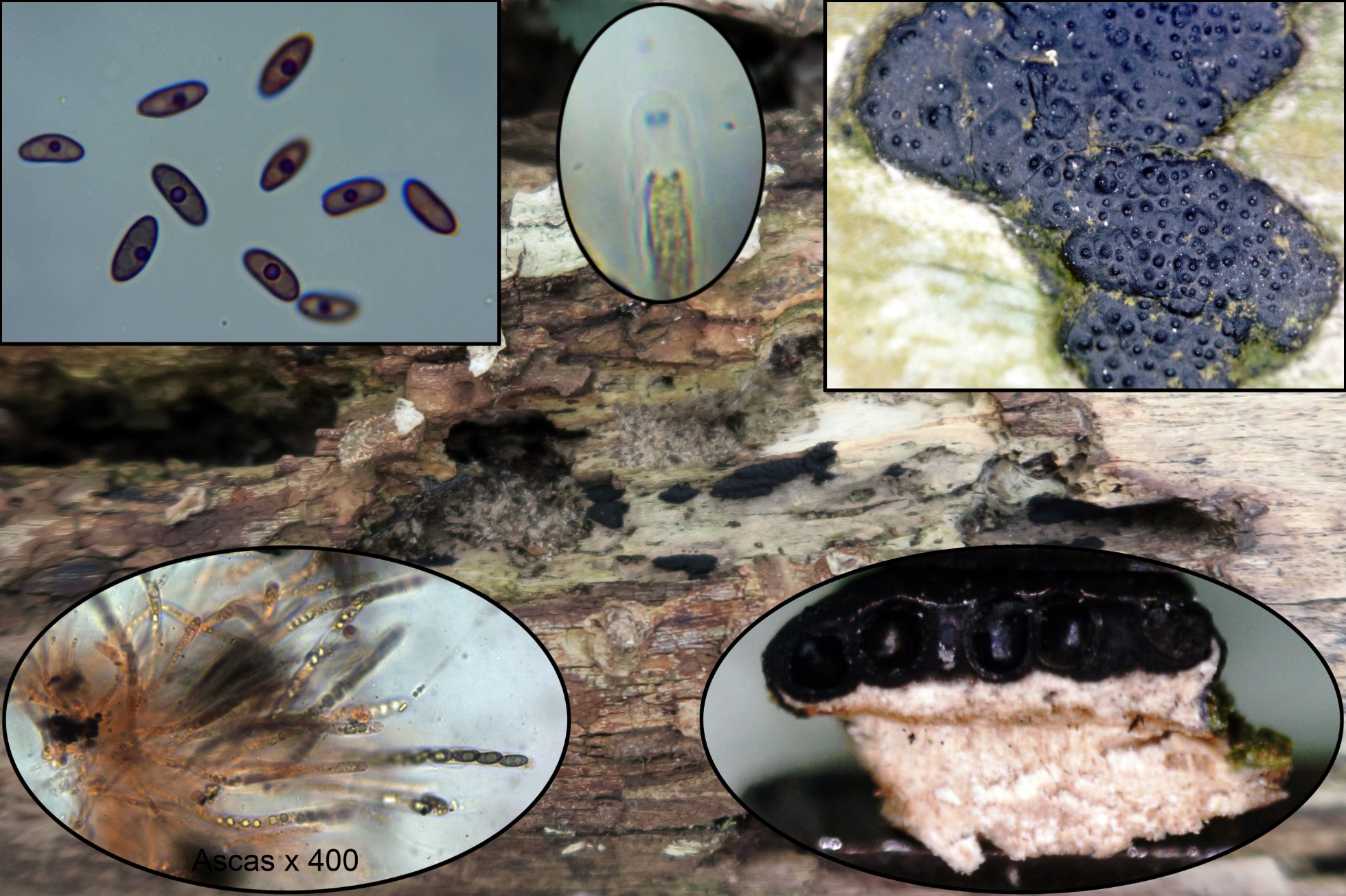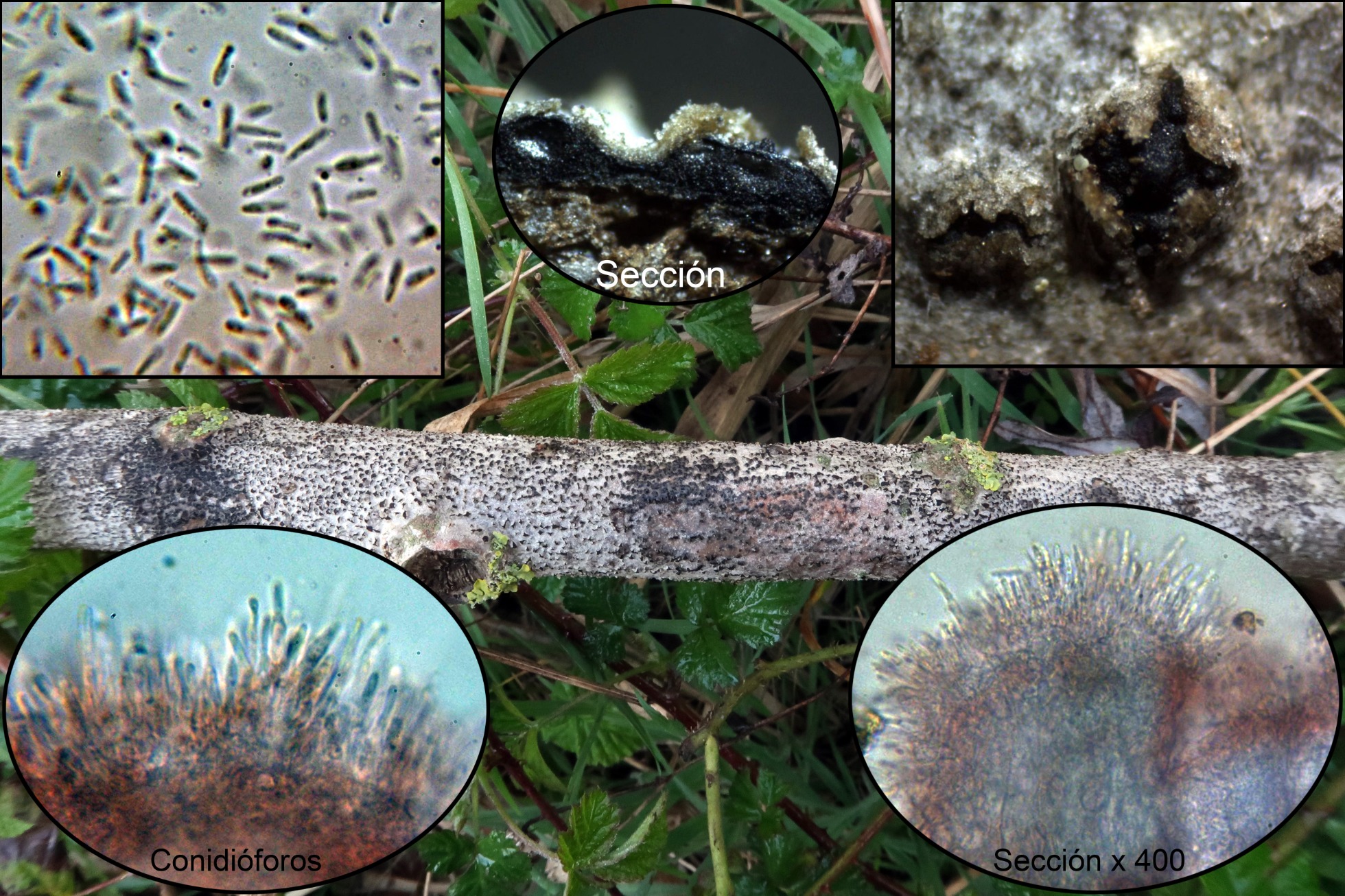 Para empezar otra de diminuta, con muchos ejemplares negruzcos aparentemente aislados, con forma de granos que en la sección algunos de ellos parecen presentar una base común, la forma de los conidios así como la conidiogénesis me llevan a Cytospora, siguiendo la revisión del género de 2017 (Norphanphoun C, Doilom M, Daranagama DA, Phookamsak R, Wen TC, Bulgakov TS, Hyde KD), el estudio realizado me lleva a la Cytospora paratranslucens