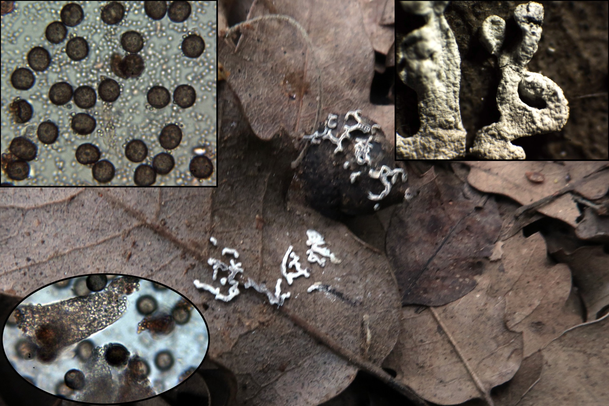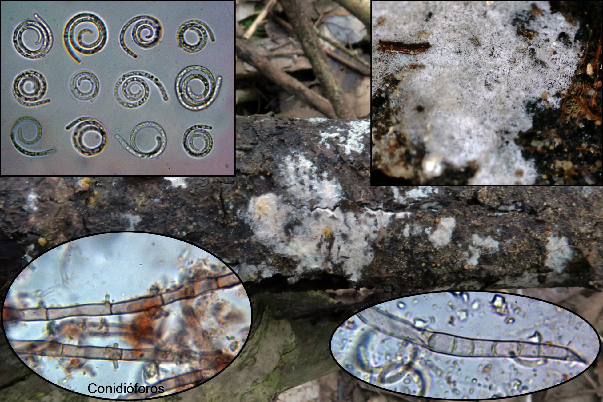 Un Hyphomyceto, con sus característicos conidios, siguiendo las claves de Zhao, G.Z., Liu, X.Z, and Wu, W.P. (2007), las únicas de que disponemos, por la conidiogénesis me conducen a Helicomyces, dentro de estas y tirando del hilo de las claves, por el dato de sus relativamente pequeños conidios, me arrastran irremediablemente al Helicomyces liliputeus, aunque parece todo encajar perfectamente, al tratarse de una especie del Continente Europeo, prefiero dejarlo (a falta de nuevos estudios), como Helicomyces aff. liliputeus