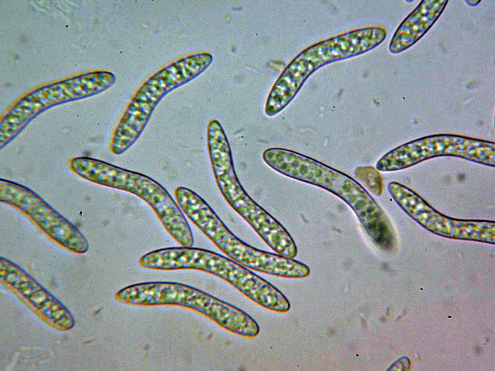 Esporas a 1000 aumentos, con forma de codo o boomerang, con abundantes granulaciones dispersas en su interior y unas medidas de: