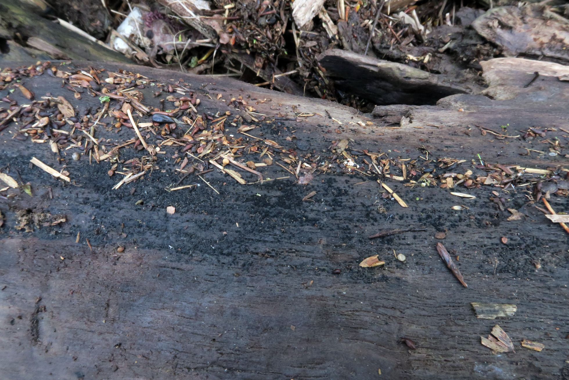 Muy diminutos apotecios apareciendo agrupados sobre la superficie de un tronco.