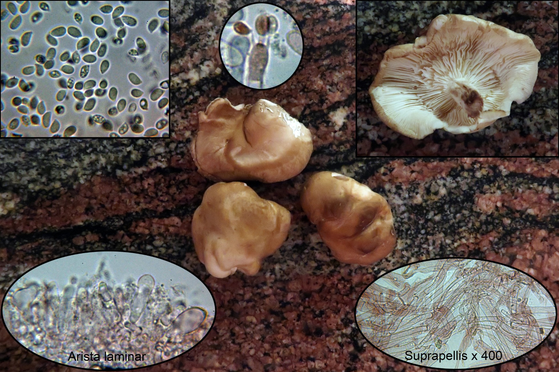 Con pileipellis filamentosa, arista laminar con elementos estériles a modo de cistidios, basidios tetraspóricos y esporas amigdaliformes con unas medidas de: