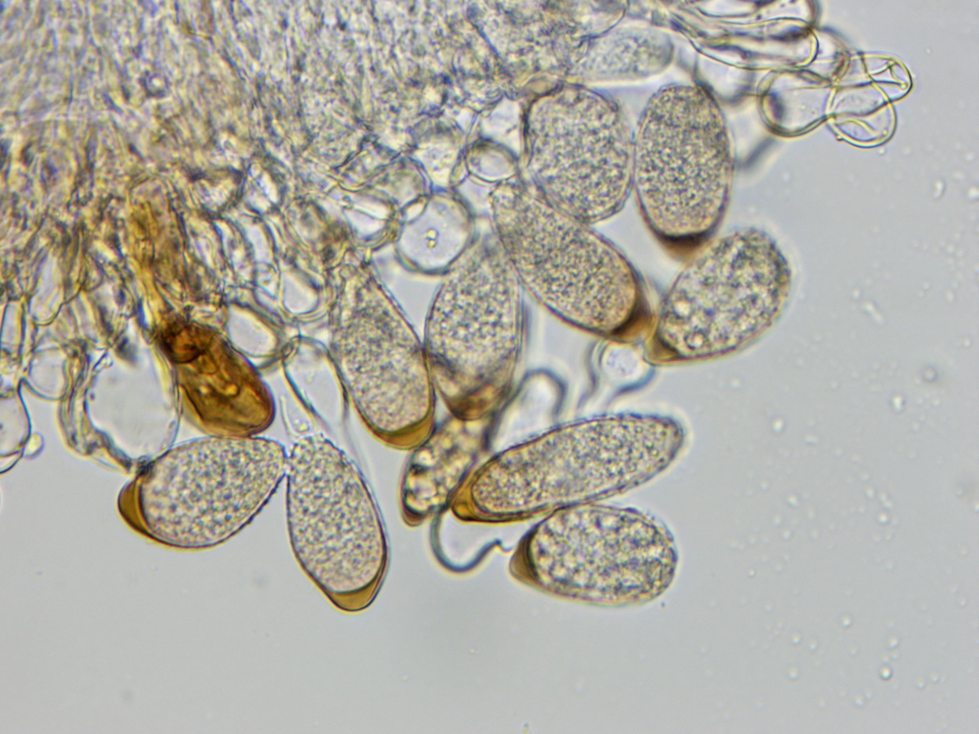 esporas que recogi de la ramita en un abultamiento abierto de forma de costra. germinando al poco de ser observadas