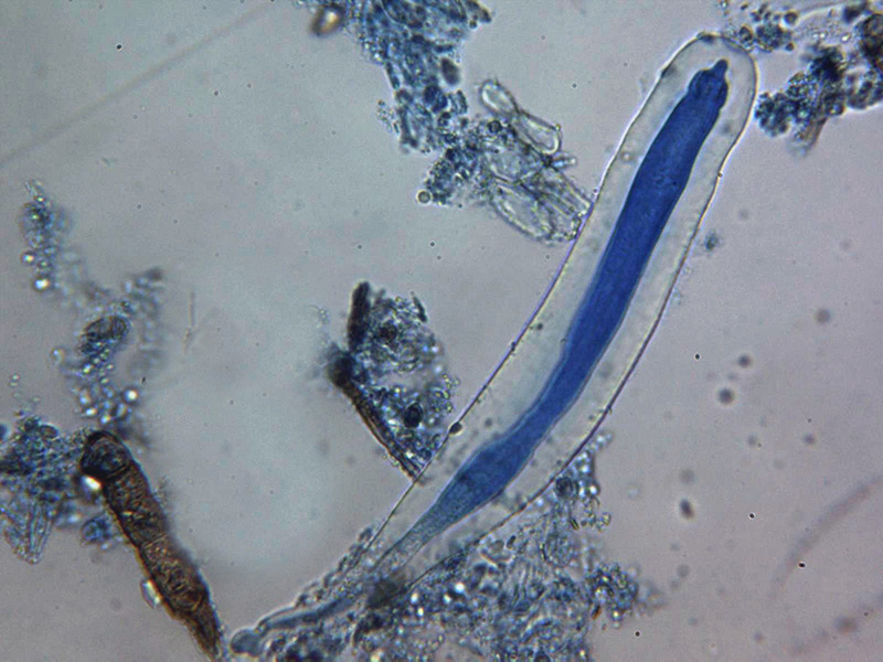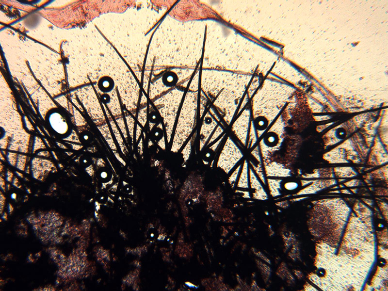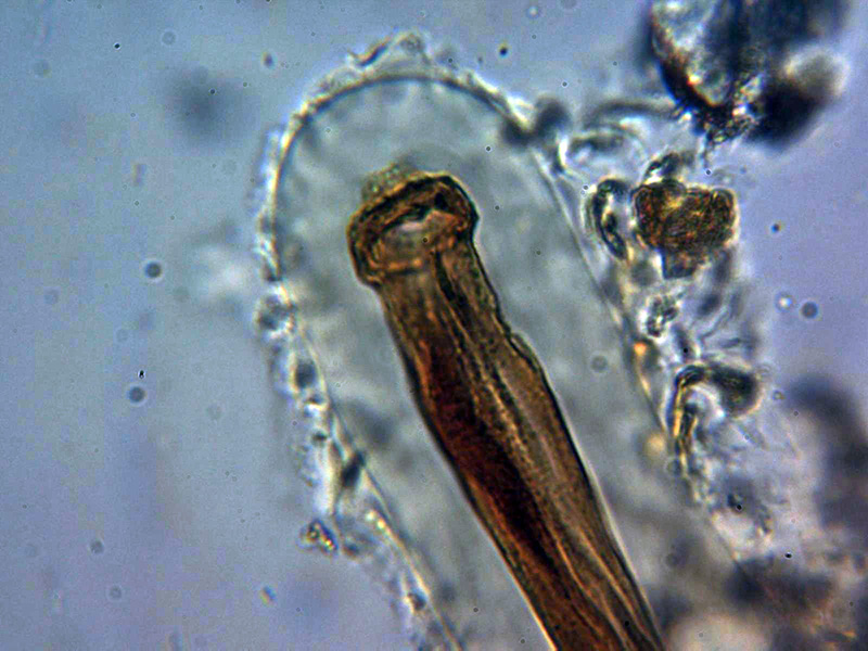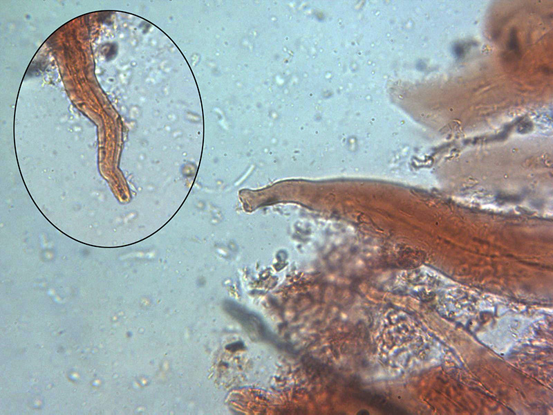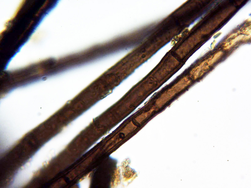 Pelos externos de color marrón, septados y que no licúan sino que hasta oscurecen con KOH al 20%