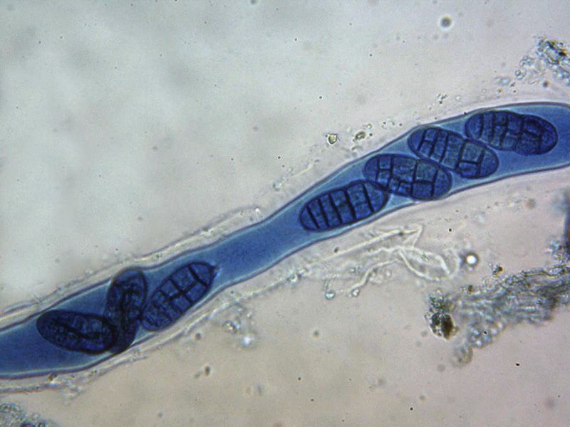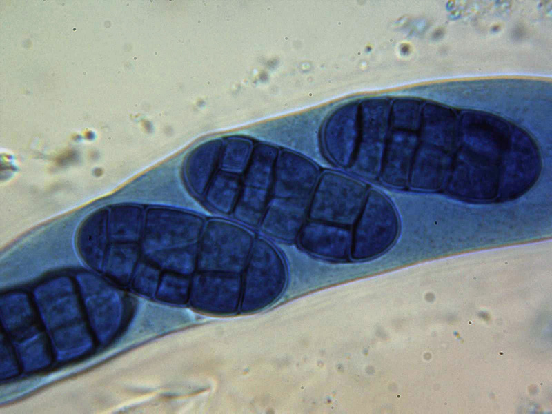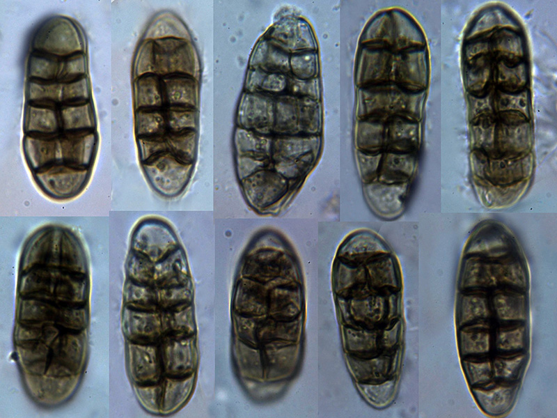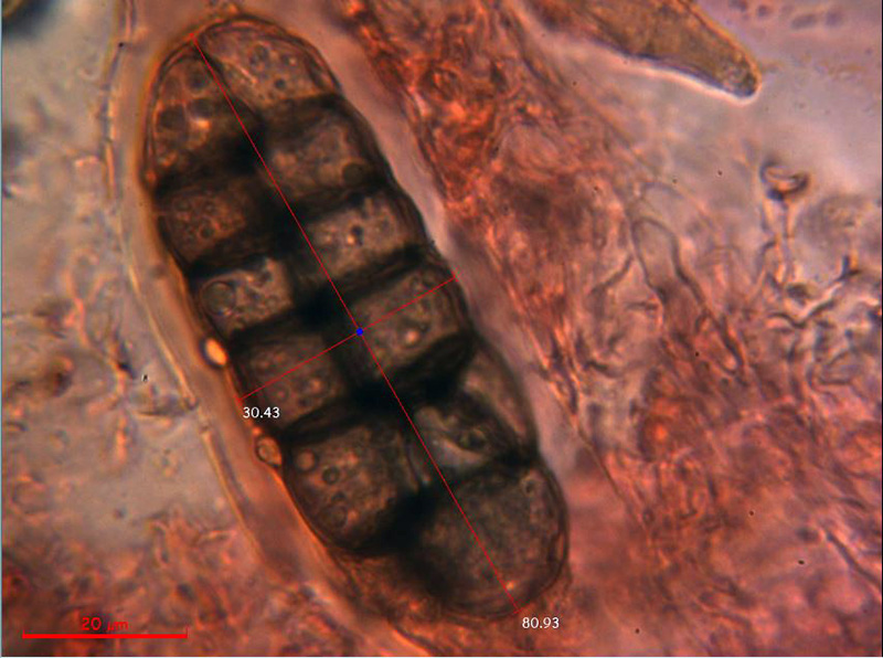 Ascosporas de grandes dimensiones con un septo longitudinal y 5 o 6 septos transversales, mayoritariamente con unas medidas de (50) 51.7 - 59.9 (62.3) × (20.2) 20.4 - 22.6 (25.6) µm. con una media de Me = 55.8 × 21.6 µm; Qe = 2.6, aunque pude observar una de ellas que superaba las 80 µm de longitud y las 30 µm de anchura.