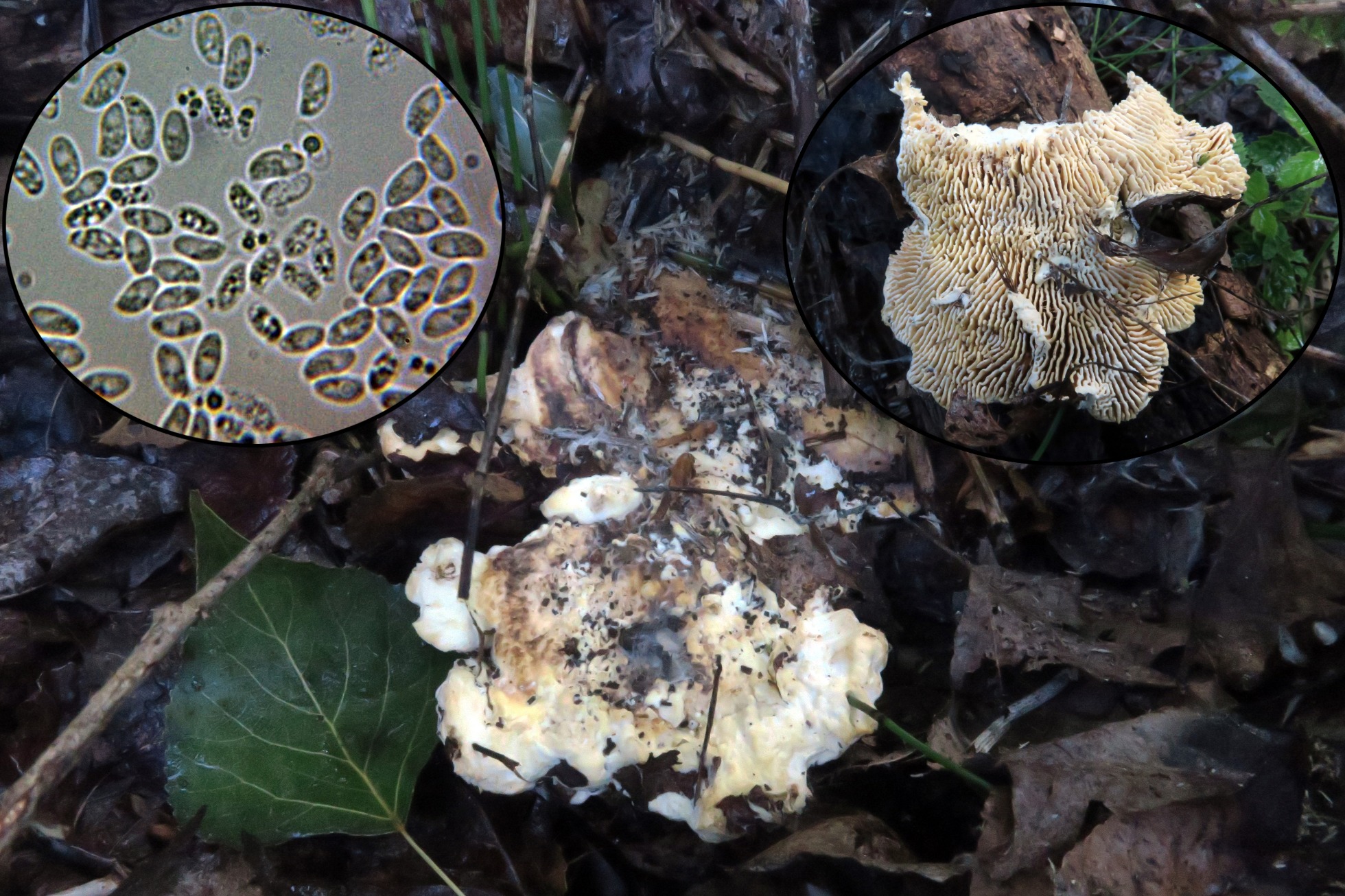 También una vieja conocida, parecida a la Lenzites betulina pero con sombrero glabro y esporas de mayor tamaño, la Lenzites warnieri