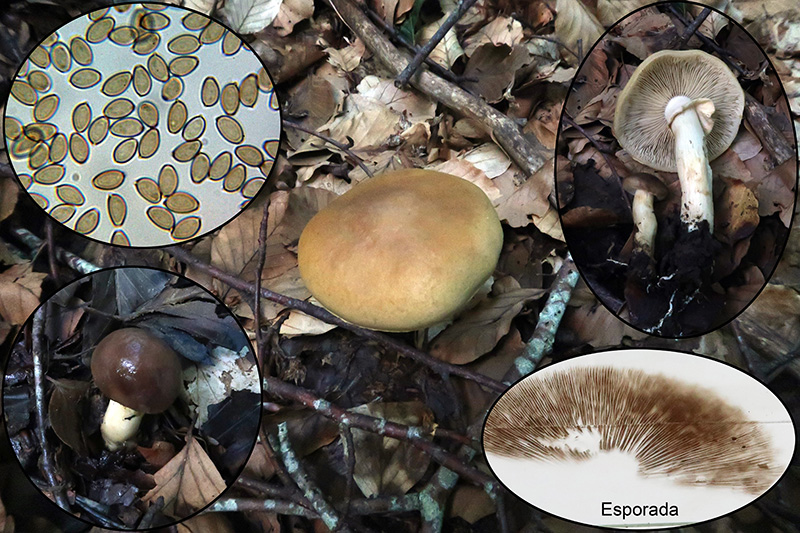 Y también en el hayedo, un Agrocybe que aparece por estas fechas, con anillo y sabor amargo, esporada en masa marrón, el Agrocybe praecox