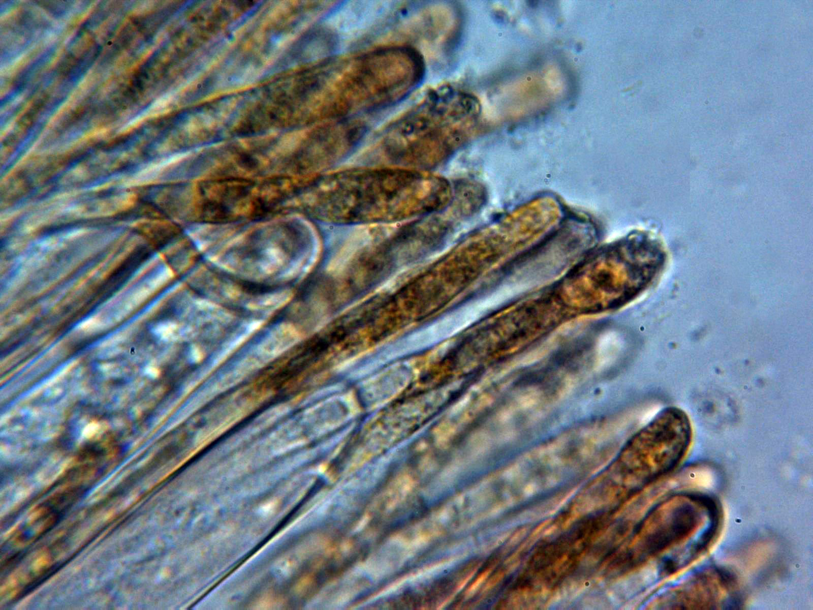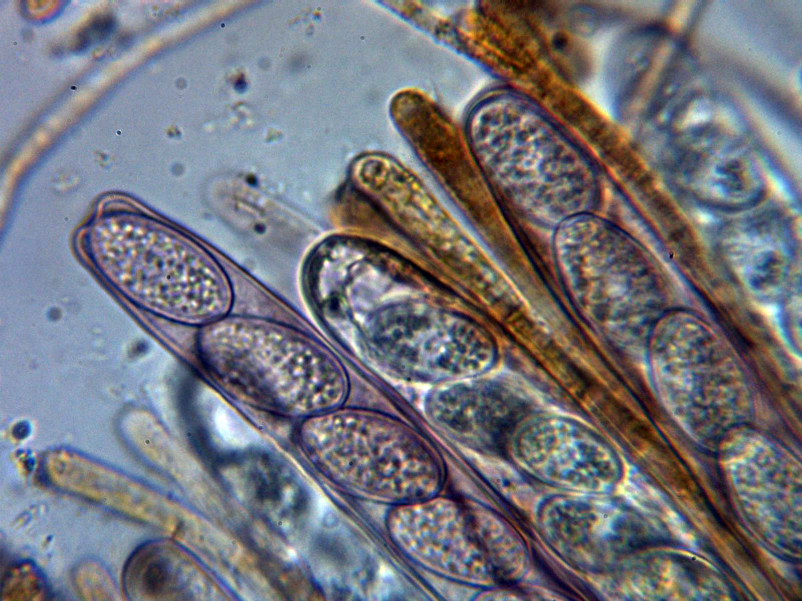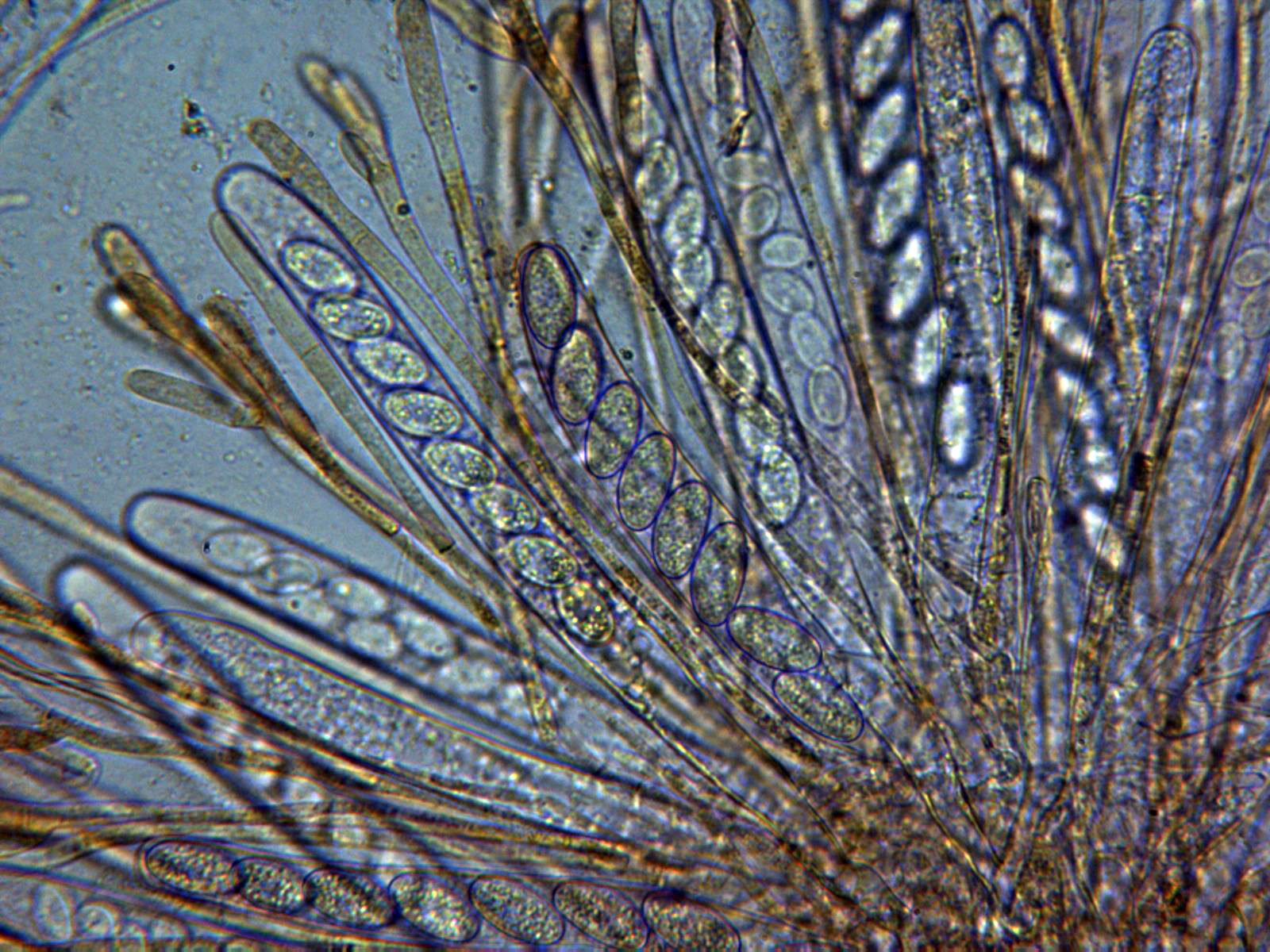 Paráfisis septadas, ensanchadas en el ápice y con contenido granuloso amarillento que son las causantes del color de los apotecios.