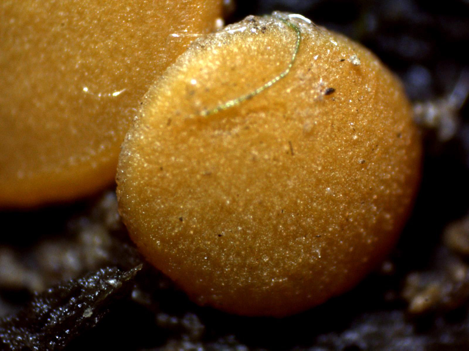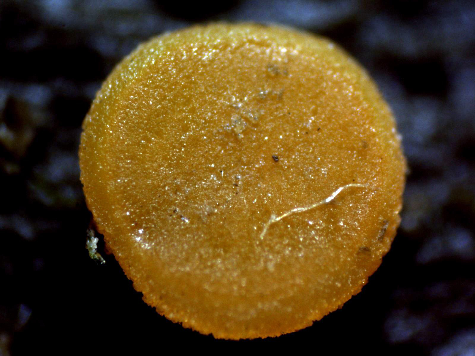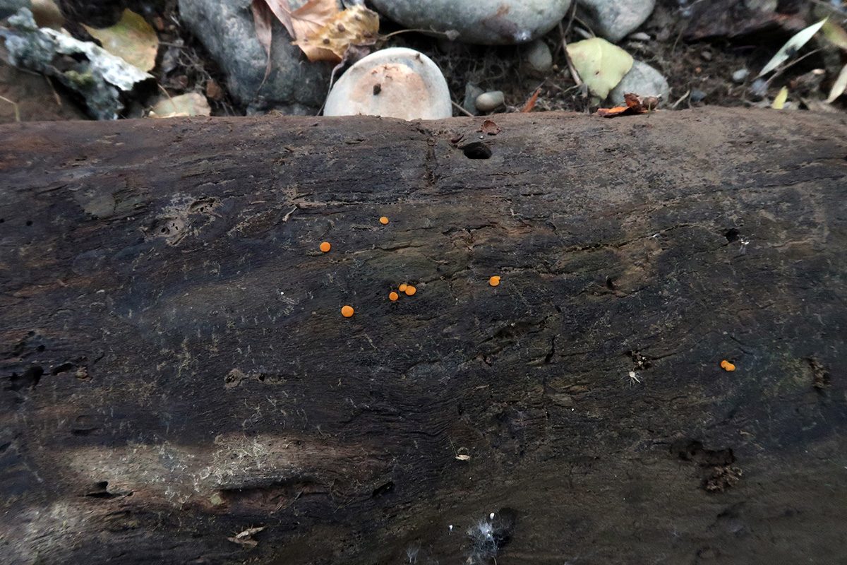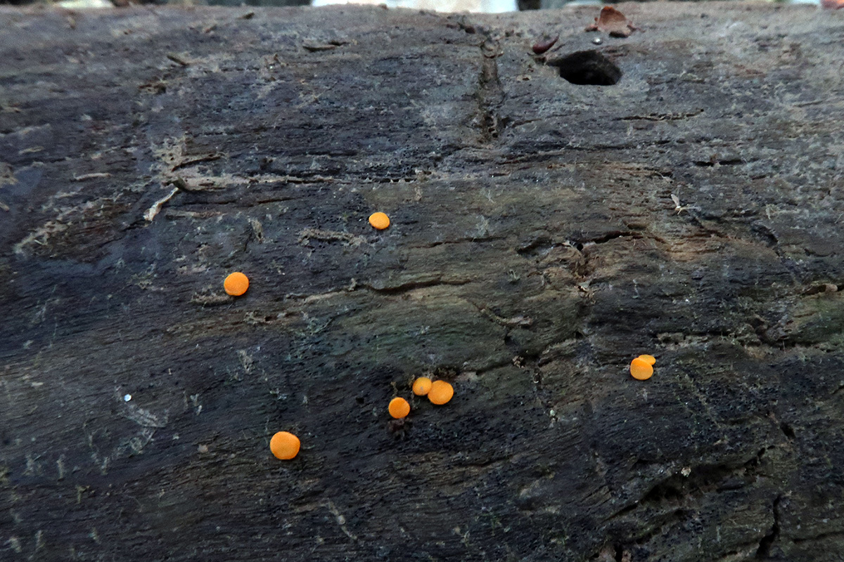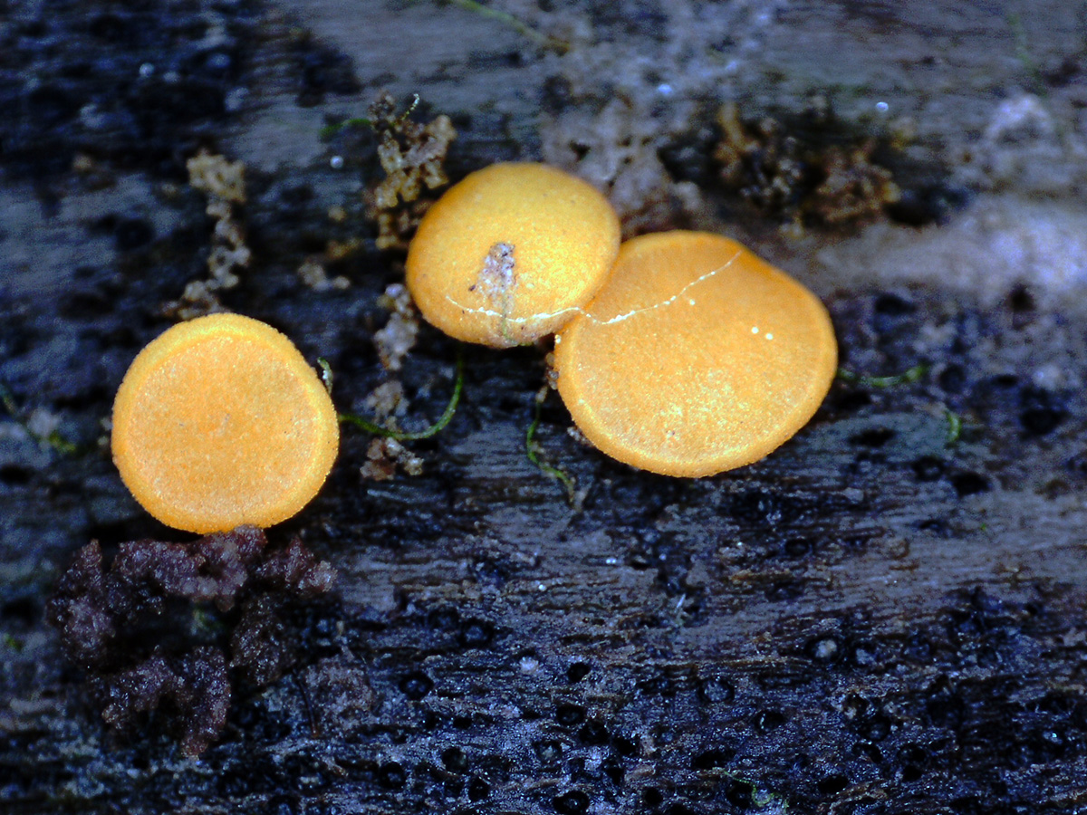 Pequeños apotecios de color anaranjado de entre 1,5 a 1,9 mm. de diámetro, con forma de disco aplanado, sesiles, dispuestos de manera dispersa o en pequeños grupos de dos o tres ejemplares.