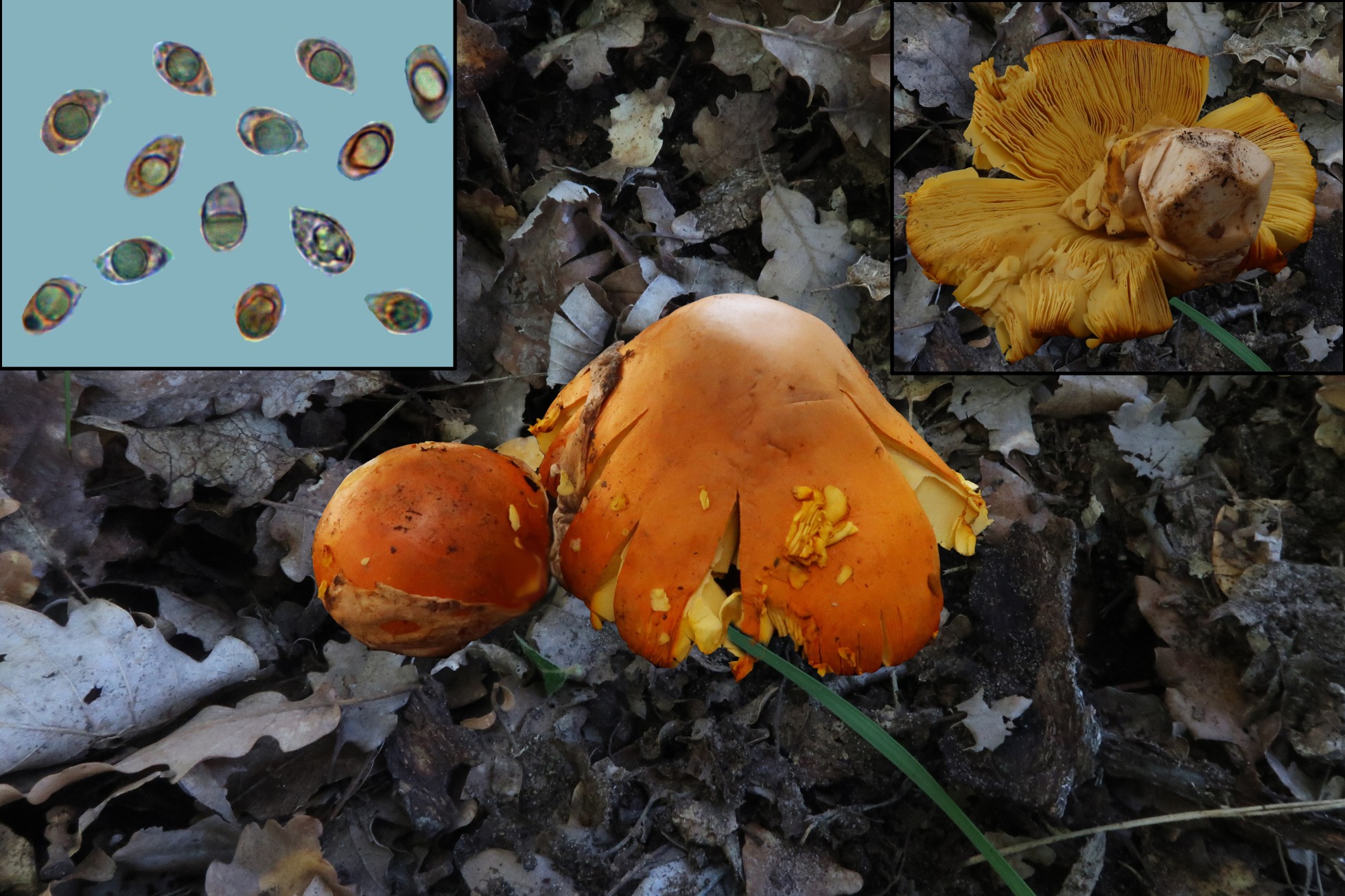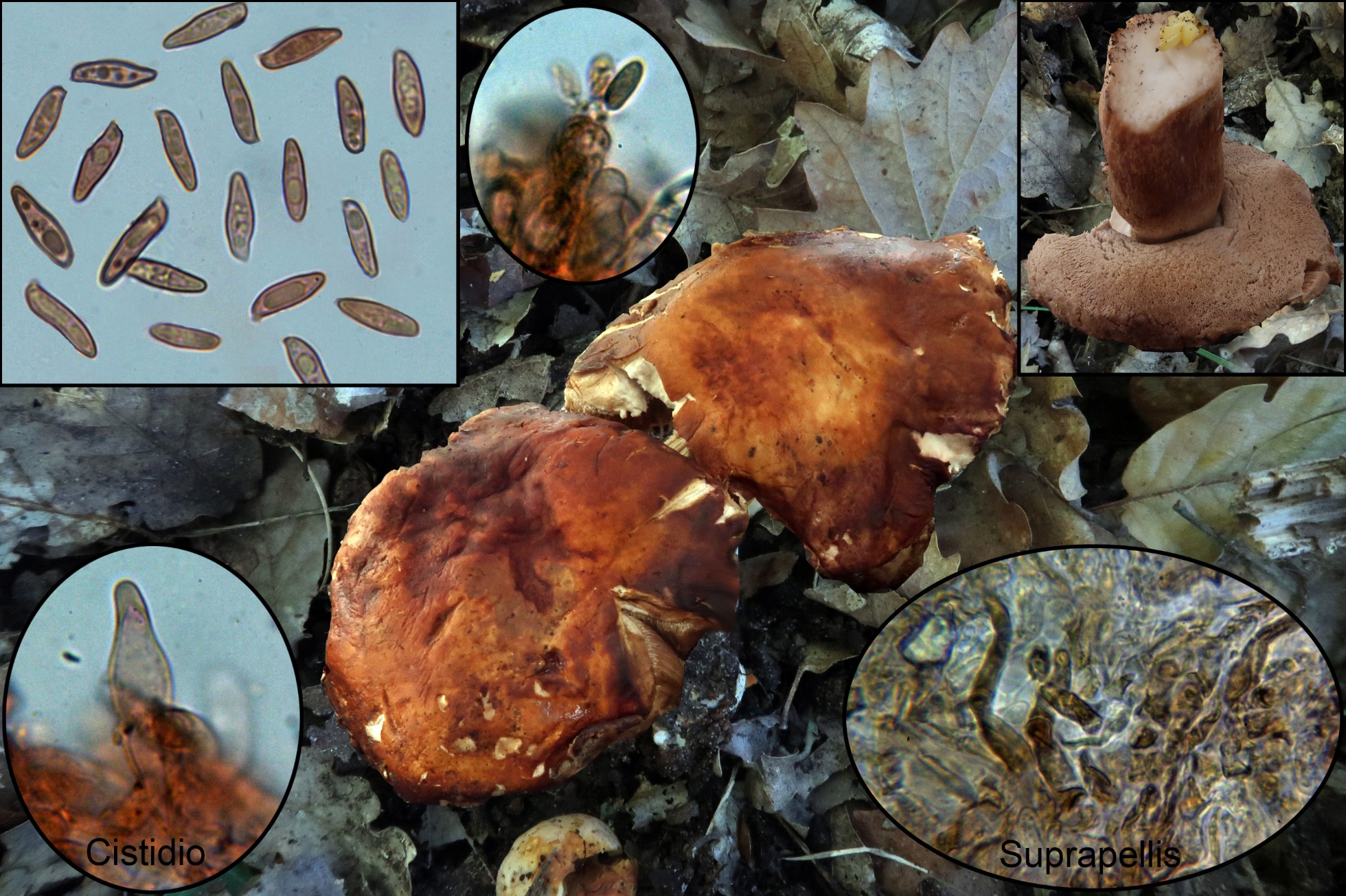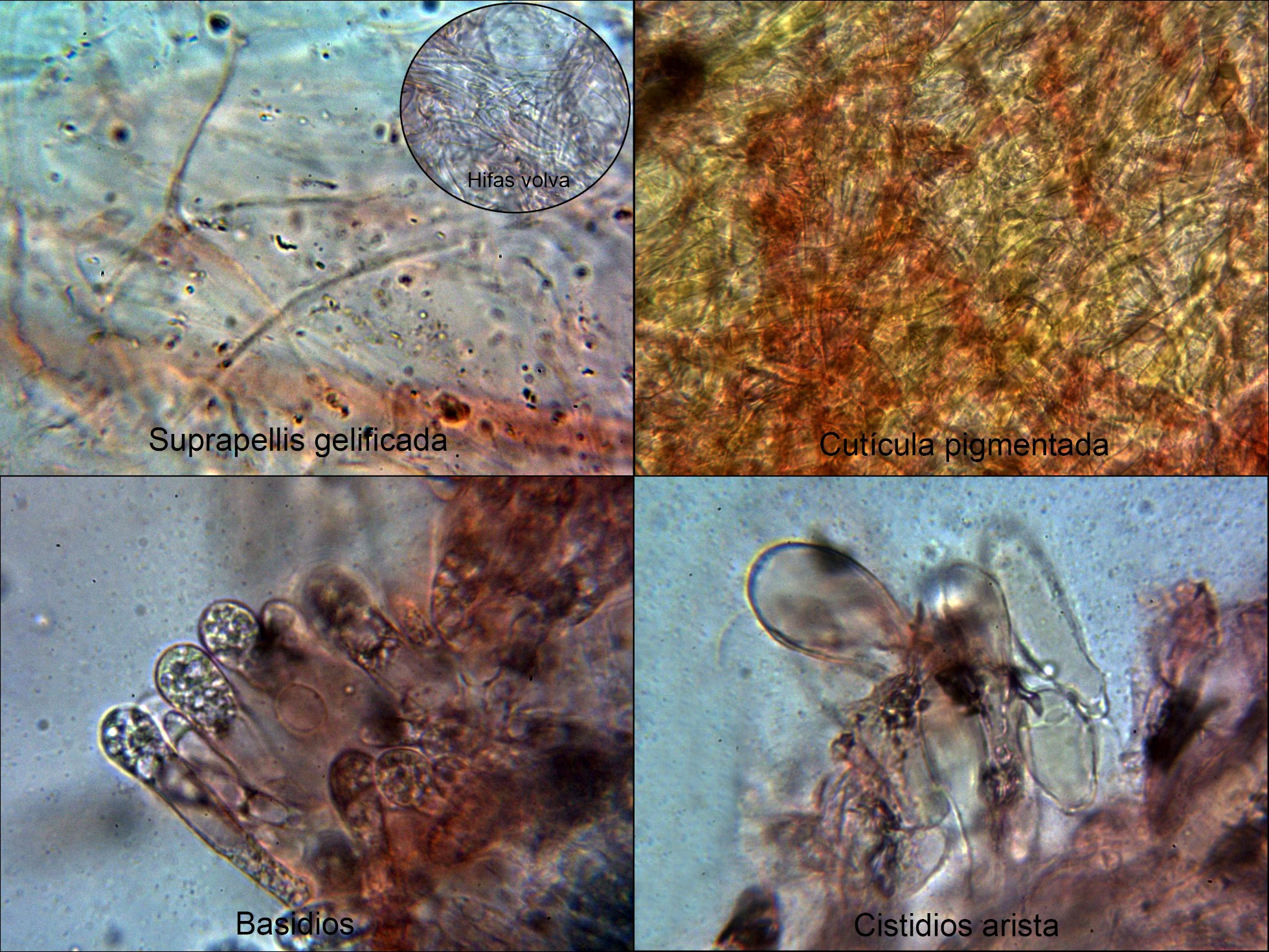 Pocas esporas observadas y además obtenidas de manera forzada, con lo cuál no sirven para las mediciones. A destacar las hifas hialinas entre cilíndricas y piriformes a modo de queilocistidios, las hifas muy separadas por gelificación de la suprapellis y las hifas fuertemente pigmentadas de la pileipellis que le confieren su color característico.