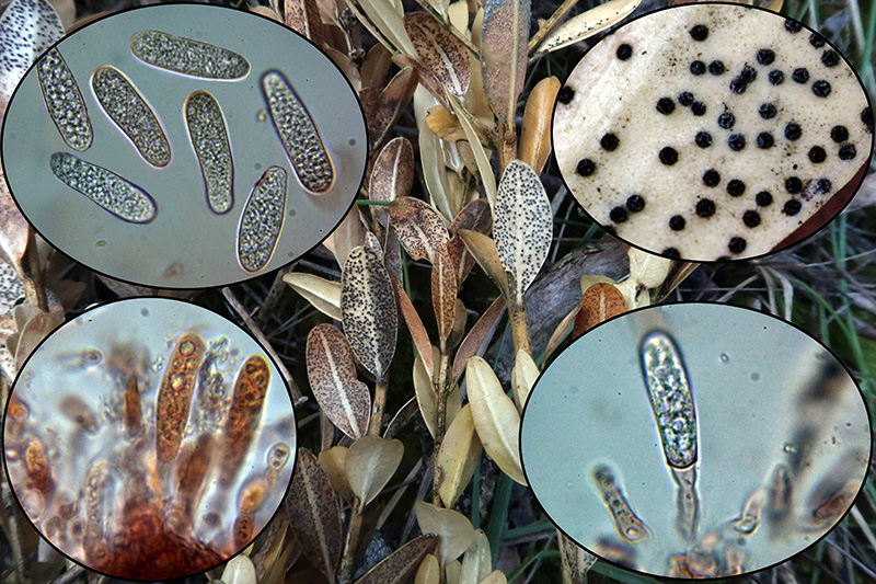 Y sobre hojas de Buxus sempervirens, el anamorfo de la Hyponectria buxi, la Dothiorella candollei