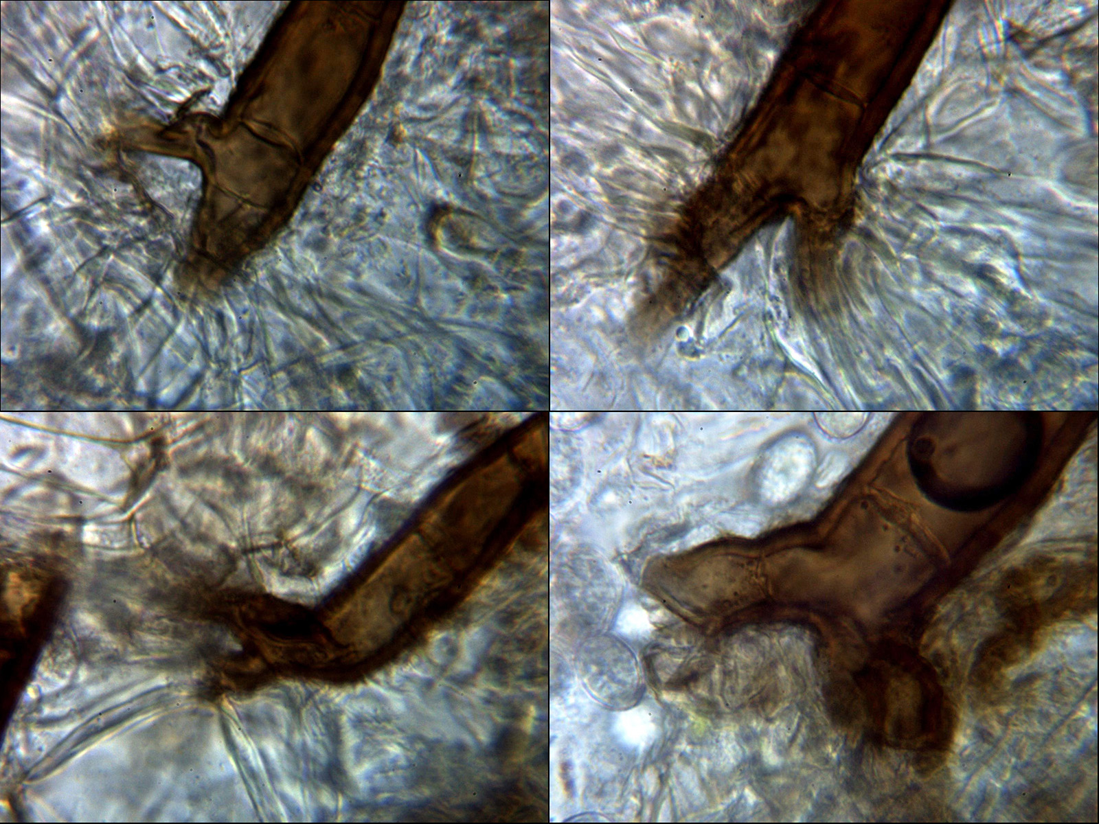 Composición de 4 imágenes de la base de los pelos, entre mono y bifurcados ( he escogido en esta ocasión los bifurcados)