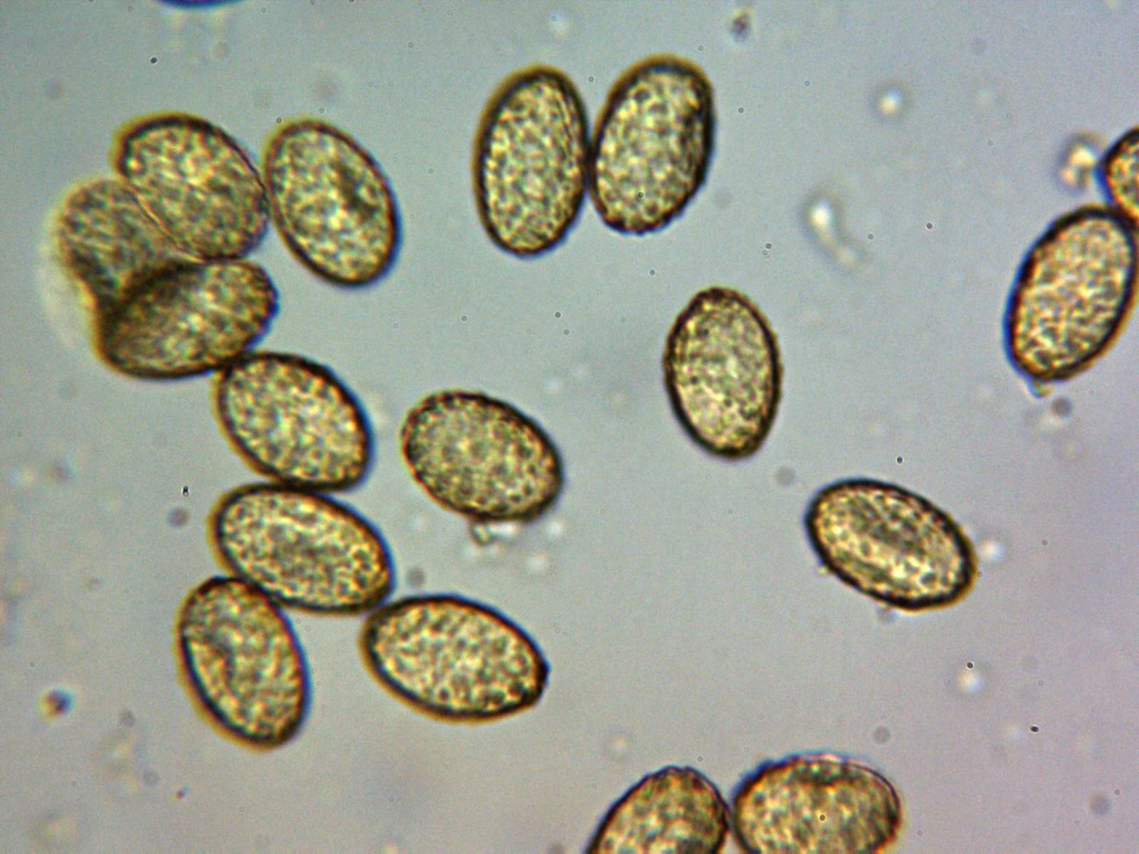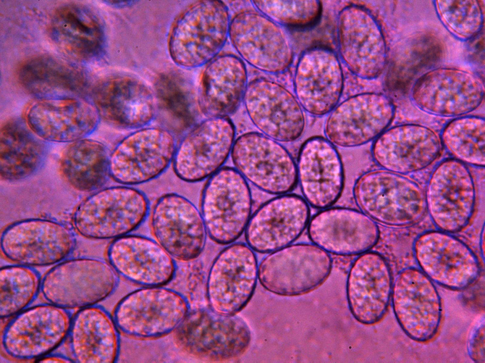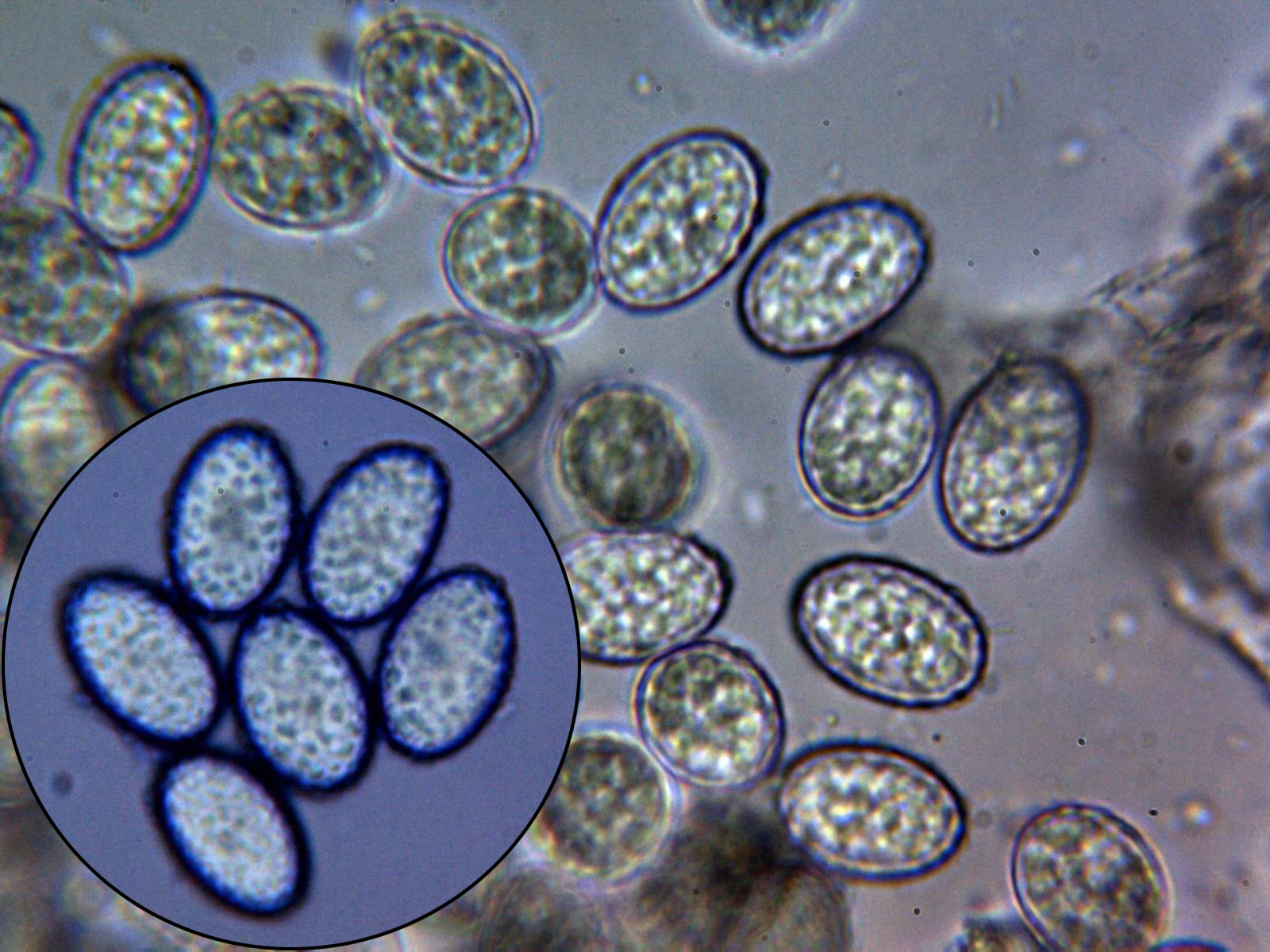 Esporas obtenidas por esporulación natural en agua y en la miniatura en Azul de Cresilo, elipsoidales y multigutuladas: