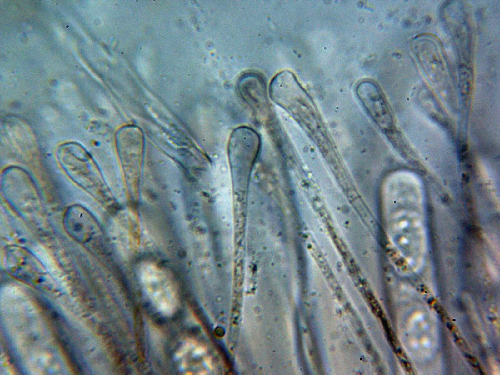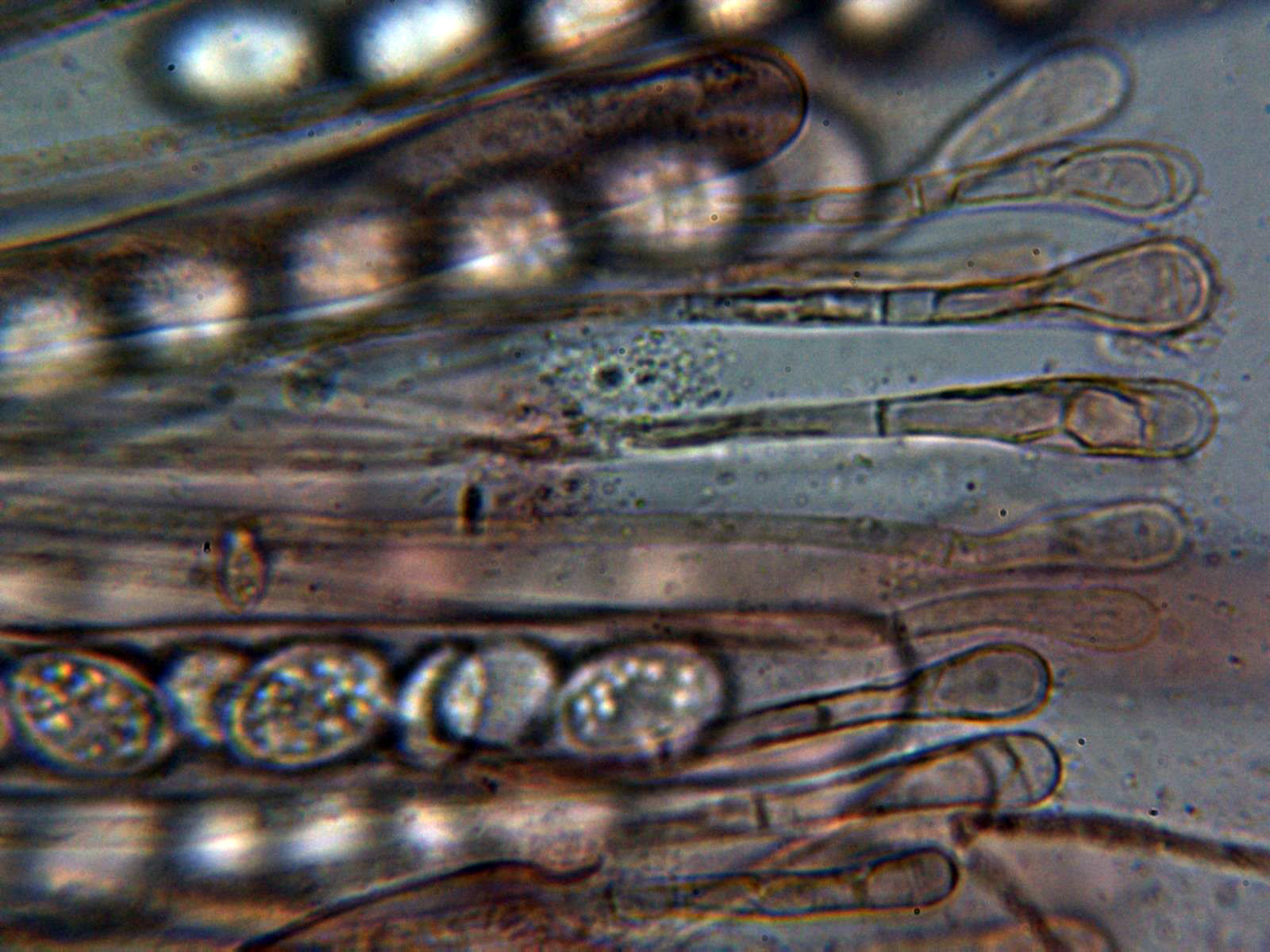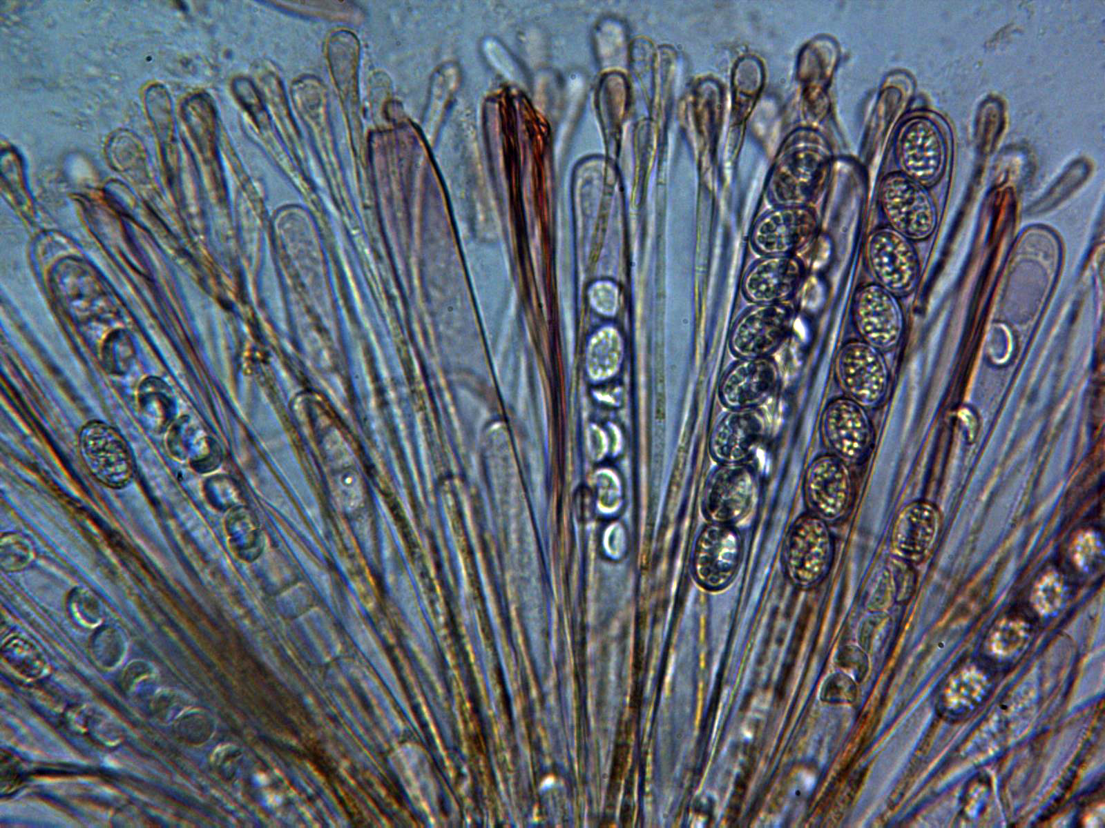 Paráfisis en Rojo Congo diluido, cilíndricas, septadas, con un ensanchamiento muy evidente en el ápice y sobresaliendo ligeramente por encima del nivel de las ascas.