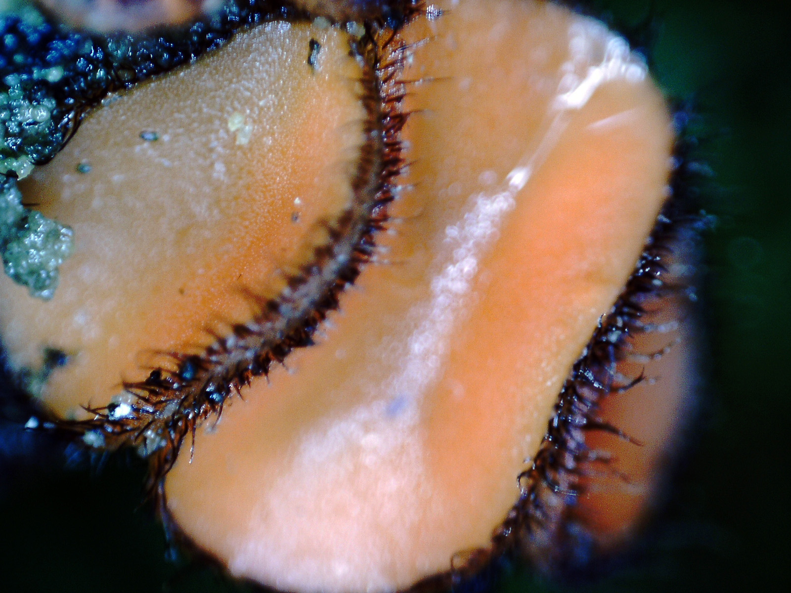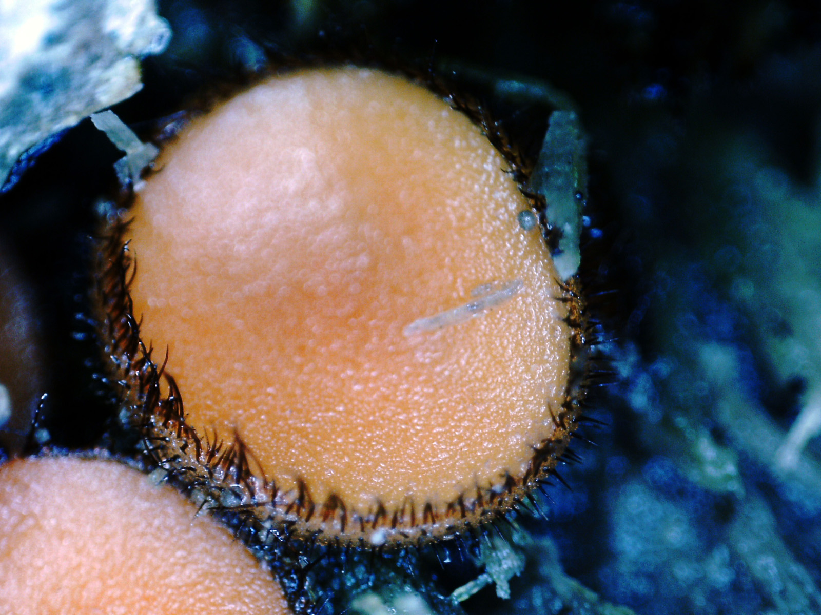 Apotecios sesiles, de color anaranjado, con forma de disco, mas irregular en los ejemplares adultos, de entre 0,5 a 0,8 mm., con el borde cubierto de pelos de color marrón oscuro.