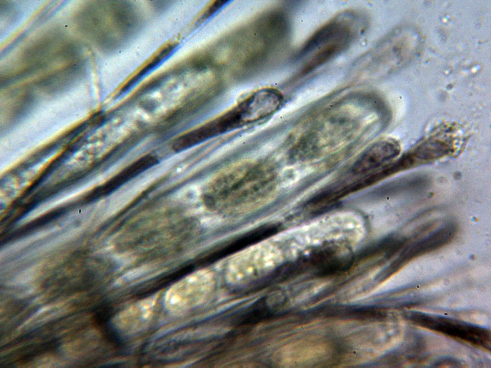 Paráfisis en Reactivo de Melzer, en este caso su contenido de oscurece sensiblemente, no tanto ya en el ápice.
