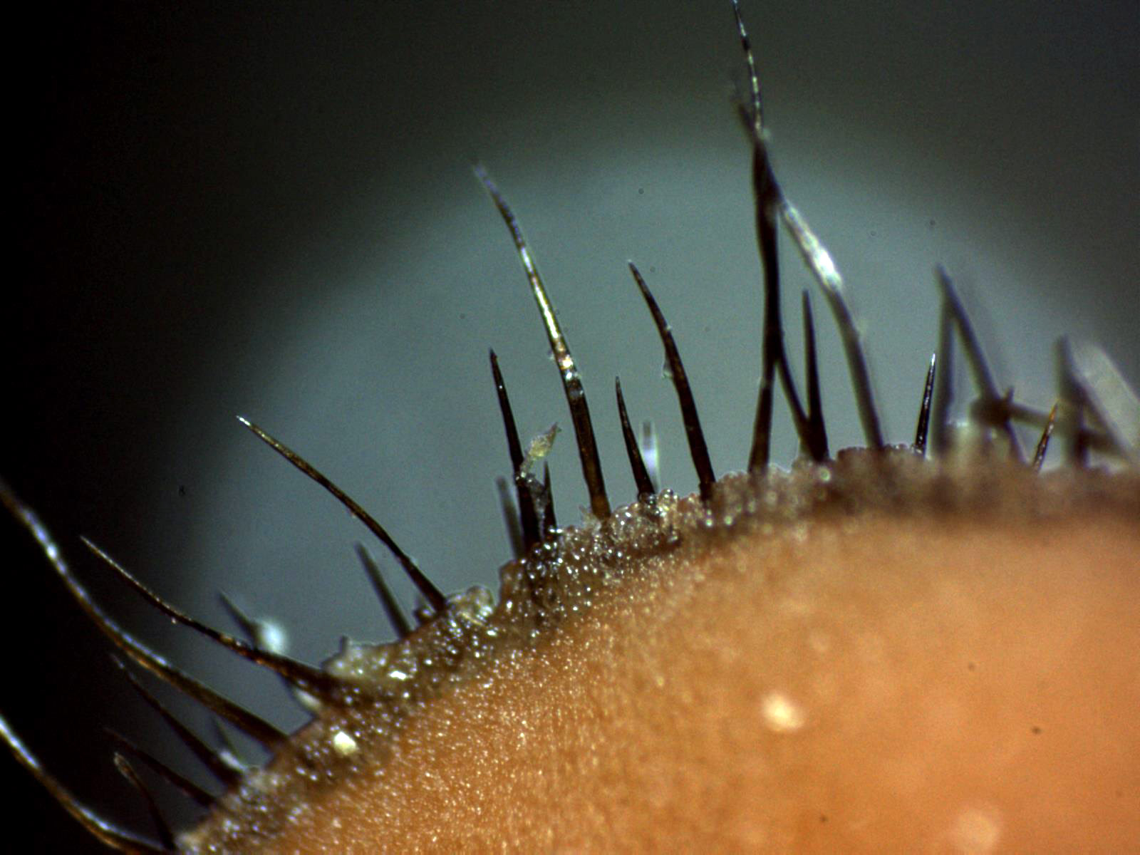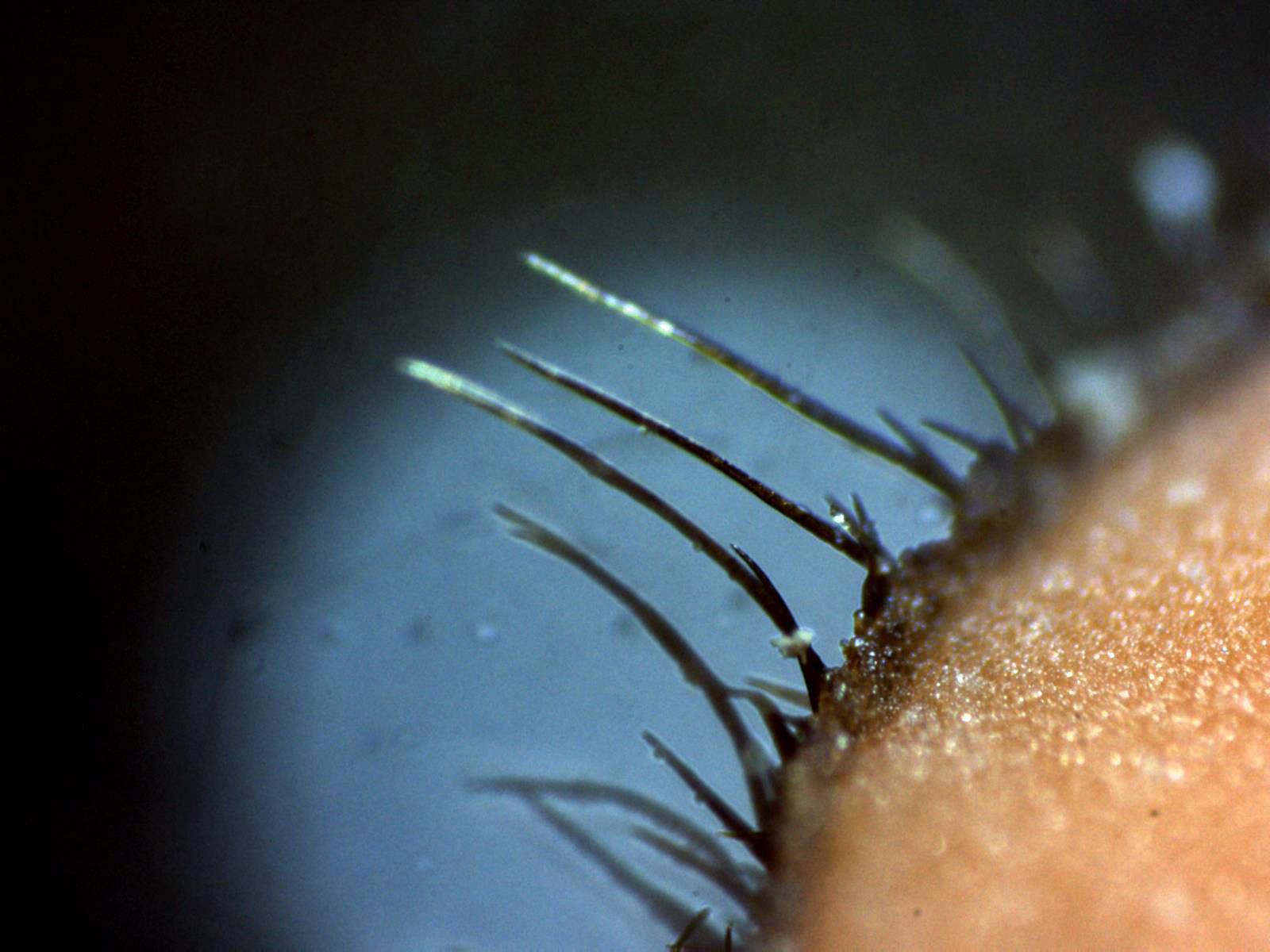Pelos marginales en agua a 40 aumentos, estos pelos sugieren una disposición a 2 alturas, de entre 0,41 y 1,27 mm.