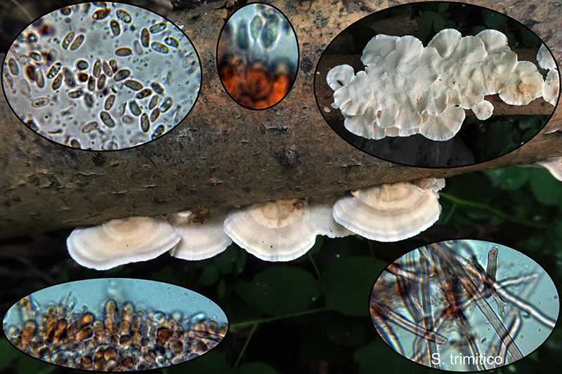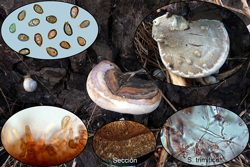 Un Trametes, zonado, con colores crema y esporas de mayor tamaño que las de su hermana la Trametes versicolor, se trata de la Trametes ochracea