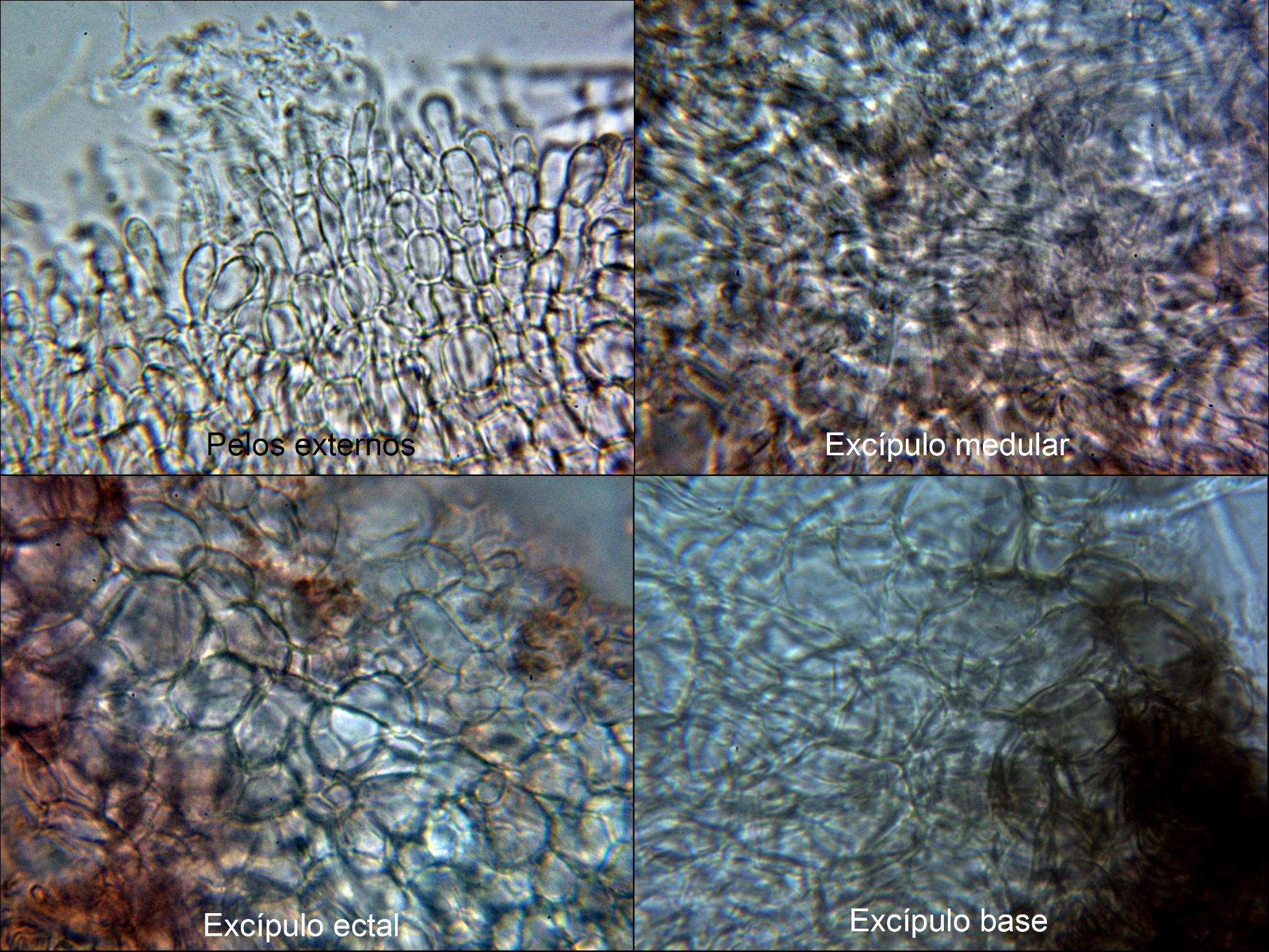 Excípulo ectal con hifas hialinas entre globosas y angulares.