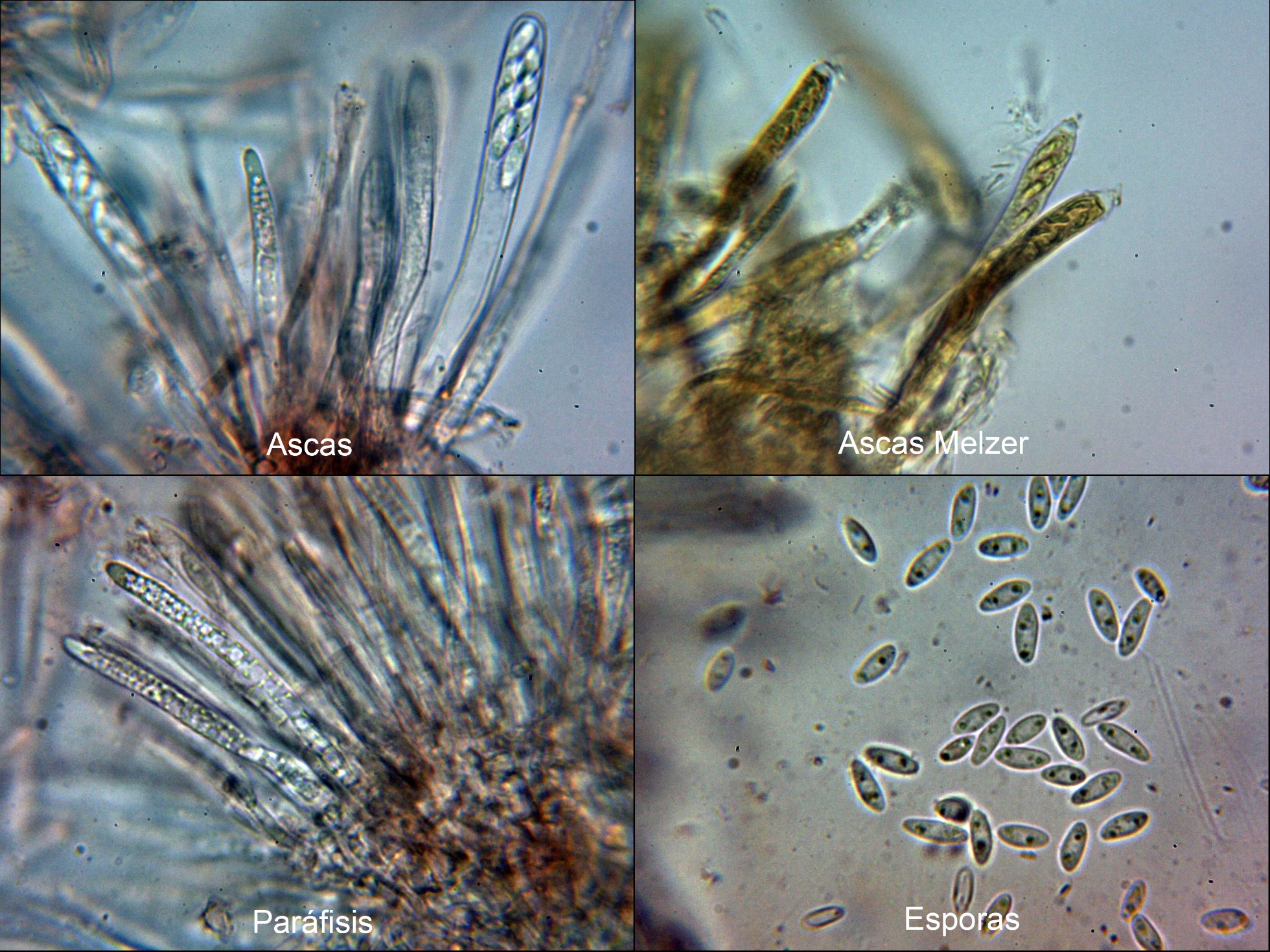 Ascas octospóricas de entre 57.5 a 74.7 × 6.7 a 8.4 µm. sin reacción aparente ni al Melzer, ni al IKI y tampoco al Melzer + KOH, sin croziers observados.