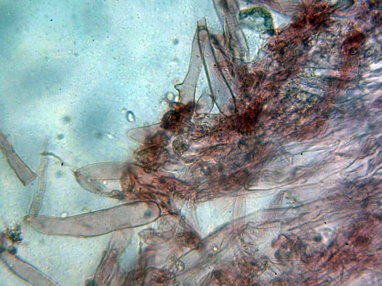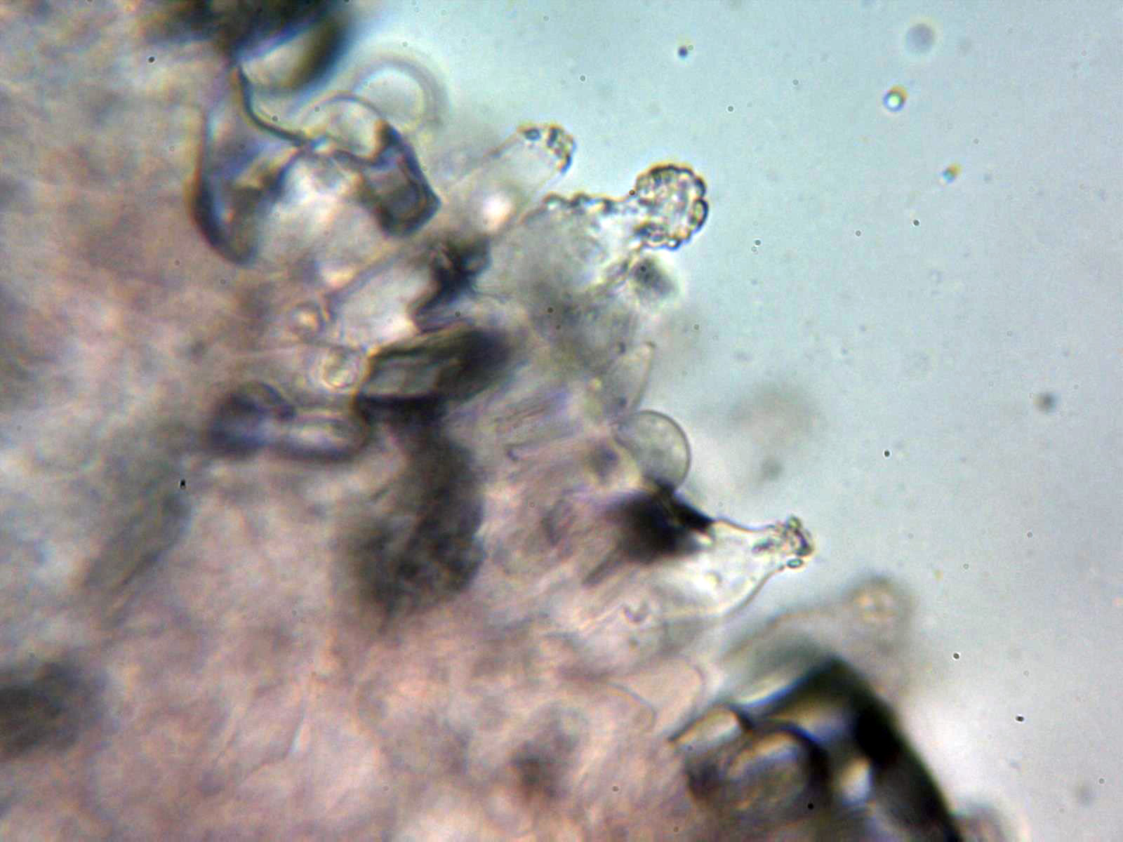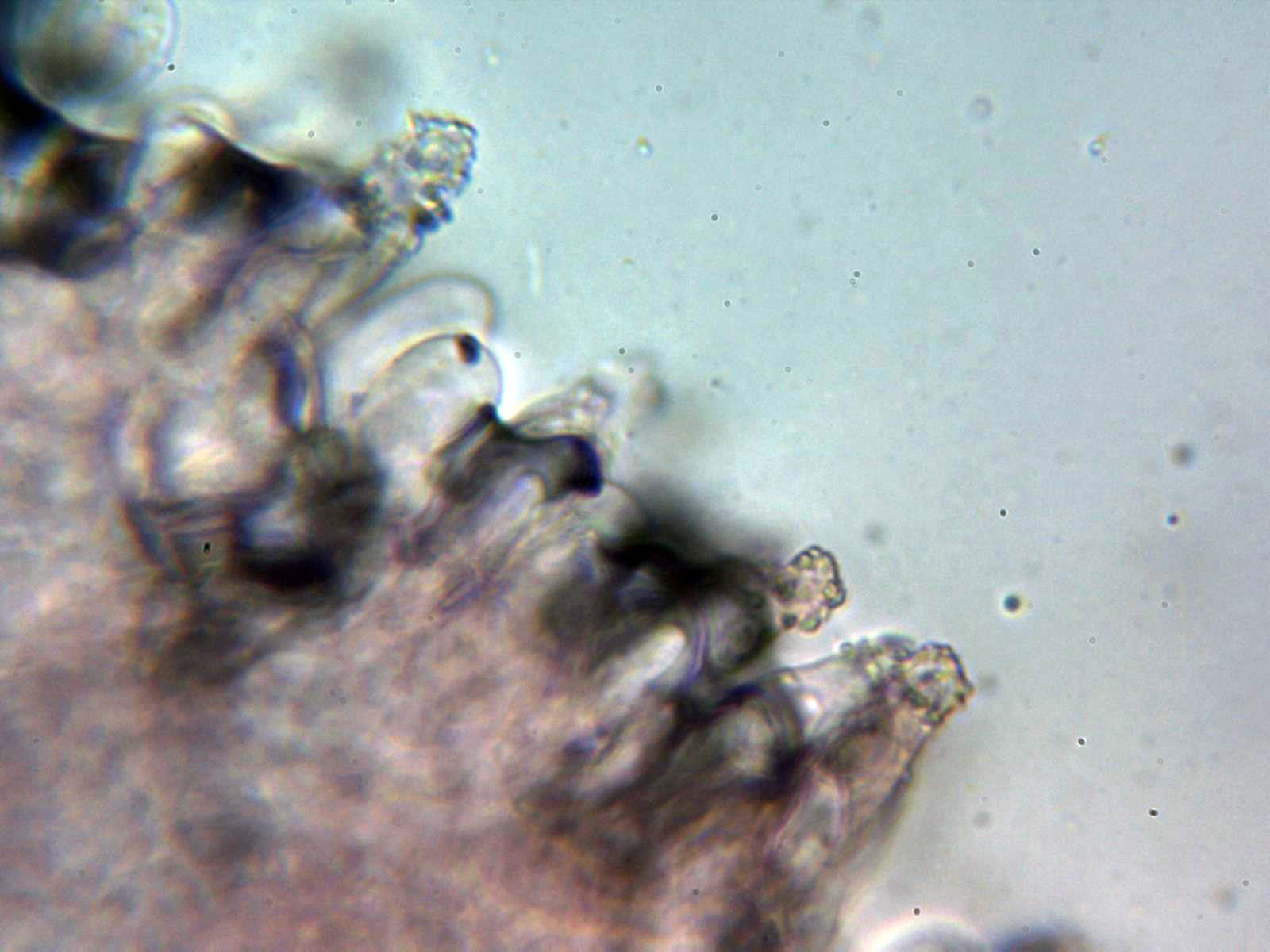 Queilocistidios versiformes, piriformes, cilíndricos, fusiformes, algunos mucronados y la mayoría de ellos con incrustaciones en el ápice que se desprenden fácilmente, también se observa en las muestras una masa amorfa de color negruzco en la arista. Las medidas de los queilocistidios de 24.3 - 35.8 × 8.4 - 10.9 µm. sin fíbulas en su base.