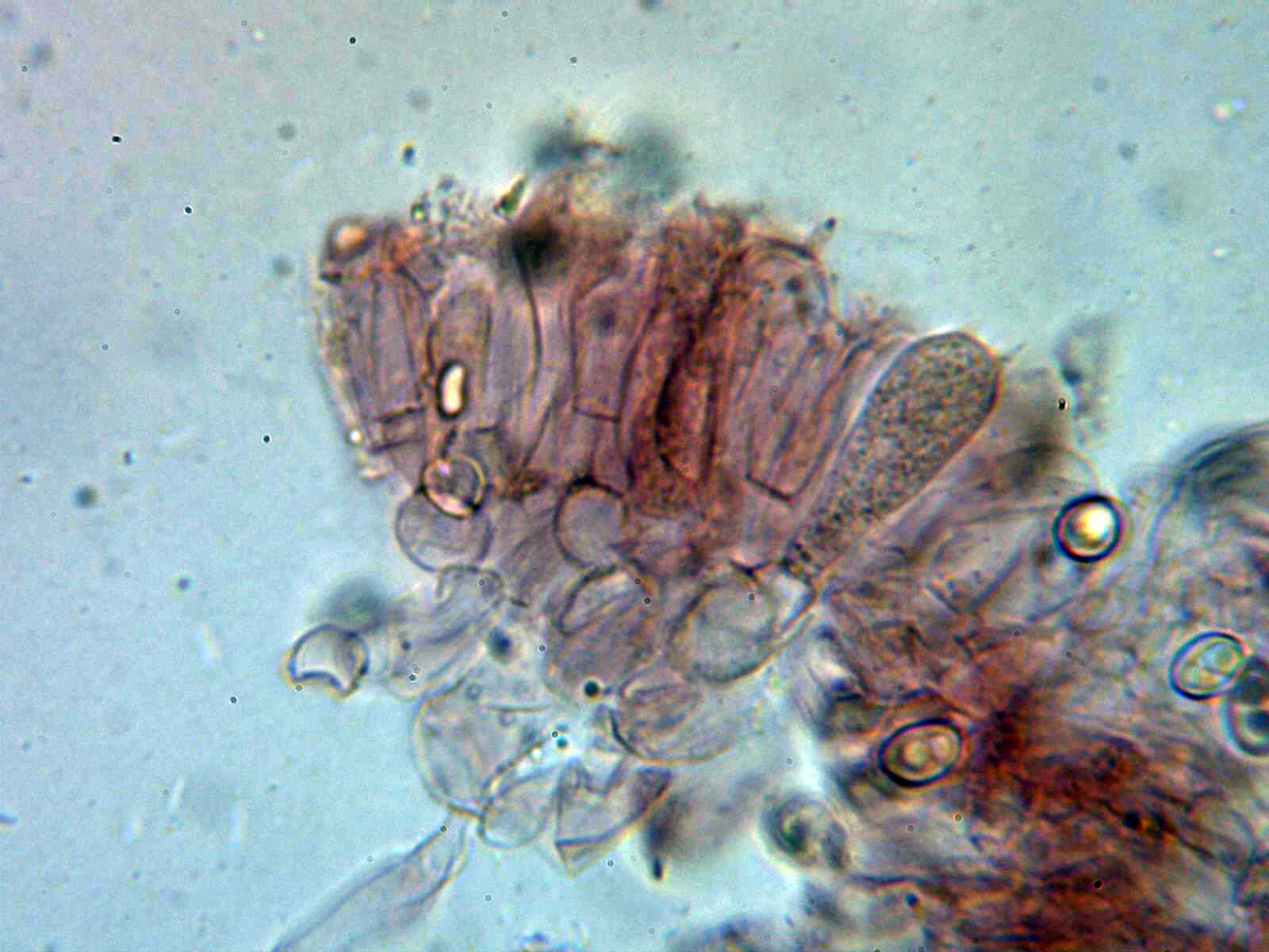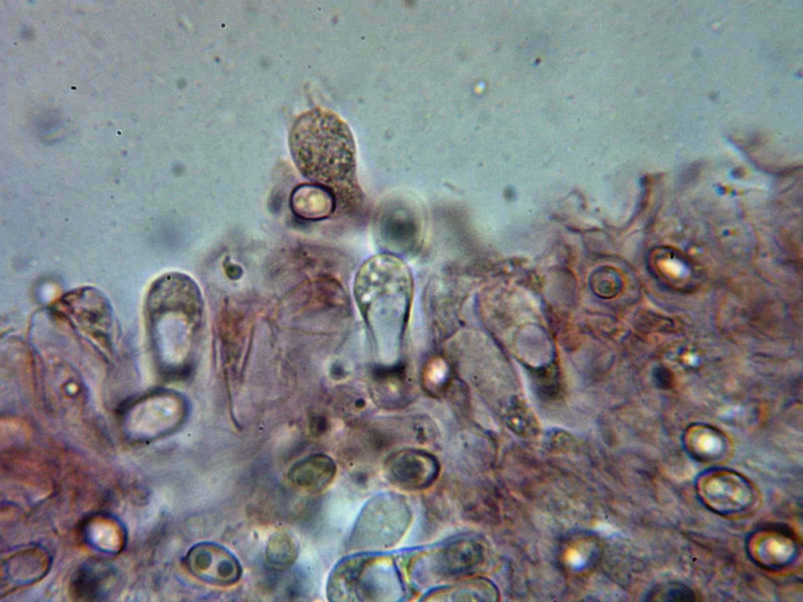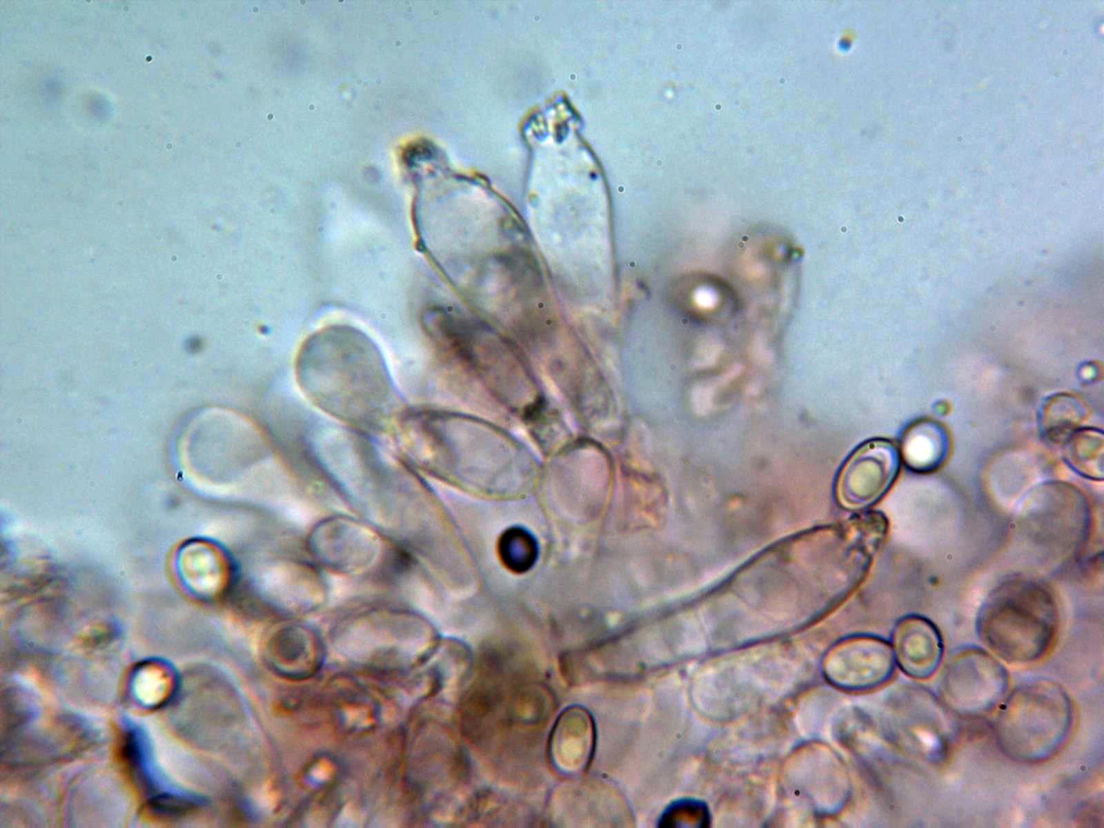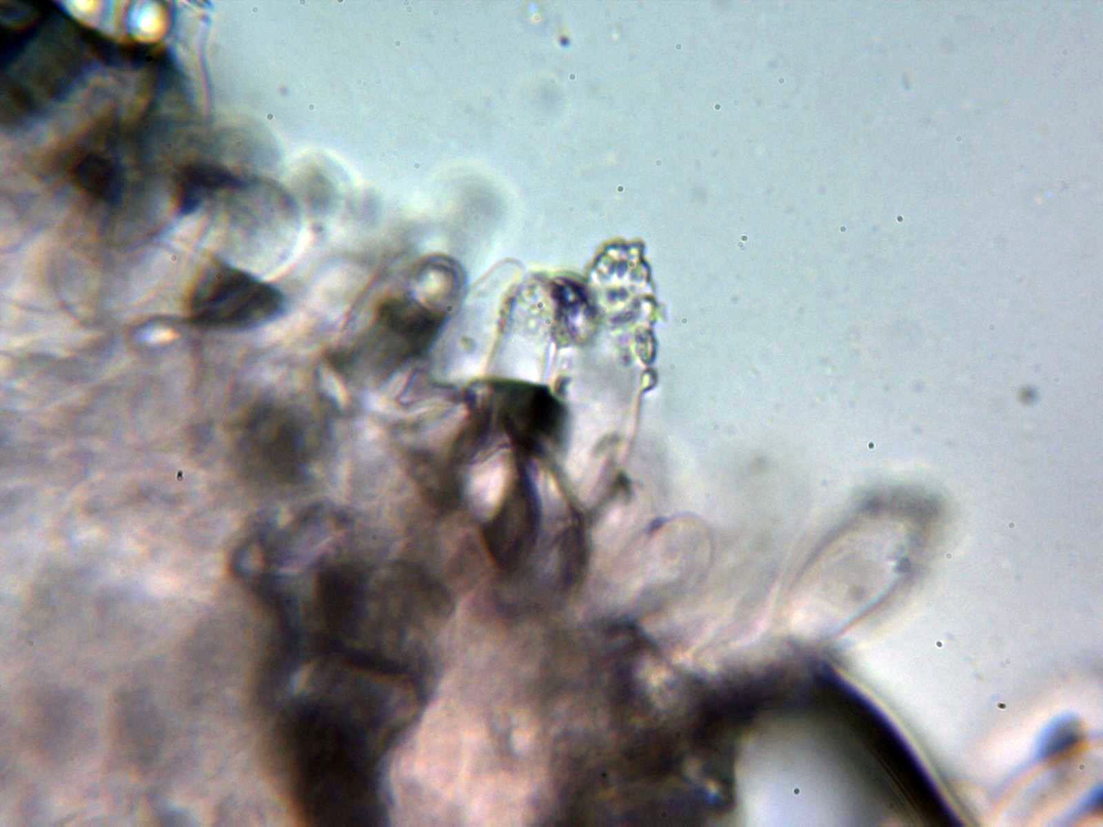 Queilocistidios versiformes, piriformes, cilíndricos, fusiformes, algunos mucronados y la mayoría de ellos con incrustaciones en el ápice que se desprenden fácilmente, también se observa en las muestras una masa amorfa de color negruzco en la arista. Las medidas de los queilocistidios de 24.3 - 35.8 × 8.4 - 10.9 µm. sin fíbulas en su base.