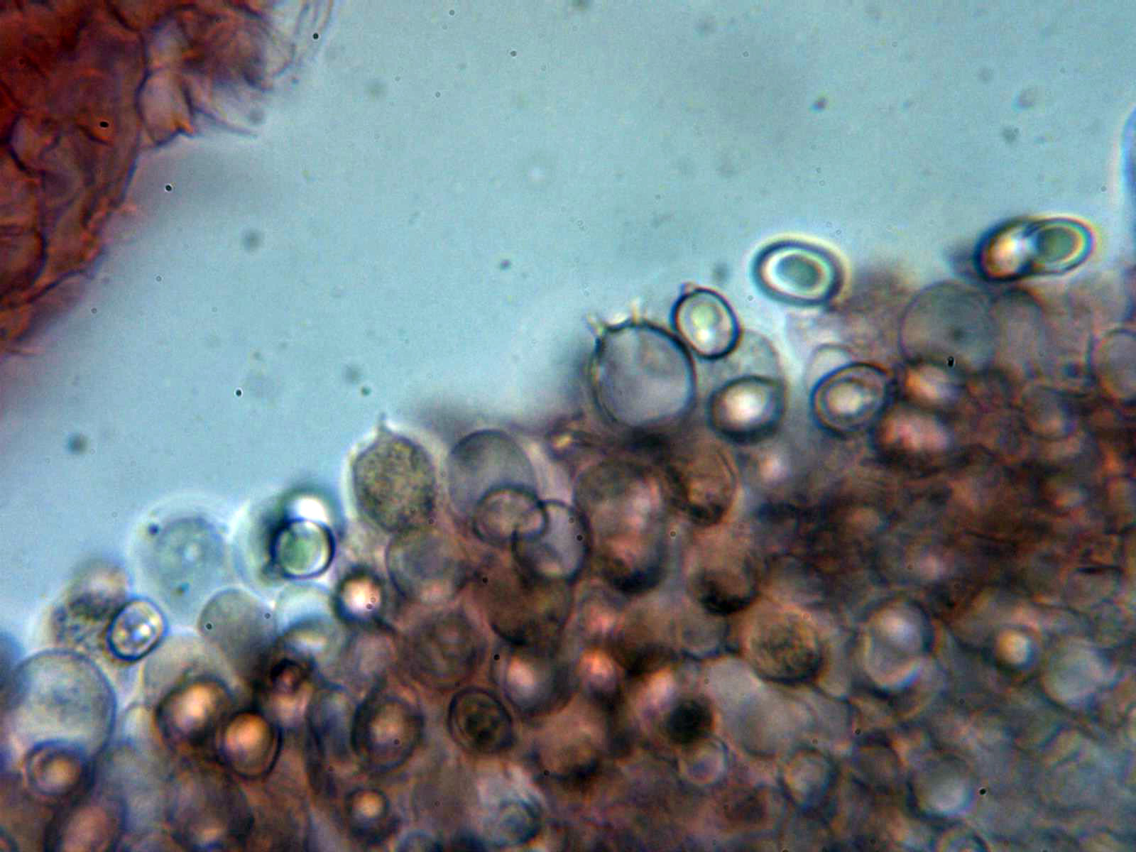 Esporas en agua y en la miniatura en Reactivo de Melzer: