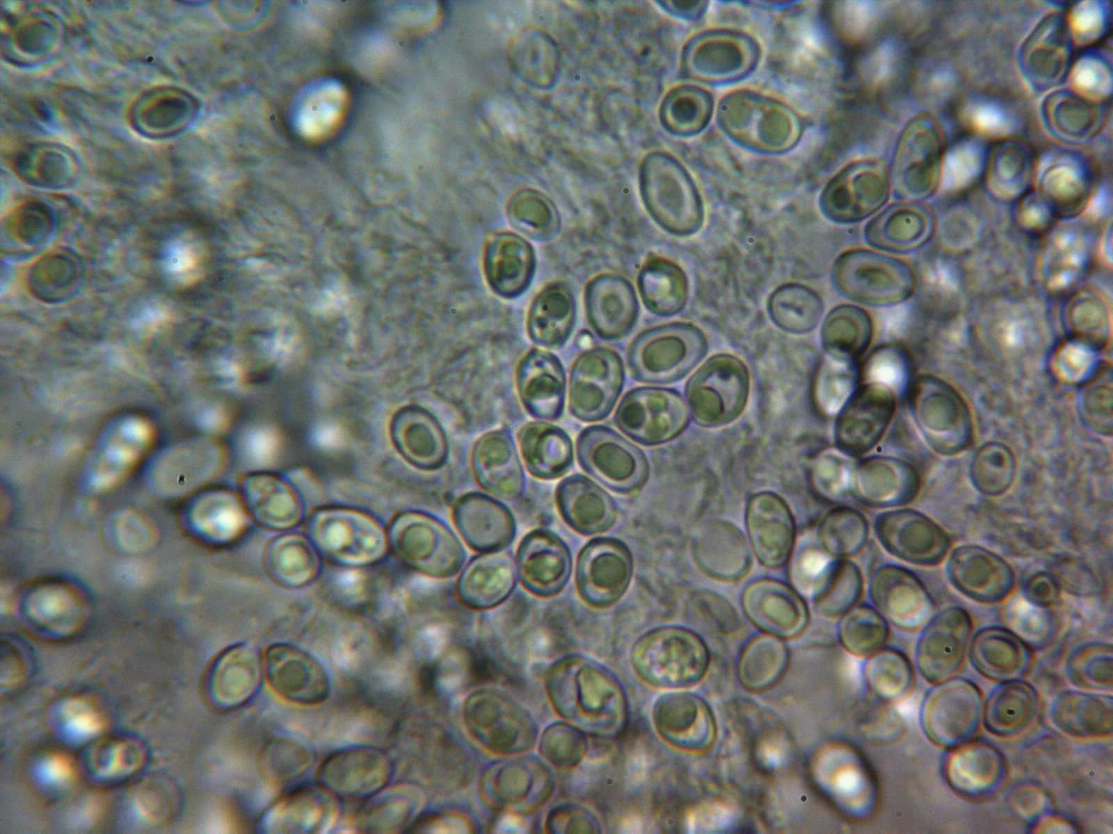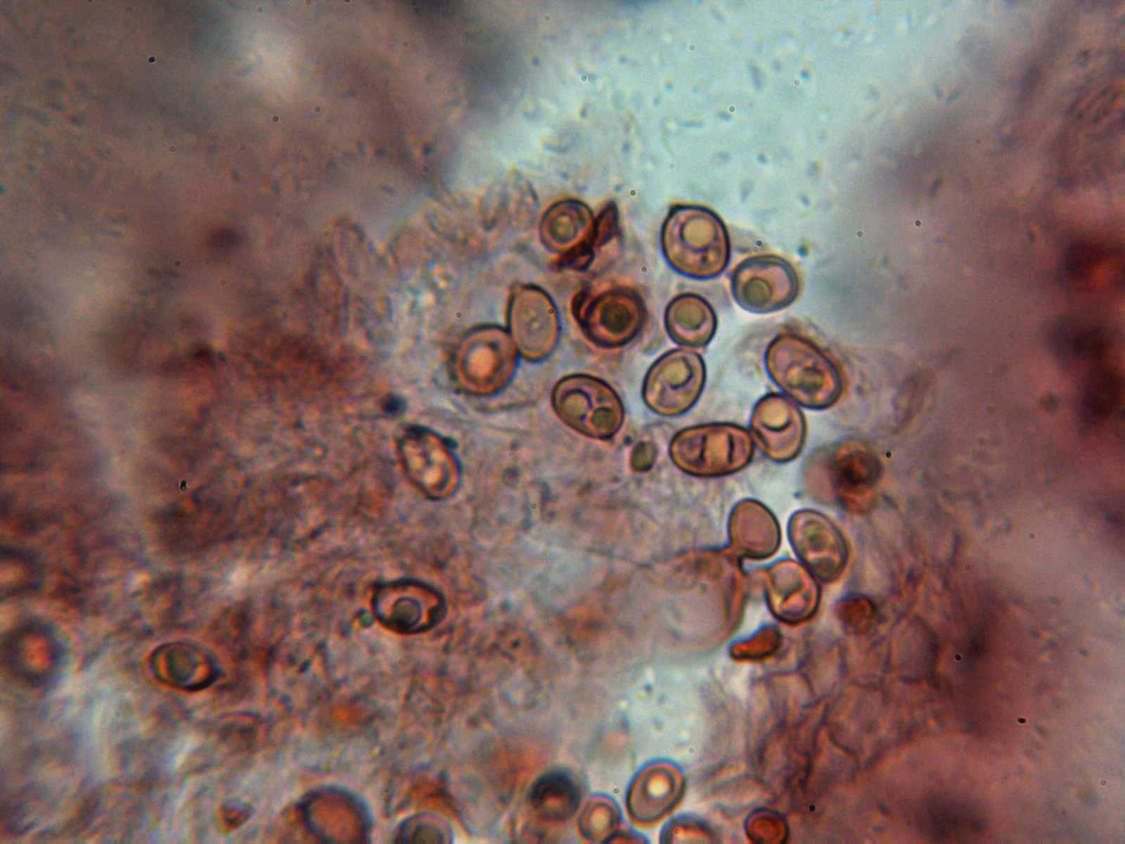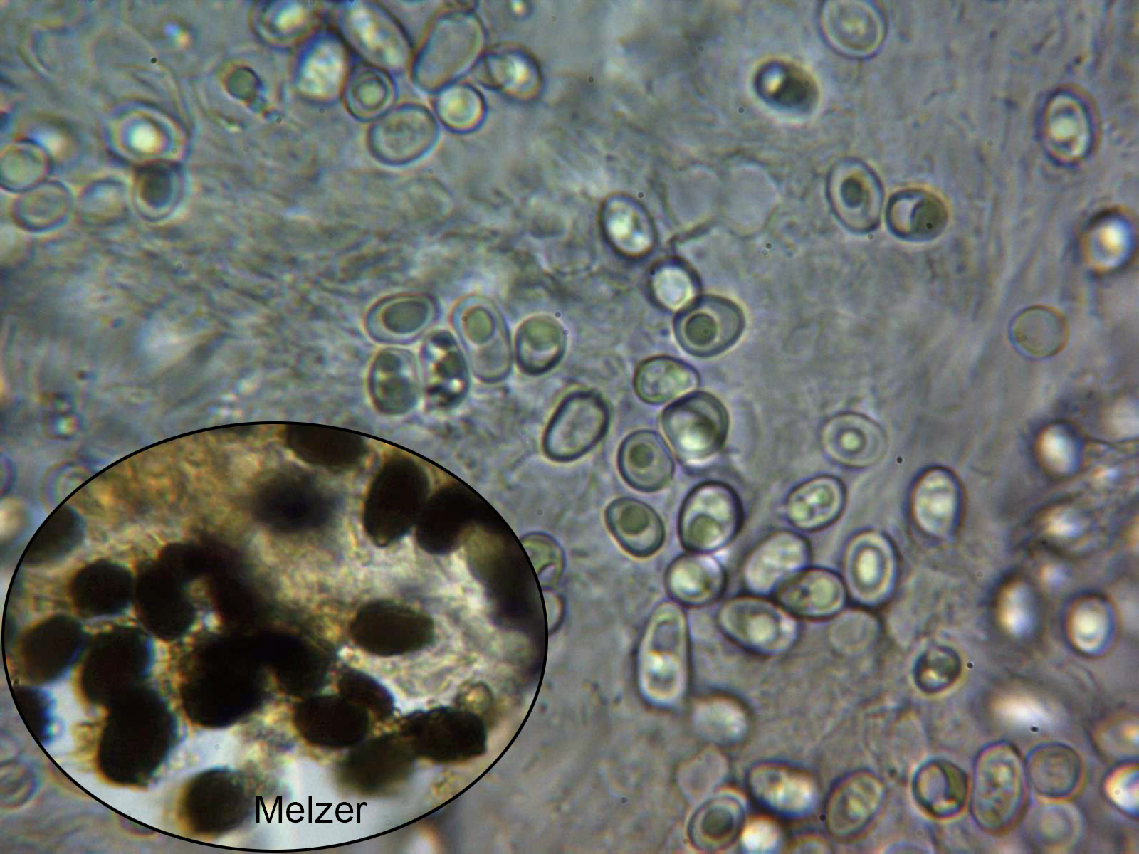 Esporas elipsoidales, con una o más gotas en su interior, discreta apícula lateral, de pared gruesa, congófilas, fuertemente dextrinoides, y unas medidas en agua de: