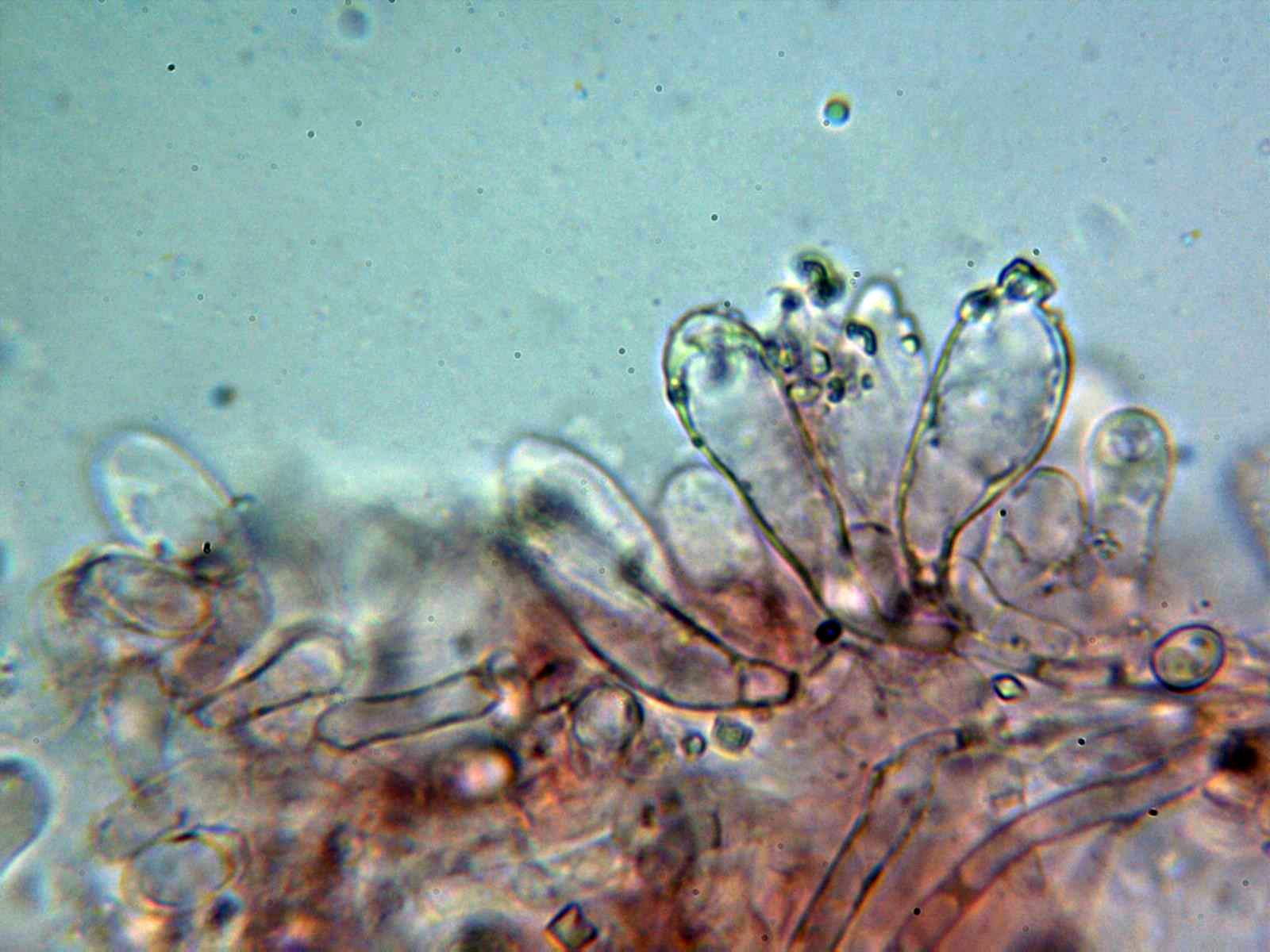 Y 5 imágenes de sus característicos queilocistidios, mayoritariamente con cristalizaciones agrupadas en el ápice.
