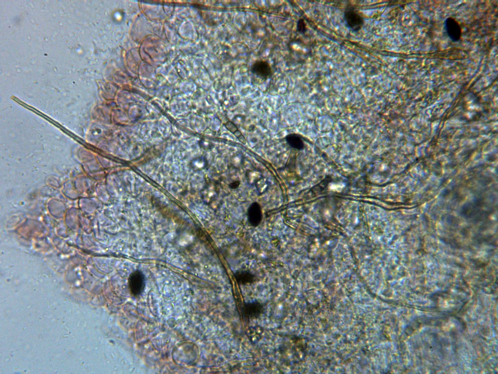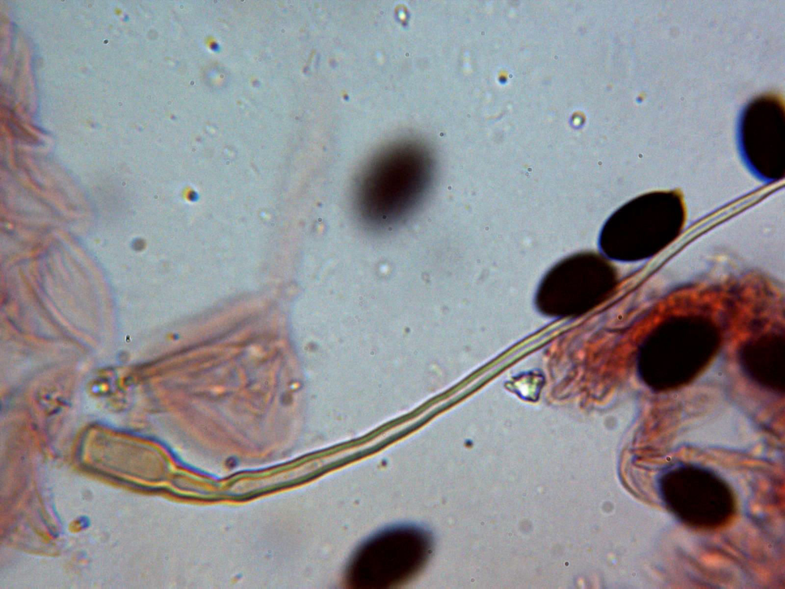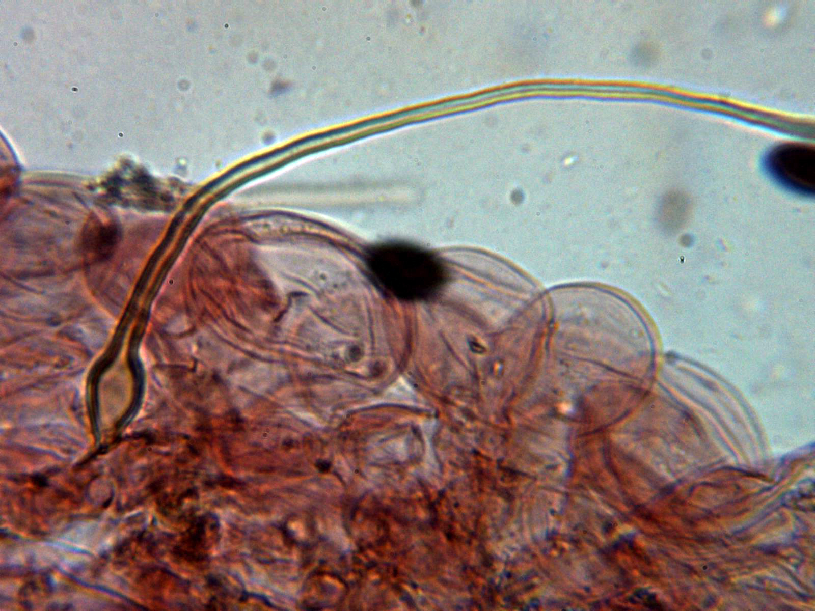 Unas imágenes de los pelos (crines) de la pileipellis, de grandes dimensiones, de pared gruesa y sin septos: