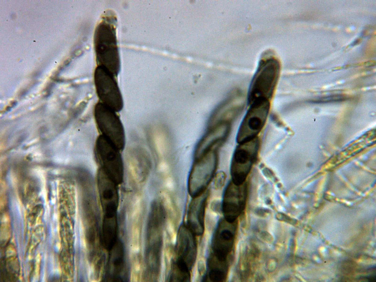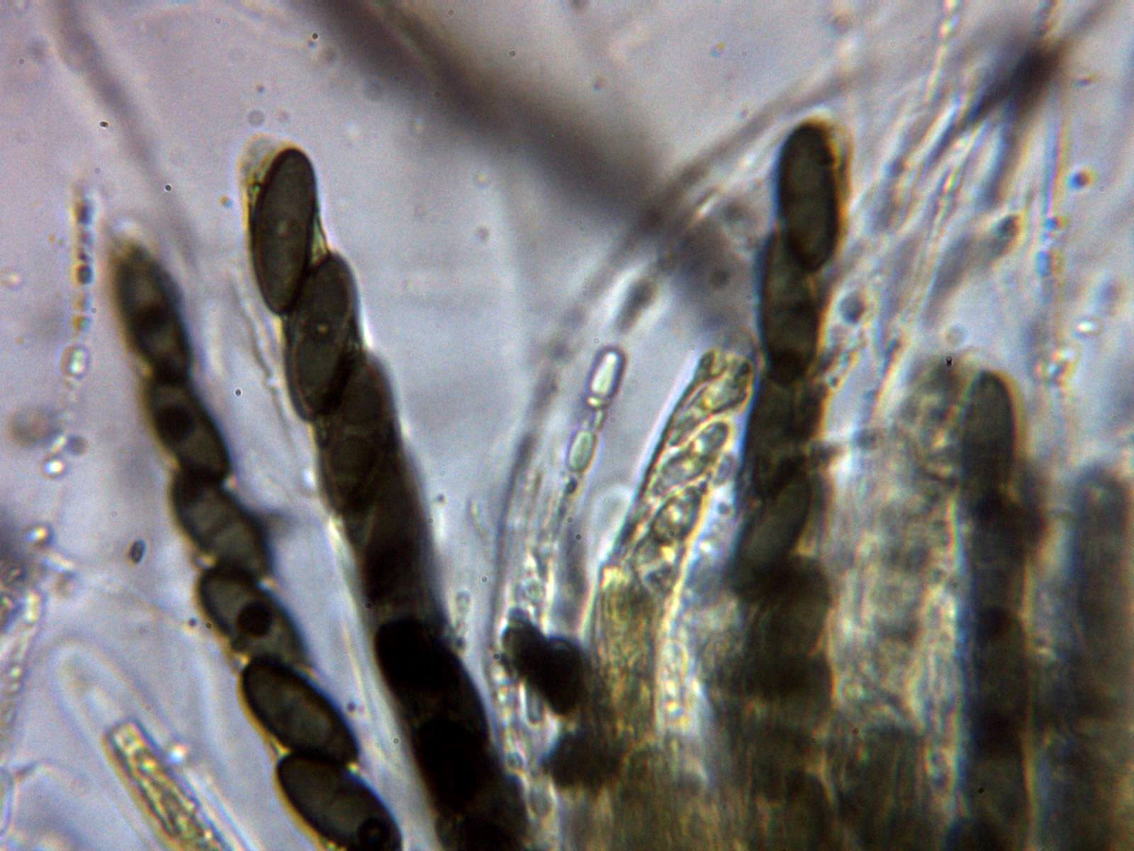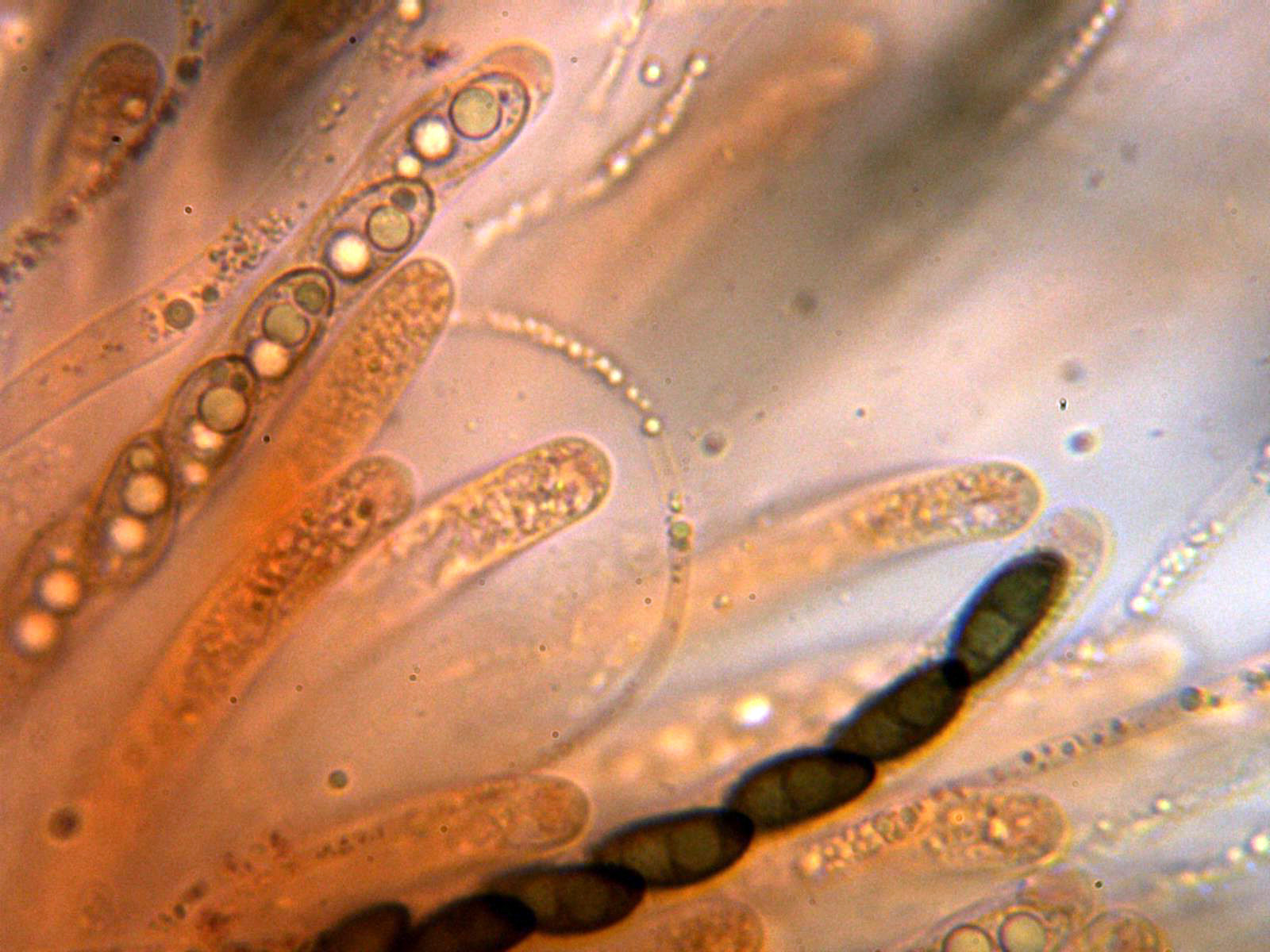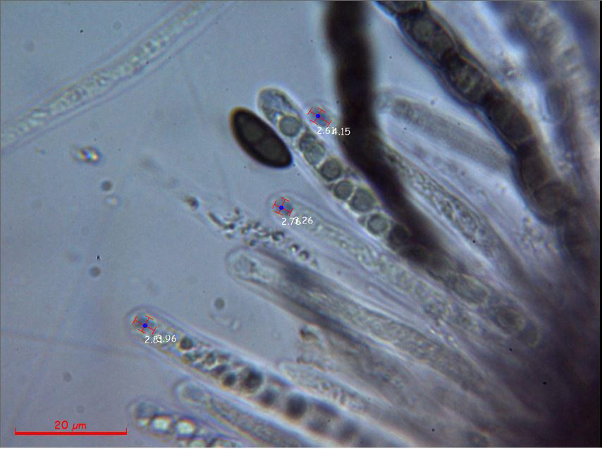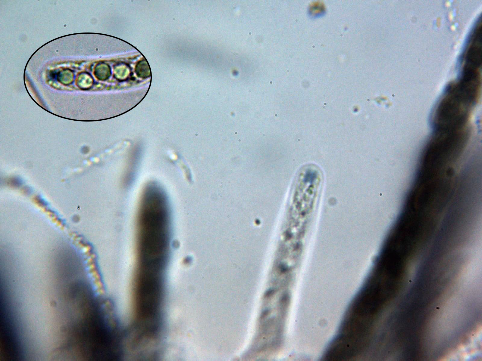La Nemania aenea var. aureolutea se distingue de la especie tipo por no reaccionar el aparato apical al Melzer, un par de imágenes de las ascas en solución de Reactivo de Melzer: